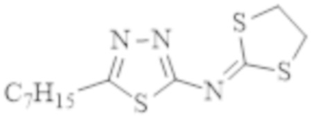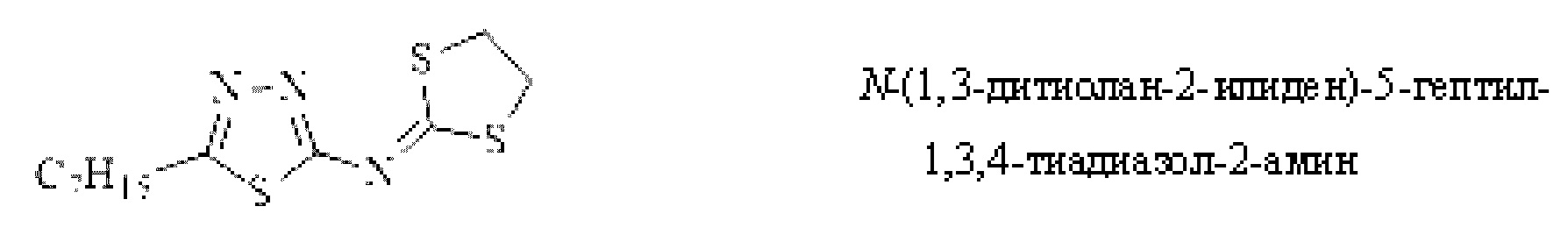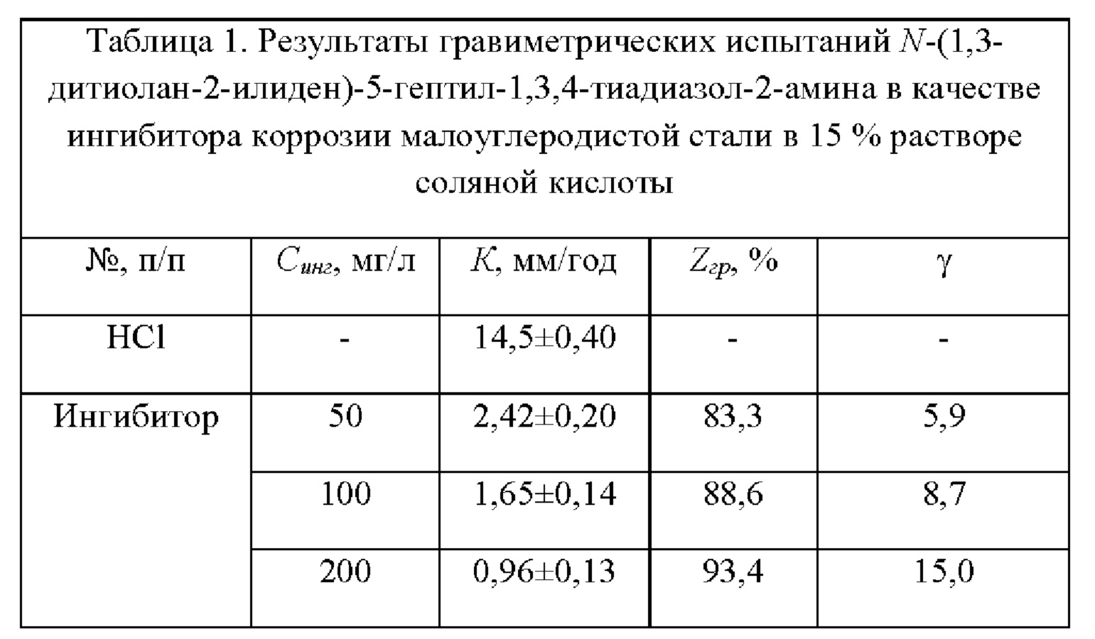 Изобретение относится к использованию N-(1,3-дитиолан-2-илиден)-5-гептил-1,3,4-тиадиазол-2-амина, имеющего формулу в качестве ингибитора коррозии малоуглеродистой стали в 15% растворе соляной кислоты для защиты от коррозии газо- и нефтепромыслового оборудования при кислотных обработках, травлении металлов и удалении окалины. Суть изобретения заключается в том, что N-(1,3-дитиолан-2-илиден)-5-гептил-1,3,4-тиадиазол-2-амин проявляет защитный эффект (80-93%) на стали Ст3 (ГОСТ 380-2005) в диапазоне концентраций 50-200 мг/л в 15% водном растворе HCl. 1 табл., 2 пр.