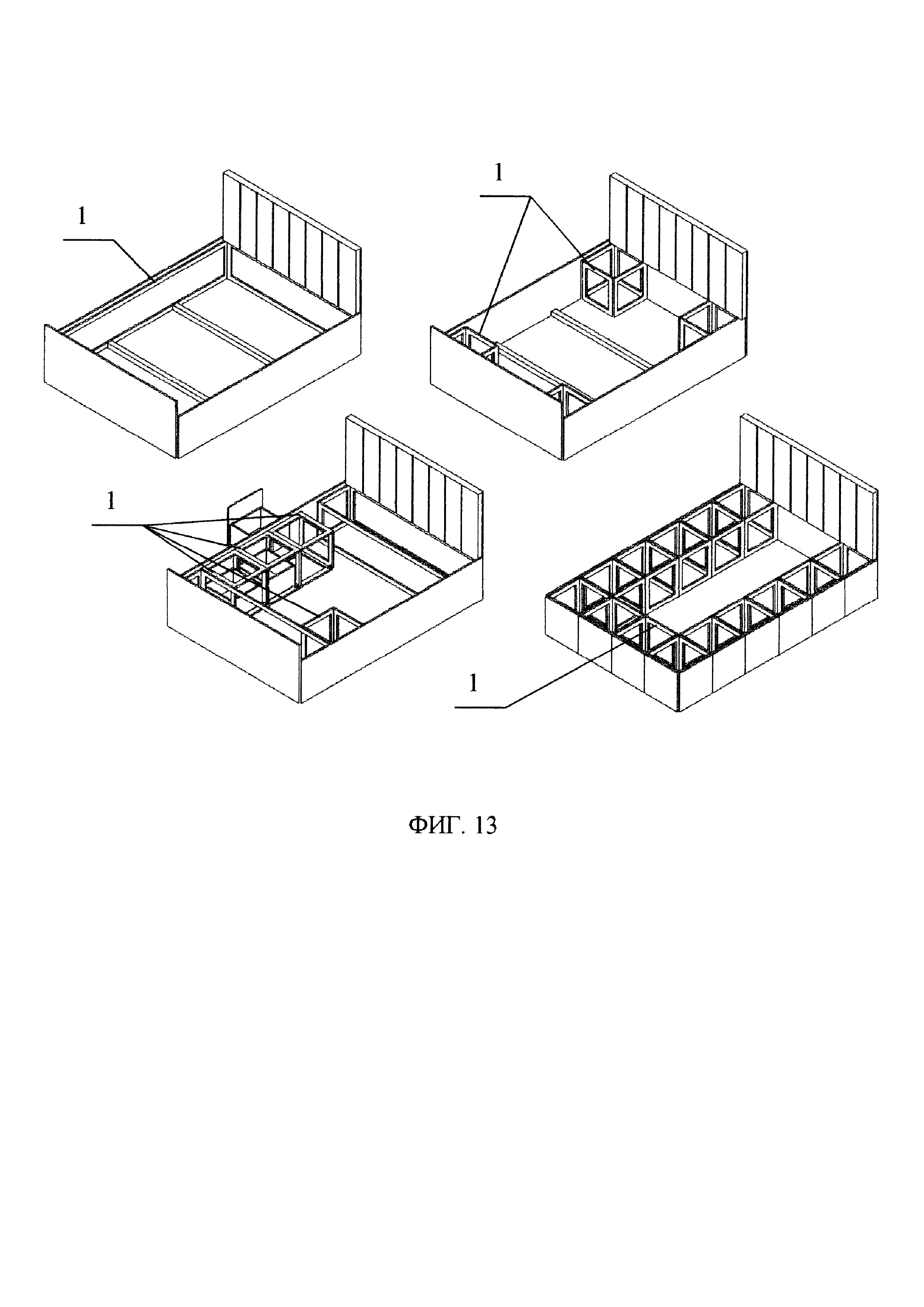 Заявленное техническое решение относится к удовлетворению жизненных потребностей человека, а именно к модульной мебели, состоящей из элементов, унифицированных для образования различных видов предметов обстановки жилых и общественных помещений. Мебельный модуль образован двумя противоположно расположенными конструктивными элементами, а также верхней частью и нижней частью, установленными на противоположных концах конструктивных элементов, посредством чего модуль образует несущую конструкцию. Противоположные конструктивные элементы, а также верхняя и нижняя части выполнены с монтажными отверстиями, расположенными на одинаковом расстоянии друг от друга и предназначенными для прикрепления дополнительных элементов. Противоположно расположенные конструктивные элементы, а также верхняя и нижняя части модуля являются базовыми элементами, выполненными в виде рамок. Монтажные отверстия выполнены сквозными и расположены равномерно в плоскости рамки по периметру ее контура на одинаковом расстоянии от ее краев. Имеются дополнительные сквозные монтажные отверстия, расположенные по углам рамки и находящиеся в точках пересечения линий расположения основных монтажных отверстий. Две рамки, расположенные друг напротив друга, оснащены крепежными отверстиями, расположенными в плоскости рамки на определенном расстоянии от ее края, равном половине ее толщины. Две другие рамки, также расположенные друг напротив друга, тоже оснащены крепежными отверстиями, расположенными на двух противоположных торцах в центре толщины стенки рамки, причем эти крепежные отверстия выполнены с возможностью сопряжения с крепежными отверстиями двух первых рамок. Технический результат заключается в создании универсальных и унифицированных облегченных и упрощенных мебельных модулей для использования в производстве мебели и предметах интерьера. 9 з.п. ф-лы, 14 ил.