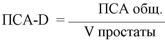 Способ диагностики рака предстательной железы у пациентов после аденомэктомии путем проведения УЗИ предстательной железы, отличающийся тем, что проводят измерение линейных размеров резецированной предстательной железы вместе с полостью предпузыря и вычисляют ее объем по формуле: Vпростаты целиком = А х В х С х 0,523, где А – продольный размер предстательной железы, см, В – передне-задний размер предстательной железы, см, С – ширина предстательной железы, см, 0,523 – поправочный коэффициент; затем проводят измерение линейных размеров полости предпузыря и вычисляют ее объем по формуле: Vпредпузыря = a х b х c х 0,523, где а – продольный размер предпузыря, см, b – передне-задний размер предпузыря, см, с – ширина предпузыря, см, 0,523 – поправочный коэффициент; на основании проведенных измерений вычисляют остаточный объем резецированной предстательной железы (V резецированной простаты): Vрезецированной простаты = Vпростаты целиком –Vпредпузыря; затем проводят определение общего простатического специфического антигена (ПСА общ.) в нг/мл и определяют его плотность (ПСА-D) в объеме резецированной простаты по формуле: ПСА-D = ПСА общ /V резецированной простаты; при значении ПСА - D до 0,151 нг/мл/см3 диагностируют норму, при значении ПСА- D 0,151 нг/мл/см3 и более диагностируют рак простаты.