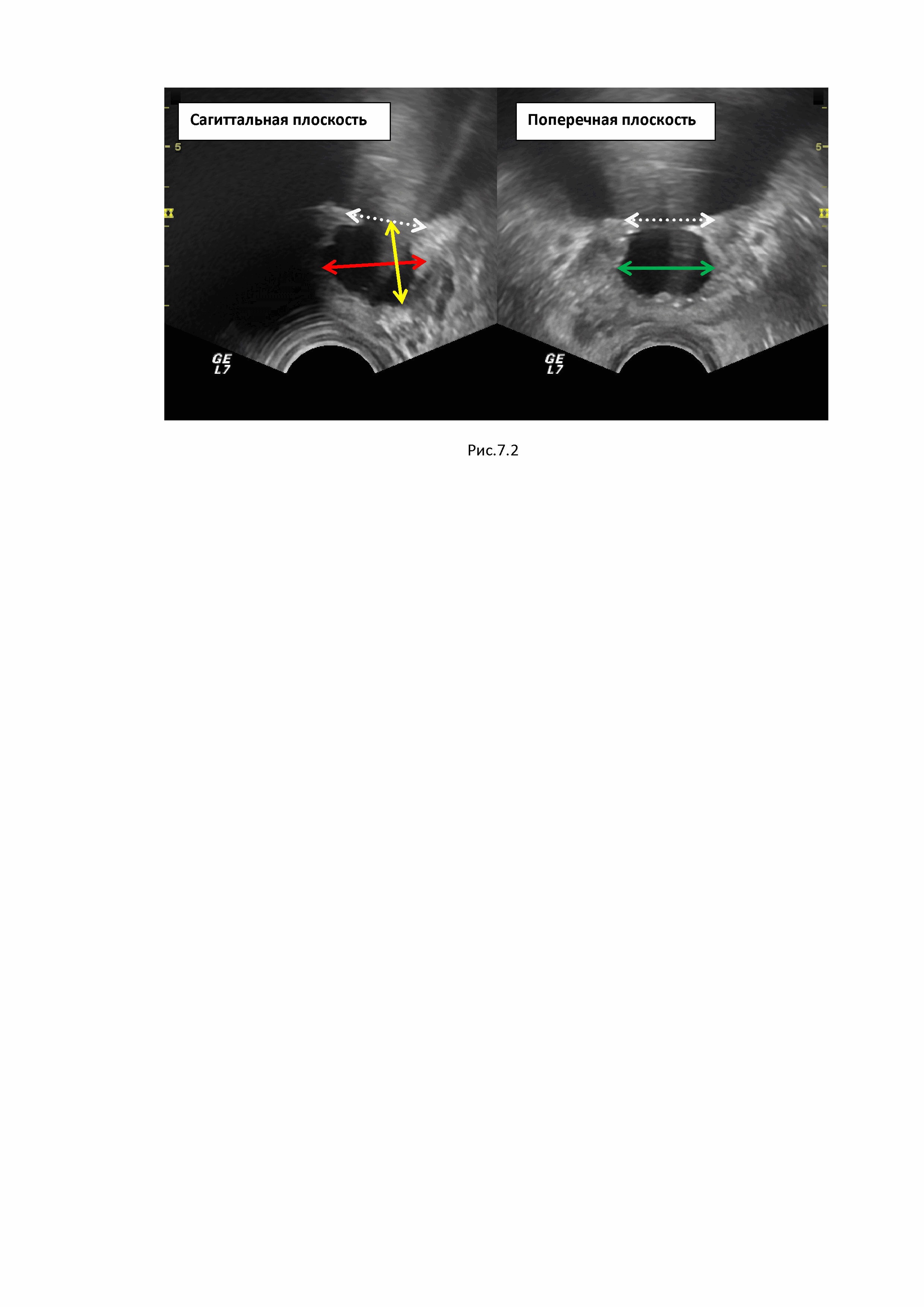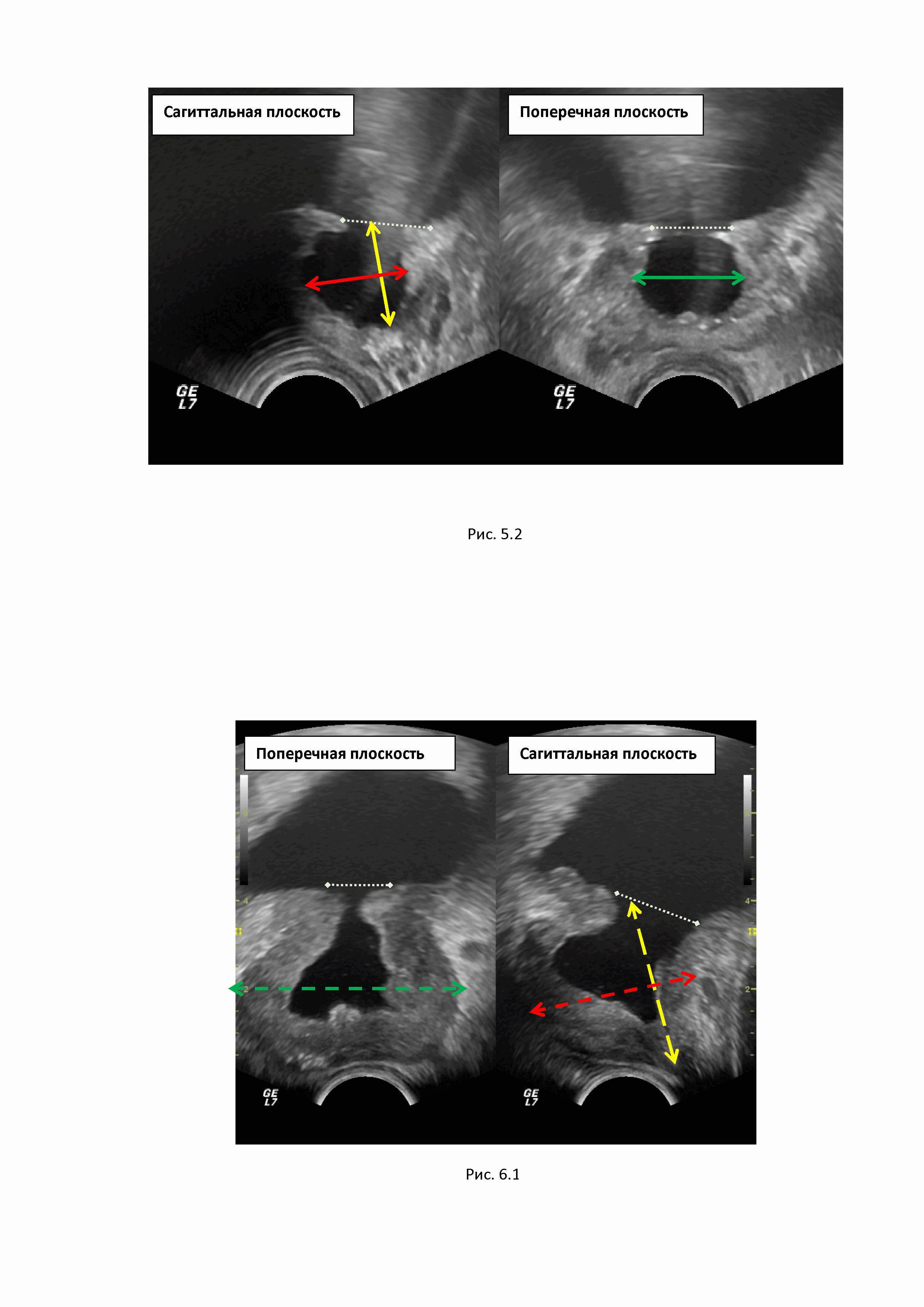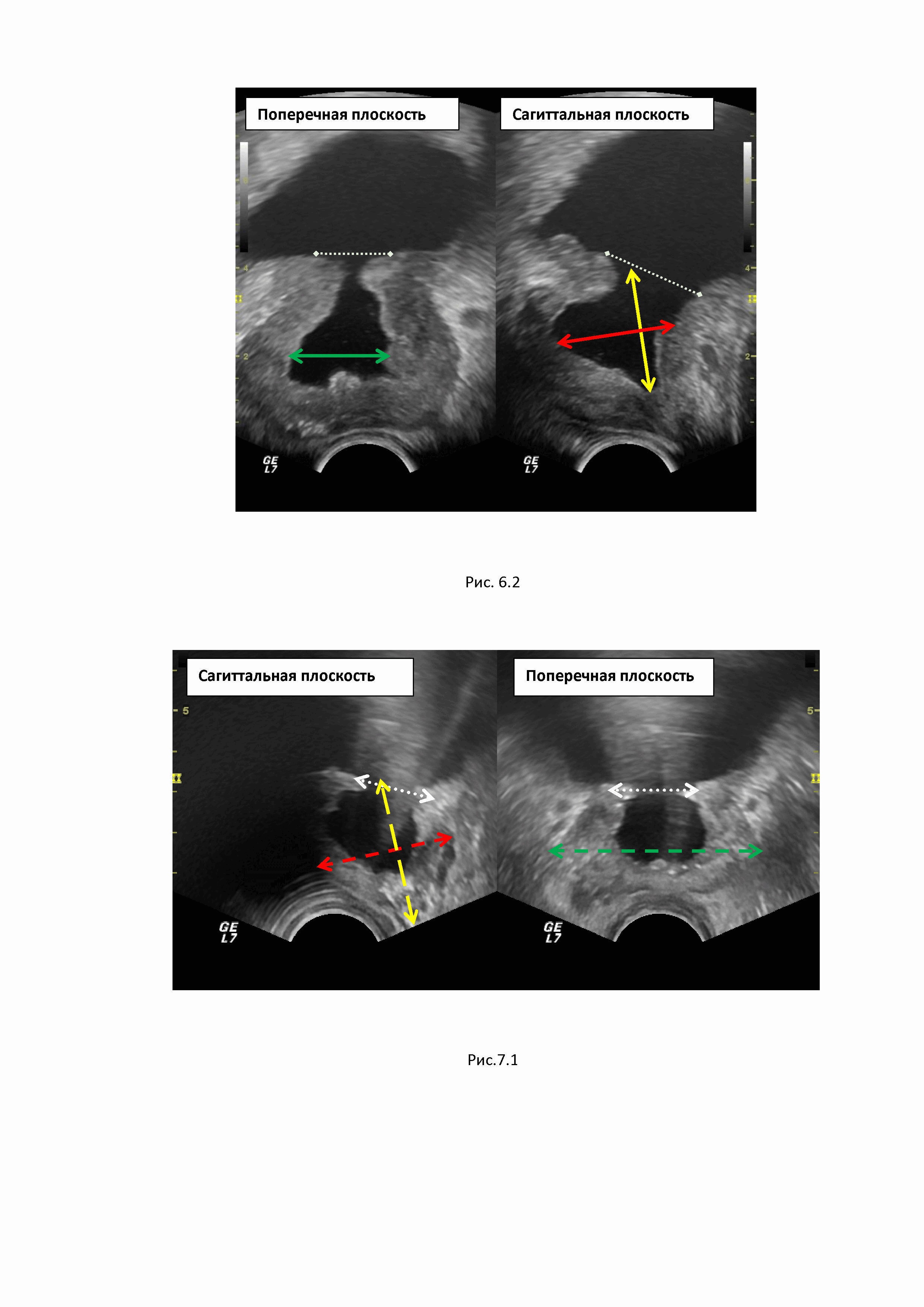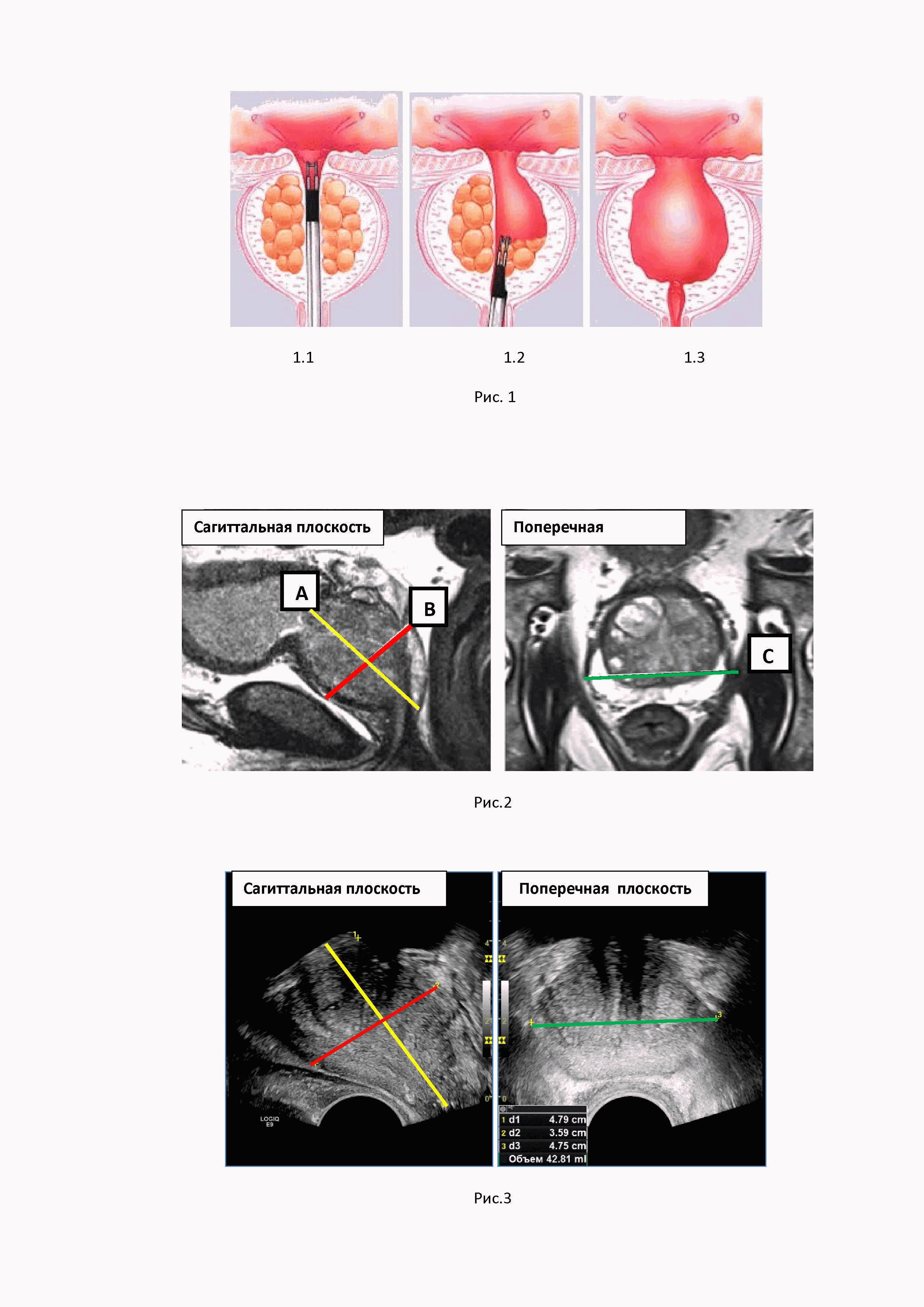 Изобретение относится к области медицины, в частности к ультразвуковой диагностике, и предназначено для улучшения количественной оценки остаточного объема ткани предстательной железы после ее резекции. Способ обеспечивает получение количественных показателей остаточного объема ткани резецированной простаты, что позволит вычислять плотность ПСА, значение которого в настоящее время расцениваются как один из надежных предикторов ранней диагностики рака простаты при динамическом наблюдении за больным. Точность измерения объема предстательной железы (простаты) приобрела принципиальную важность благодаря результатам последних исследований, в ходе которых было установлено, что наибольшей корреляцией среди лабораторных показателей и вероятностью рака простаты обладает показатель плотности ПСА (10, 12). Плотность ПСА рассчитывается как отношение значения исходной концентрации сывороточного общего ПСА к объему предстательной железы (2, 11, 13), а именно: где ПСА-D – плотность ПСА (от английского «PSA density»), На сегодняшний день именно плотность ПСА признается большинством экспертов одним из самых надежных прогностических критериев диагностики рака предстательной железы (РПЖ). При этом пороговым значением ПСА-D считается уровень 0,151 нг / мл / см3 (5). Однако у большой части мужчин старшей возрастной группы предстательная железа увеличивается в размерах, что требует хирургического лечения. Патологоанатомические изменения преимущественно наблюдаются в центральных отделах простаты, где формируется аденоматозная трансформация ткани (гиперпазия простаты, или аденома простаты). Аденоматозная ткань занимает центральную часть предстательной железы и деформирует шейку мочевого пузыря. Это приводит к формированию клинических проявлений аденомы простаты – дизурических жалоб и, что самое главное, к формированию нарушения опорожнения мочевого пузыря, которое, в конечном итоге, может стать причиной развития уремии. Исторически известен метод хирургического лечения данного состояния – чрезпузырная аденомэктомия по Федорову–Фрейеру. Аденомэктомия по Федорову-Фрейеру, несмотря на множество других предложенных методов лечения, относится к основным и наиболее радикальным методам лечения аденомы предстательной железы (1, 8). Несмотря на многочисленные модификации, техника данного оперативного вмешательства остается прежней (7, 9). При операции Федорова-Фрейера аденоматозные ткани удаляются вместе с пузырно-уретральным сегментом и предстательным отделом уретры одним блоком. В ходе операции образуется свободная полость в центральной части простаты, так называемый предпузырь, и его объем соответствует массе удаленных тканей простаты. При этом образуется тканевой дефект, соответствующий по форме эллипсу, диаметром от 3 см, а иссеченный край мочевого пузыря является границей его ложа. Боковыми и задней стенками служат остаточные ткани простаты, нижняя граница предпузыря располагается на уровне семенного бугорка (6). Проблема определения остаточного объема резецированной предстательной железы связана с отсутствием объективной формулы для подсчета объема железы в послеоперационном периоде по причине изменения ее конфигурации после хирургического лечения. На рис.1 представлены этапы трансуретральной резекции центральной ча