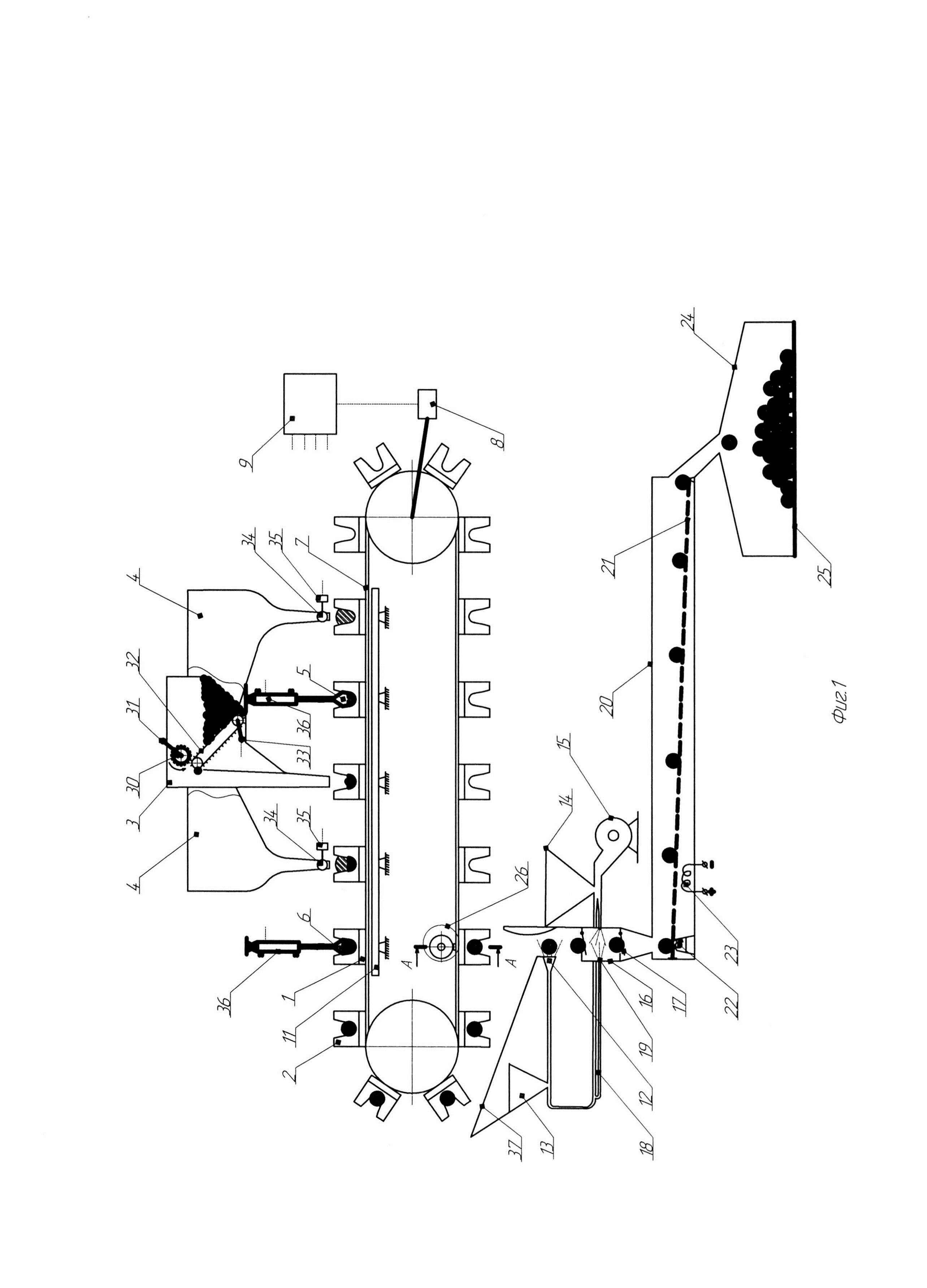 Изобретение относится к сельскохозяйственному машиностроению, в частности к устройствам для предпосевной обработки семян. Линия для капсулирования несыпучих семян, содержит устройство прессования капсул в виде транспортера, с закрепленными на нём на одинаковом расстоянии друг от друга матрицами, приводимого в движение шаговым двигателем. Над матрицами расположены бункер-питатель поштучной выдачи семян, бункеры-питатели питательных смесей, пуансоны с выпуклой рабочей поверхностью для формирования в питательных смесях углублений и пуансоны с вогнутой рабочей поверхностью для формирования оболочек капсулы. Транспортер выполнен в виде бесконечной ленты, а матрицы установлены на столы, которые закреплены с наружной стороны ленты транспортера по всей ее длине с помощью болтового соединения. В каждой из матриц смонтирован выталкиватель капсулы, состоящий из ролика, толкателя и фиксатора толкателя. На ленте транспортера, под бункером-питателем поштучной выдачи семян, бункерами-питателями питательных смесей и пуансонами с выпуклой и вогнутой рабочими поверхностями, расположено не менее пяти столов с матрицами, при этом опора установлена с внутренней стороны ленты транспортера. Кроме того, линия снабжена распылителем клеящей жидкости, поступающей из емкости, устройством для опудривания изготовленных капсул, включающим емкость для порошка и вентилятор, камерой с подпружиненными клапанами на входе и выходе капсул, воздуховодом и распылителем порошка, камерой подогрева капсул, состоящей из кожуха и сетки, установленной с наклоном в сторону выгрузки капсул с возможностью колебательных движений с помощью вибратора, и нагревательного элемента, и бункером для сбора капсул. Дно последнего выполнено открывающимся. Бункер-питатель поштучной выдачи семян оборудован щеточным устройством с приводом от электродвигателя и дозирующей лентой с приводом от шагового двигателя, а бункеры-питатели питательных смесей оборудованы заслонками-дозаторами с приводом от шагового двигателя. Привод пуансонов осуществляется актуаторами. При этом шаговые двигатели и актуаторы связаны с блоком управления. Изобретение позволит обеспечить повышение производительности и качества капсулирования несыпучих семян. 2 з.п. ф-лы, 3 ил.