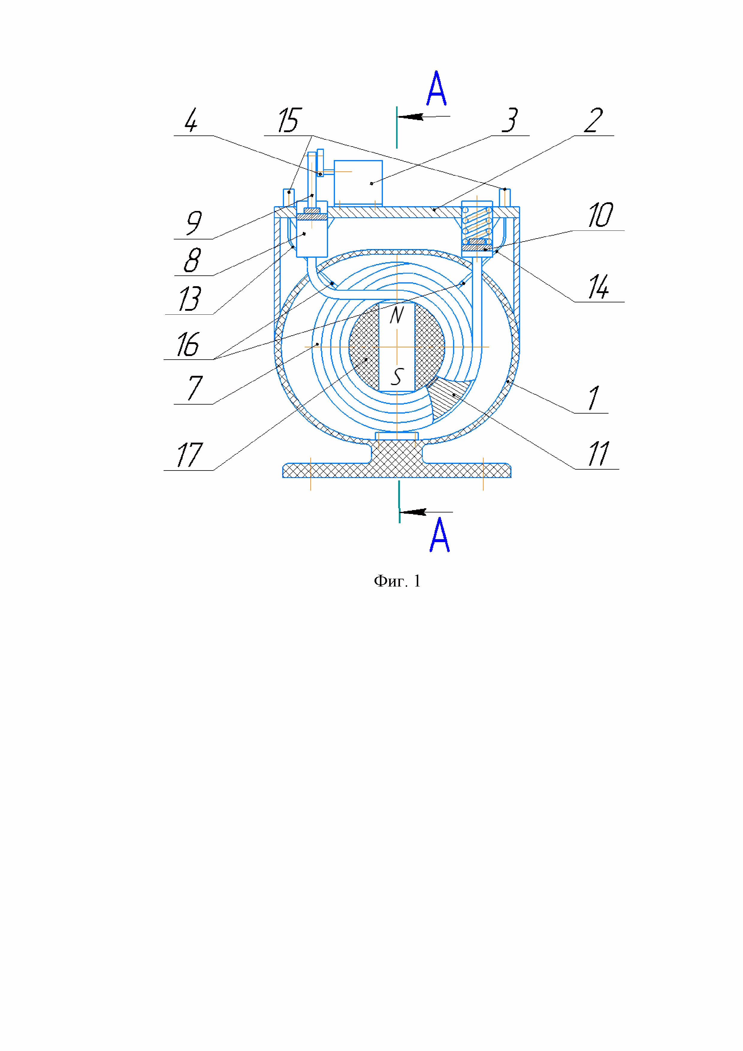 МГДГ представляет собой корпус 1 с крышкой 2, на которой установлен привод 3 с кривошипом 4. Приводом может служить источник механической энергии. В корпусе 1 посредством креплений 6 установлен магнит 5, выполняющий роль статора. По поверхности магнита наматывается трубопровод-канал 7, представляющий собой полую трубку из немагнитного материала прямоугольного поперечного сечения, размер которого уменьшается при переходе на более удаленный радиус от магнита 5. Данное конструктивное решение направлено на обеспечение равного углового перемещения рабочего тела относительно начального положения во всех витках канала. Трубопровод-канал наматывается последовательно по секторам, причем, если обмотка идет в последовательности I-II-III-IV, то последующий сектор имеет навивку IV-III-II-I и так далее по длине всего магнита. С одной стороны к каналу 7 герметично присоединен цилиндр 8, в котором установлен поршень с толкателем 9, шарнирно соединенный с кривошипом 4 привода 3. С противоположной стороны канала герметично установлен цилиндр с подпружиненным механизмом 10. На боковых сторонах канала 7 установлены токопроводящие сегменты 11, представляющие собой тонкие металлические диски, изолированные от соприкосновения с магнитом. Сегменты, расположенные между парой навивками канала разделены между собой диэлектрической пластиной 12. Сегменты 11, расположенные по одну сторону от каждого сектора канала (например, четные и нечетные сегменты), последовательно соединены между собой токопроводящими перемычками 16 и посредством проводов 13 и 14 соединены с клеммами 15, расположенными на крышке генератора 2. Для фиксации трубопровода-канала 7 относительно магнита 5 между ними устанавливают проставки 17, выполненные из немагнитного материала.
