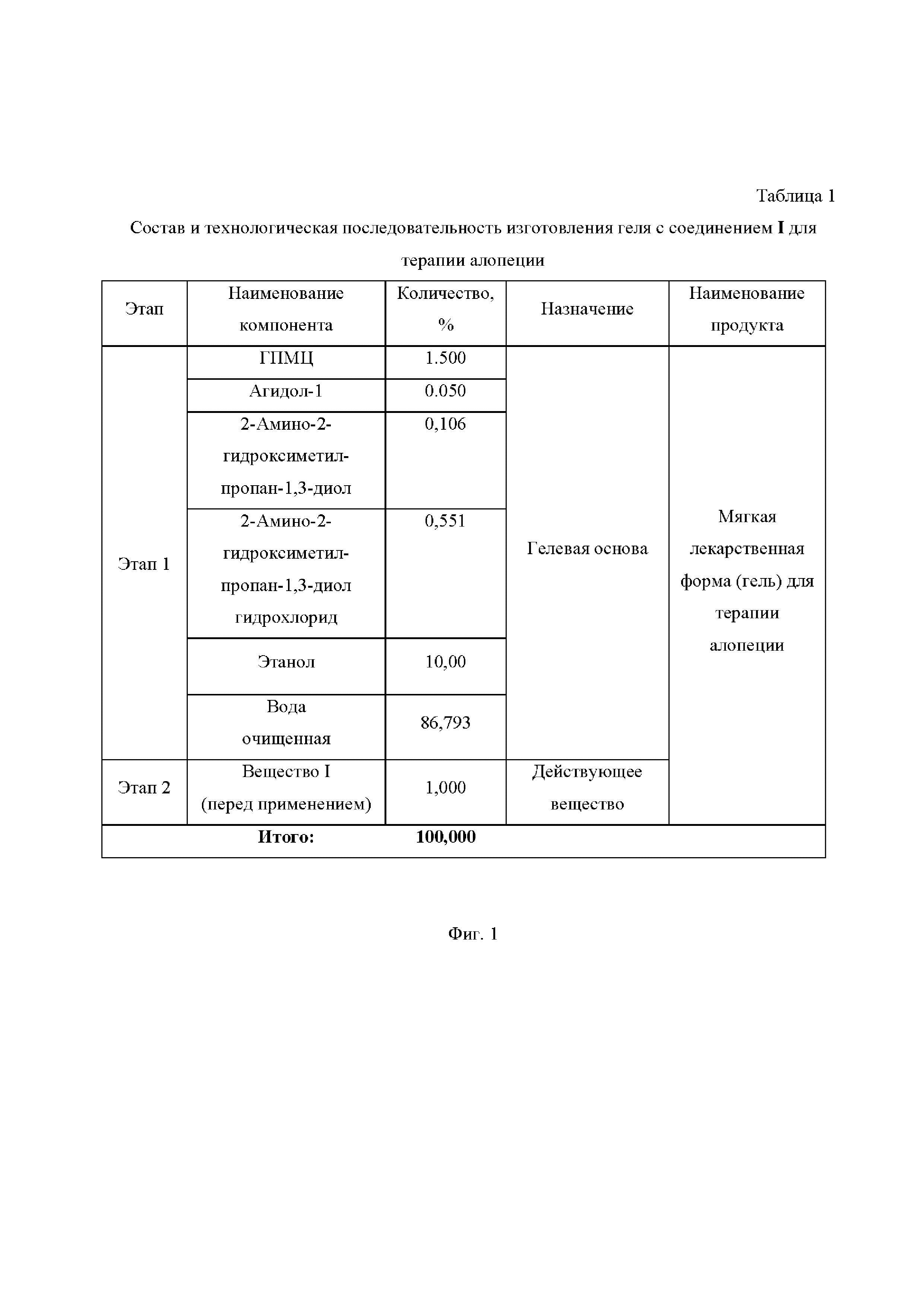 На Фиг.1 приведена Таблица 1, в которой представлены состав и технологическая последовательность изготовления геля с соединением I для терапии алопеции.