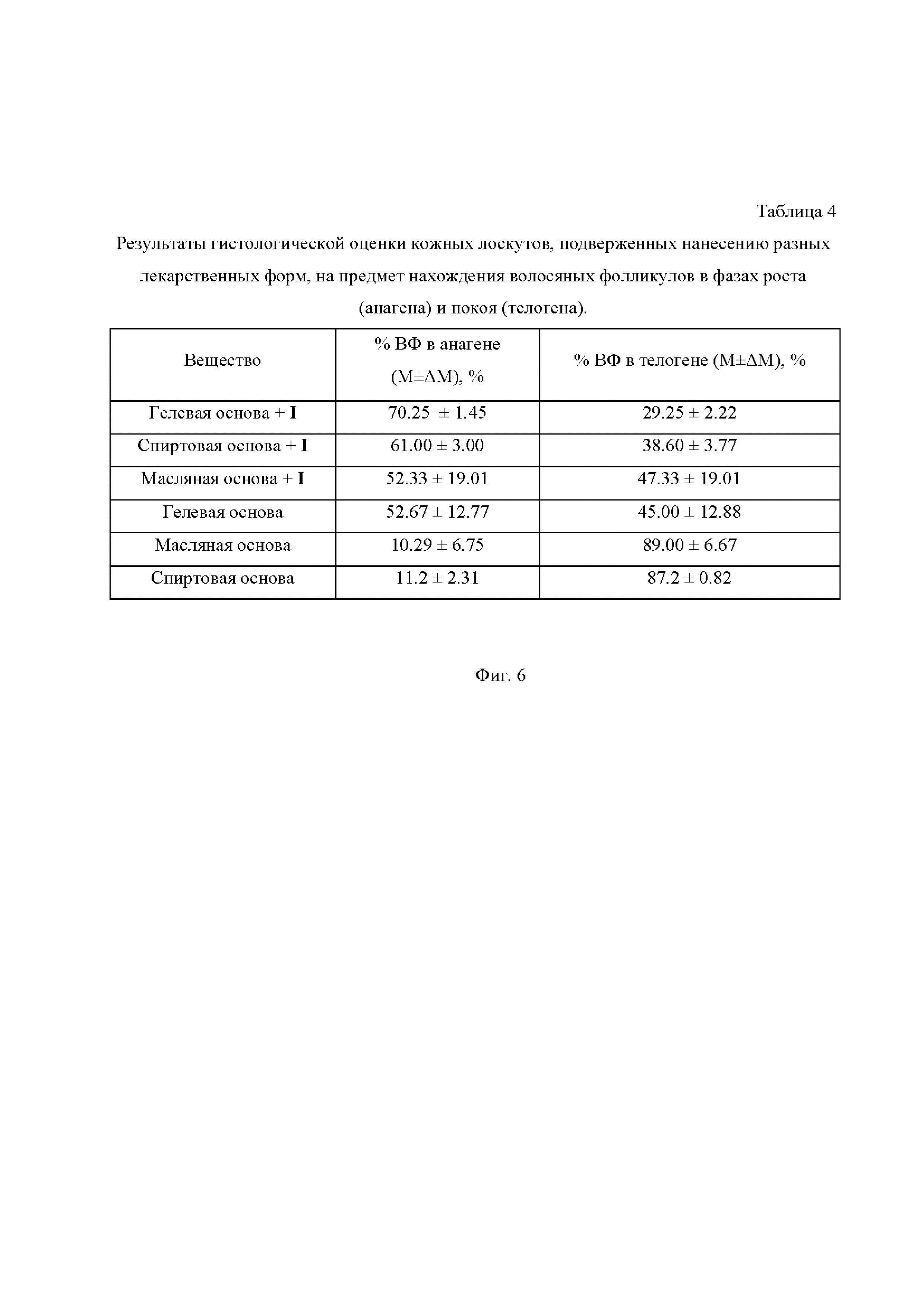 На Фиг.6 приведена Таблица 4, в которой представлены результаты гистологической оценки кожных лоскутов, подверженных нанесению разных лекарственных форм, на предмет нахождения волосяных фолликулов в фазах роста (анагена) и покоя (телогена).
