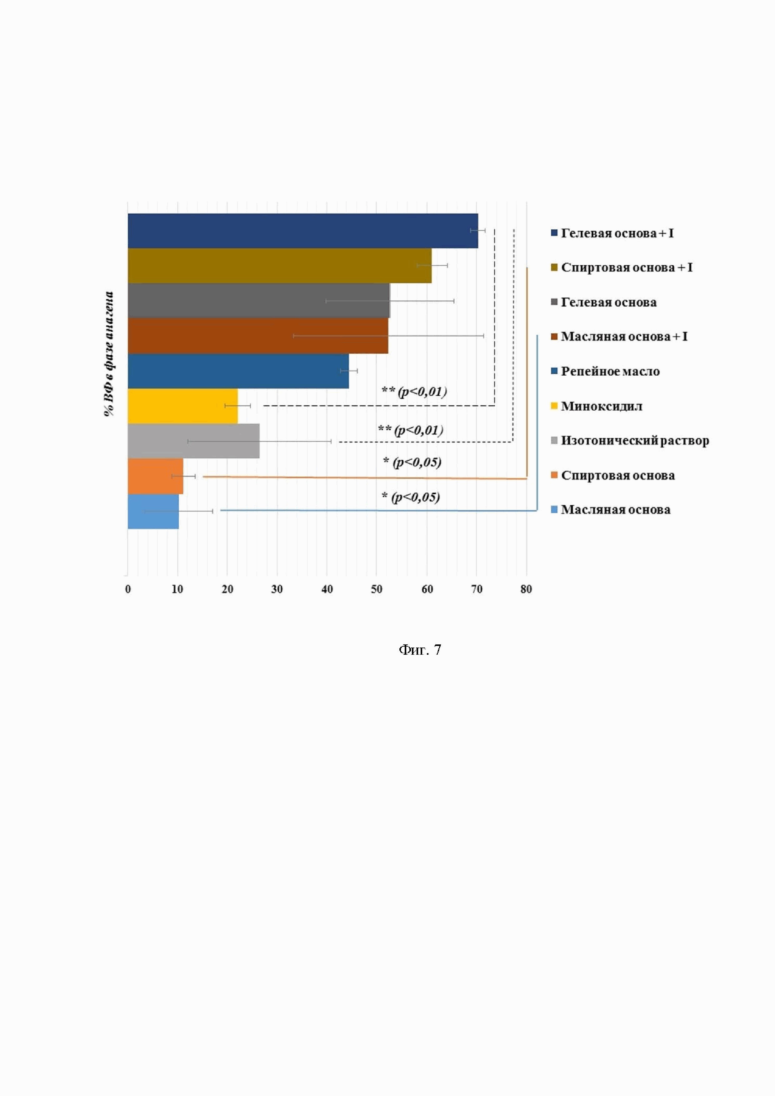 На Фиг.7 приведена диаграмма, на которой представлено влияние испытуемых соединений на число волосяных фолликулов в фазе роста (анагена) с различными основами, где по горизонтали представлено число волосяных фолликулов, по вертикали - % волосяных фолликулов в фазе анагена.