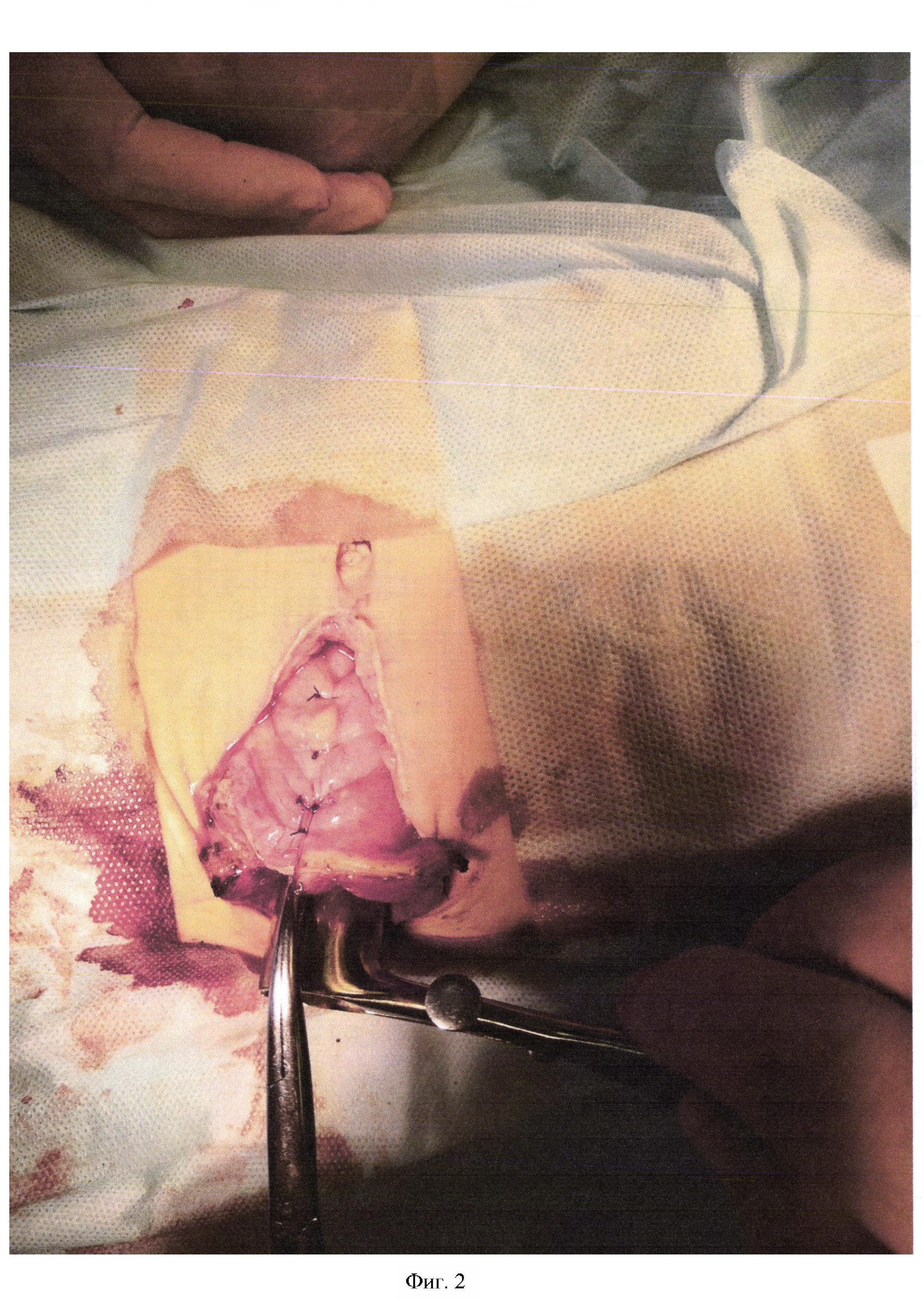 Изобретение относится к медицине, а именно - к оперативным способам лечения эвагинации колостомы при болезни Гиршпрунга у детей. Болезнь Гиршпрунга характеризуется клинически - запором, а морфологически - наличием суженной аганглионарной зоны, переходной зоны и супрастенотического расширения, в большинстве случаев, в области толстой кишки. Из-за значительного расширения кишки выше аганглионарной зоны в ряде случаев невозможна первичная радикальная операция и для возврата к нормальным размерам расширенной кишки первым этапом приходится накладывать колостому на расширенный участок кишки. В 6-15% случаев в послеоперационном периоде возникает эвагинация колостомы. Известны оперативные способы лечения эвагинации колостомы у детей [Ионов А.Л., Щербакова О.В., Лука В.А., Сулавко Я.П. Кишечные стомы в детской колопроктологии. Детская больница, 2011, №4, с. 8]. При значительных выпадениях кишки, особенно с ее ущемлением в отверстии стомы, показано оперативное лечение - реконструкция стомы; [Дегтярев Ю.Г. Осложнение коло- и энтеростомии у детей. Медицинский журнал, 2015, №4, с. 145]. При значительных выпадениях кишки, особенно с ее ущемлением в отверстии стомы, показано оперативное лечение - реконструкция стомы; [Смирнов А.Н., Дронов А.Ф., Холостова В.В., Маннанов А.Г., Ермоленко Е.Ю. Кишечные стомы у детей: сопутствующие проблемы и пути их решения. Российский вестник детской хирургии, анестезиологии и реаниматологии, 2013, т. 3, №4, с. 79]. При неэффективности консервативного вправления ребенка оперируют. Суть операции сводится к рассечению ущемляющего апоневротического кольца, после чего кишка легко вправляется. Рассеченный апоневроз ушивают, при необходимости выполняя реконструкцию стомы. Вышеописанные способы имеют серьезные недостатки: - простое рассечение ущемляющего апоневроза и последующее его сшивание приводит к восстановлению существовавших и вызвавших эвагинацию анатомических взаимоотношений и ведет к рецидиву эвагинации, так как не устраняется причина ее происхождения; - простая реконструкция колостомы, то есть восстановление существовавших и вызвавших эвагинацию анатомических взаимоотношений, приводит к рецидиву эвагинации, так как не устраняется причина ее происхождения; - не устраняется основная причина эвагинации колостомы - сохранение прежнего расширенного диаметра наружного отверстия колостомы; - не приводится детали выполнения реконструкции колостомы; Известны оперативные способы лечения эвагинации колостомы [Коновалов С.В. Профилактика и лечение ранних и поздних осложнений колостомы. Автореферат диссертации на соискание ученой степени доктора медицинских наук, Санкт-Петербург, 2004, с. 39]. Пролапс колостом целесообразно устранять с помощью фиксации подвижного престомального отдела толстой кишки к внутренней поверхности передней брюшной стенки; [Клинические рекомендации по ведению взрослых пациентов с кишечной стомой, Москва, 2013, с. 8]. При клинически значимой эвагинации, требующей хирургического лечения, показано выполнение ликвидации эвагинации стомы по типу операции Альтмайера: отсечение кишки на 1 см кнутри от слизисто-кожного рубца, резекция выпадающего сегмента кишки и формирование анастомоза ручным способом. Однако данные способы имеют ряд недостатков: - фиксация престомального отдела толстой кишки к вну