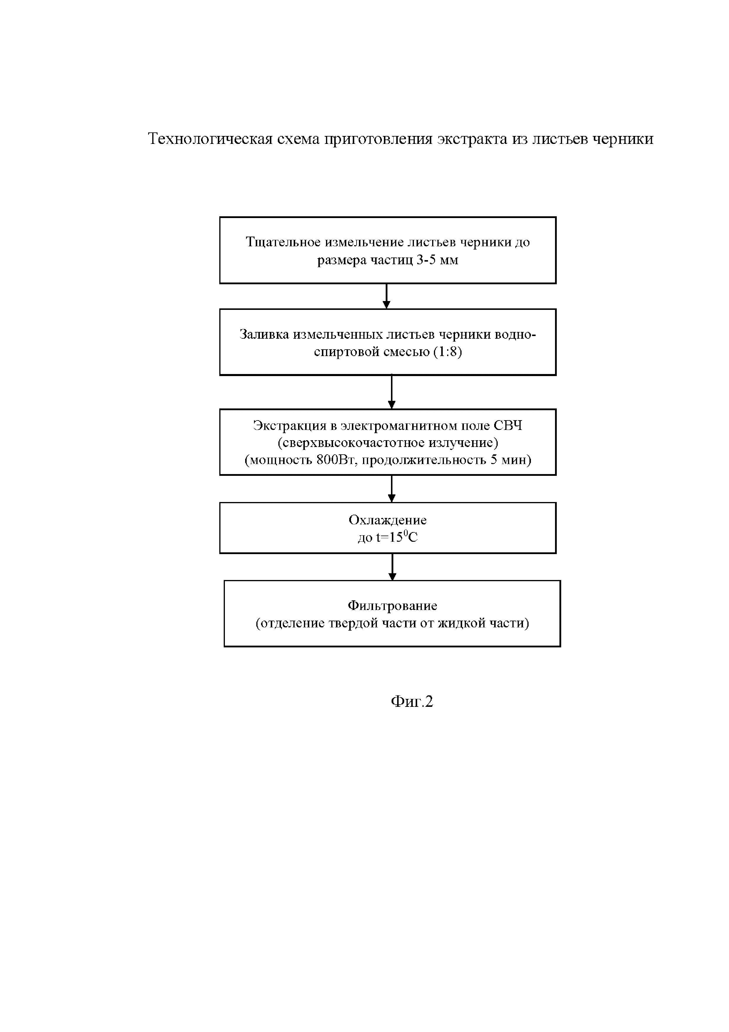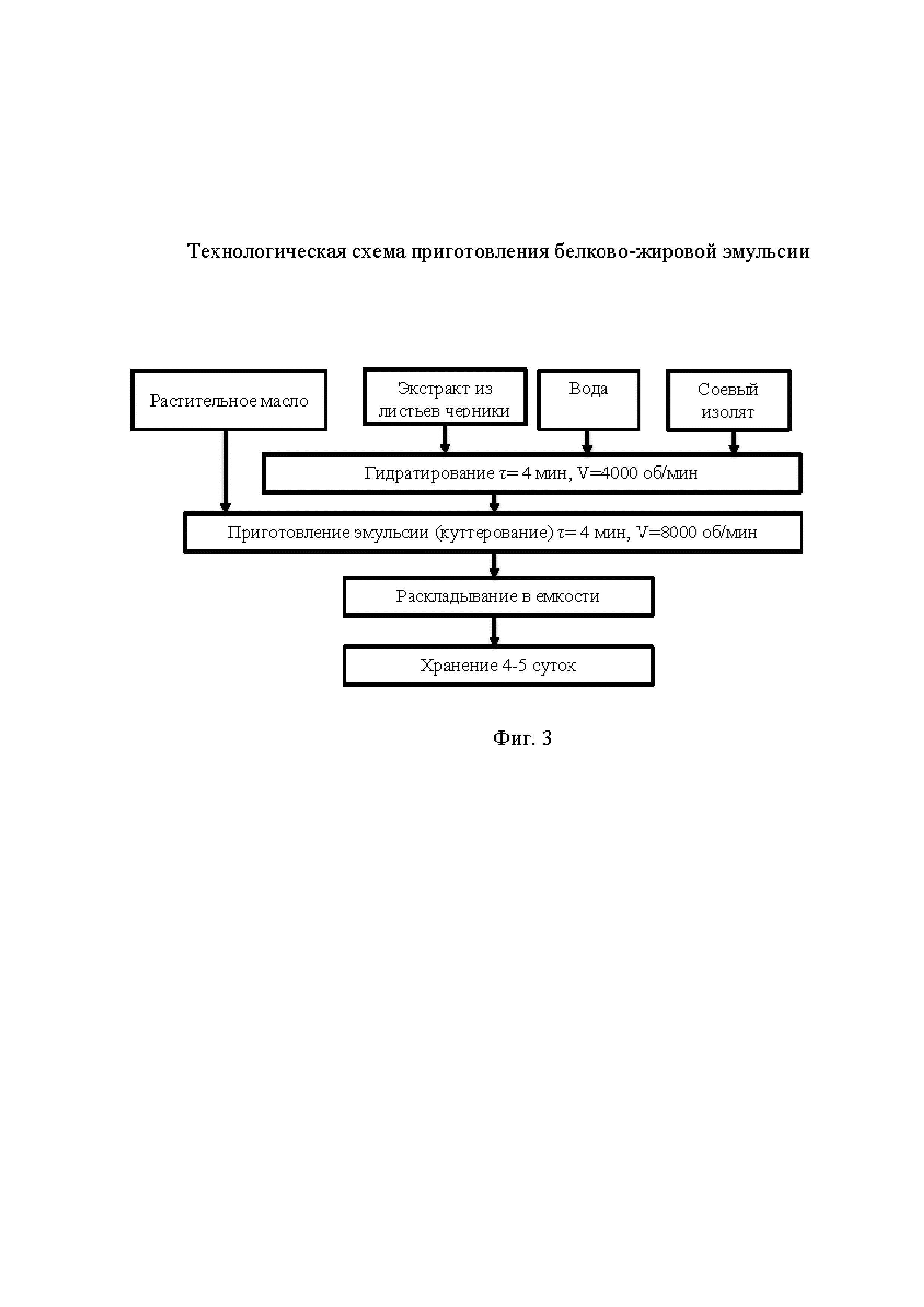 Способ производства белково-жировой эмульсии, предусматривающий обработку обогащенного антиоксидантами природного происхождения белково-жировой эмульсии в устройстве для тонкого измельчения-куттере соевого белкового изолята, растительного масла, жидкого компонента, отличающийся тем, что в качестве источника природных антиоксидантов используют растительное сырье из измельченных листьев черники, заливают их 40% водно-спиртовой смесью в соотношении 1:8, полученную смесь предварительно экстрагируют в условиях микроволнового излучения мощностью 700-800 Вт продолжительностью 4-7 минут с получением 40% водно-спиртового экстракта из листьев черники, полученную смесь охлаждают до температуры 10-25°С, в качестве жидкого компонента используют смесь воды в количестве 15% и приготовленного раствора из листьев черники в количестве 30%, взятых от общего количества эмульсии.