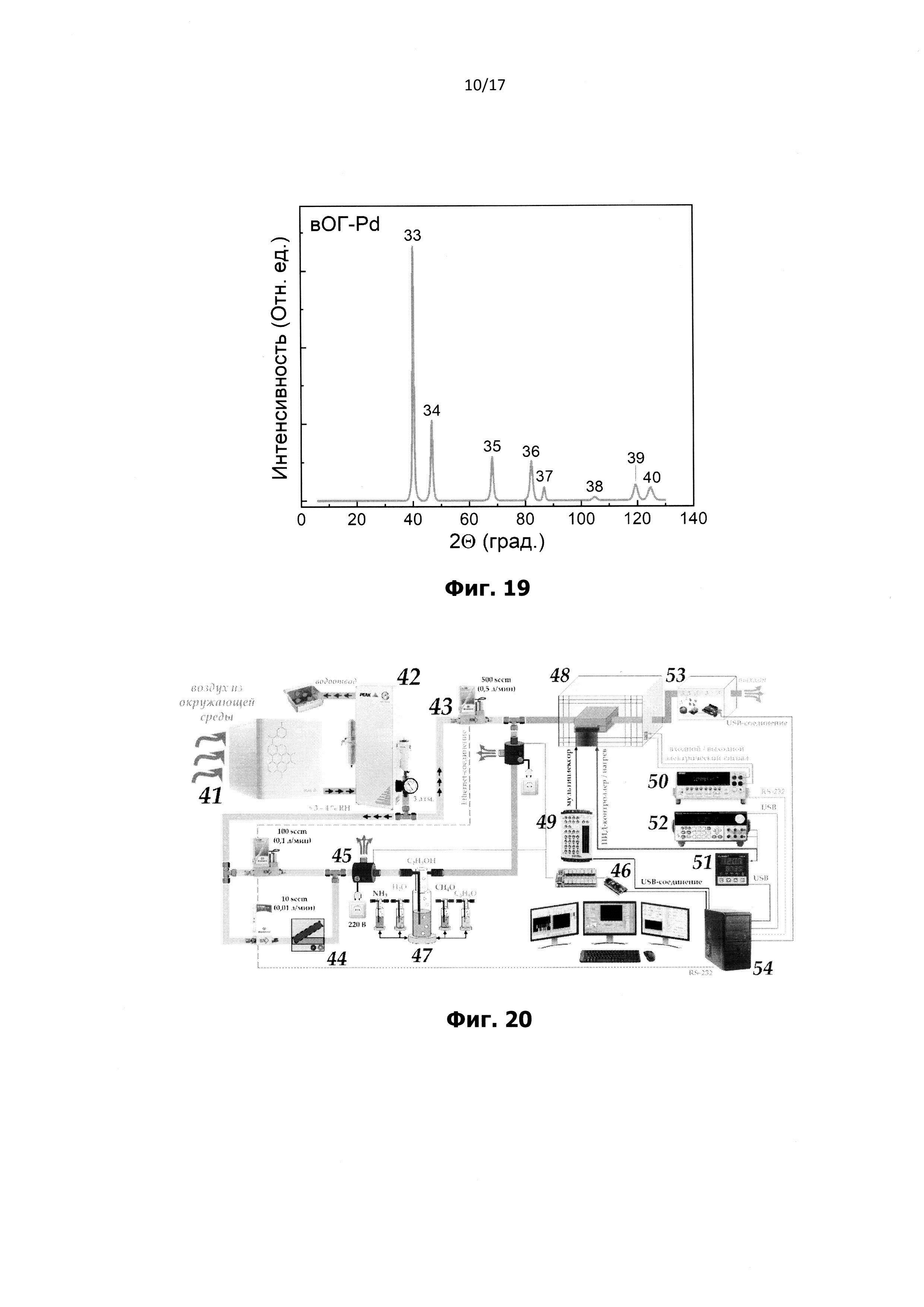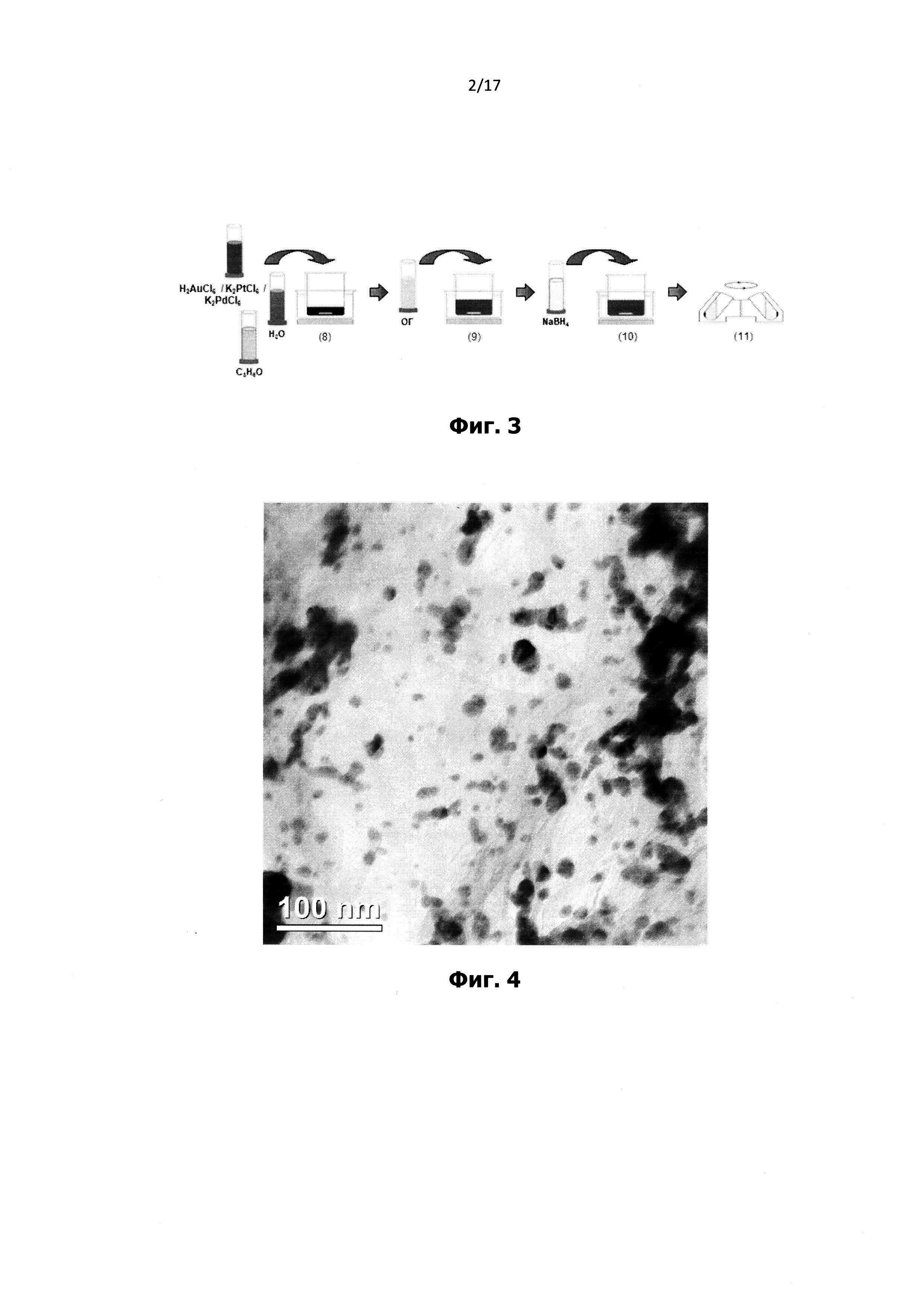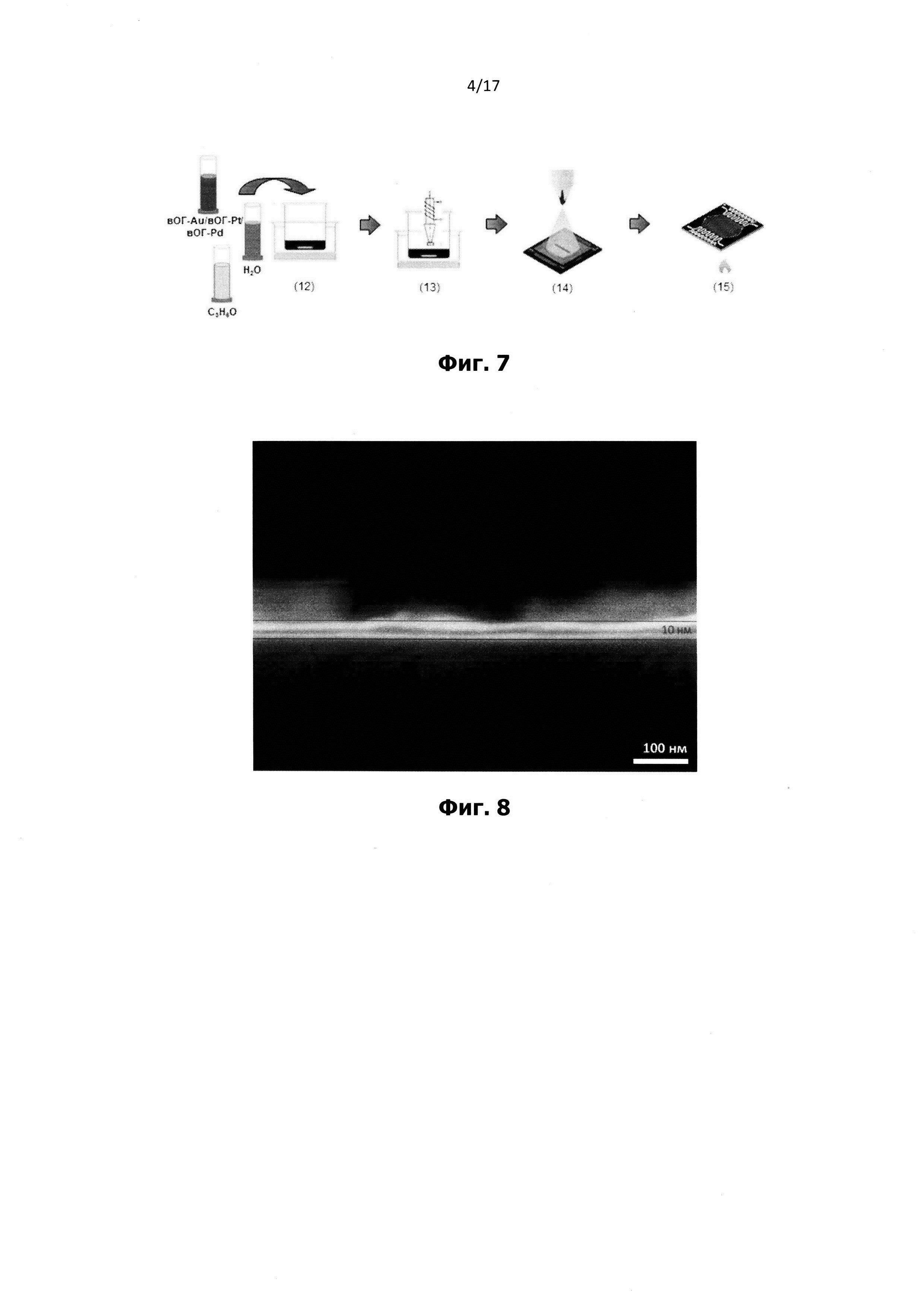 1. Газоаналитический мультисенсорный чип, включающий диэлектрическую подложку, расположенные на подложке компланарные полосковые электроды, терморезисторы и нагреватели, при этом по меньшей мере часть поверхности электродов и подложки между электродами покрыта газочувствительным слоем, у которого при комнатной температуре изменяется сопротивление под воздействием примесей органических паров или паров воды в окружающем воздухе, отличающийся тем, что газочувствительный слой образован, по меньшей мере, двумя сегментами, изготовленными из композита на основе восстановленного оксида графена, на поверхности которого иммобилизованы наночастицы одного из благородных металлов, выбранного из группы, включающей золото (Au), платину (Pt), палладий (Pd) с размерами частиц от 5 нм до 50 нм и расстоянием между отдельными наночастицами или их кластерами не менее 5 нм и не более 50 нм, при этом сегменты газочувствительного слоя выполнены с переменной и отличающейся друг от друга толщиной от 5 нм до 350 нм. 2. Мультисенсорный чип по п. 1, отличающийся тем, что газочувствительный слой образован тремя сегментами, изготовленными из композита на основе восстановленного оксида графена с иммобилизованными наночастицами золота, платины и палладия. 3. Мультисенсорный чип по п. 1, отличающийся тем, что каждый из сегментов газочувствительного слоя покрывает не менее 30% от общей площади поверхности электродов и подложки между электродами. 4. Мультисенсорный чип по п. 1, отличающийся тем, что сегменты выполнены толщиной, изменяющейся в диапазоне от 10 нм до 300 нм. 5. Мультисенсорный чип по п. 1, отличающийся тем, что в пределах каждого сегмента обеспечено изменение толщины слоя не менее чем на 10%. 6. Мультисенсорный чип по п. 1, отличающийся тем, что композиты на основе восстановленного оксида графена и наночастиц благородных металлов синтезированы методом жидкофазной химической модификации оксида графена солями данных металлов. 7. Мультисенсорный чип по п. 1, отличающийся тем, размер кристаллитов в наночастицах отличается от размера наночастиц не более чем на 10%. 8. Способ изготовления газоаналитического мультисенсорного чипа, включающий нанесение на поверхность диэлектрической подложки набора компланарных полосковых электродов, нагревателей и терморезисторов, с последующим нанесением на поверхность электродов и подложки между электродами суспензии, содержащей частицы газочувствительного материала, и высушиванием полученной структуры, отличающийся тем, что на поверхность электродов и подложки между электродами наносят по меньшей мере две различные суспензии, содержащие композит на основе восстановленного оксида графена с иммобилизованными наночастицами золота, платины или палладия с размерами частиц от 5 нм до 50 нм и расстоянием между отдельными наночастицами или их кластерами не менее 5 нм и не более 50 нм, при этом сегменты газочувствительного слоя выполнены с переменной и отличающейся друг от друга толщиной от 5 нм до 350 нм. 9. Способ изготовления мультисенсорного чипа по п. 8, отличающийся тем, что на поверхность электродов и подложки между электродами наносят три различные суспензии композита на основе восстановленного оксида графена и благородных металлов с образованием трех сегментов газочувствительного слоя, при этом в качестве суспензий к
