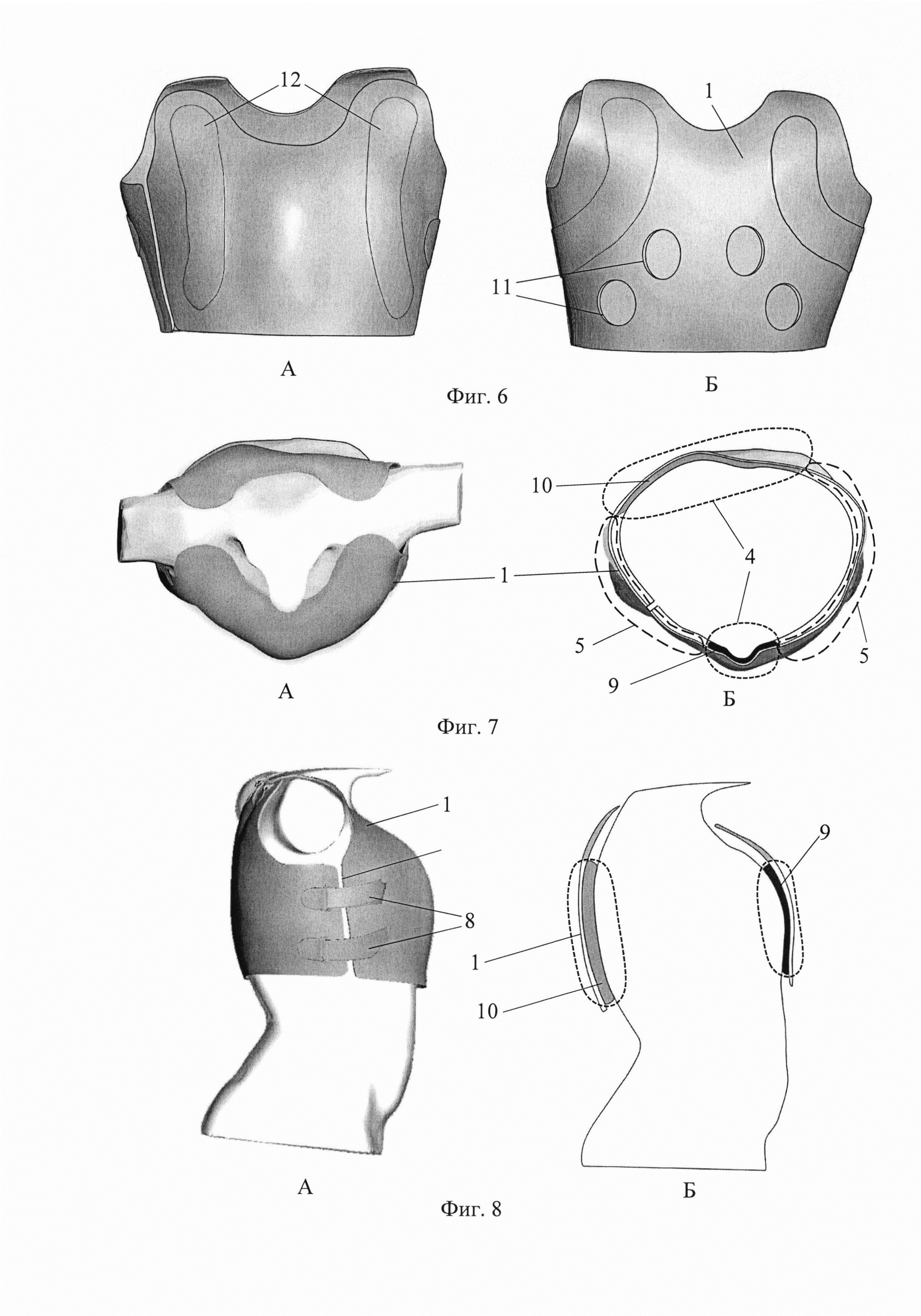 Изобретение относится к медицинской технике, а именно к устройствам для нехирургического исправления формы грудной клетки. Устройство для коррекции килевидной деформации грудной клетки и деформации позвоночника состоит из каркаса, выполненного в виде объемной полой модели, схожей с рельефом грудной клетки, и расположенных на каркасе регулировочных элементов для индивидуальной адаптации устройства и элементов давления. Каркас содержит корригирующие зоны давления и участки разгрузки для воздействия на грудную клетку и позвоночник в трех плоскостях, имеет продольный разрез на одной из передненаружных поверхностей. Регулировочные элементы включают наплечные лямки, расположенные над областью надплечий, и ремни натяжения, расположенные над областью продольного разреза. Модуль упругости при изгибе материала, из которого изготовлен каркас, не менее 400 МПа. В области килевидной деформации грудной клетки на внутренней поверхности каркаса расположен передний упругий элемент с твердостью по Шору А не менее 30. Площадь переднего упругого элемента соответствует площади деформированной части грудной клетки не менее чем на 50 процентов. Толщина переднего упругого элемента находится в интервале 50-100 процентов от высоты выступающего участка килевидной деформации грудной клетки. На поверхности каркаса, обращенной к спине на площади в диапазоне 1-3 процента от общей поверхности тела, расположен задний упругий элемент с регулируемой толщиной и твердостью. Твердость по Шору А заднего упругого элемента находится в интервале от 10 до 20, а толщина заднего упругого элемента в диапазоне от 3 до 20 мм. Техническим результатом является обеспечение возможности одновременной коррекции различных вариантов килевидной деформация грудной клетки и сопутствующей деформации грудной клетки и/или позвоночника с учетом индивидуальных особенностей пациента и фиксации грудной клетки и позвоночника в достигнутом положении при одновременном повышении удобства его эксплуатации. 12. з.п. ф-лы, 8 ил.