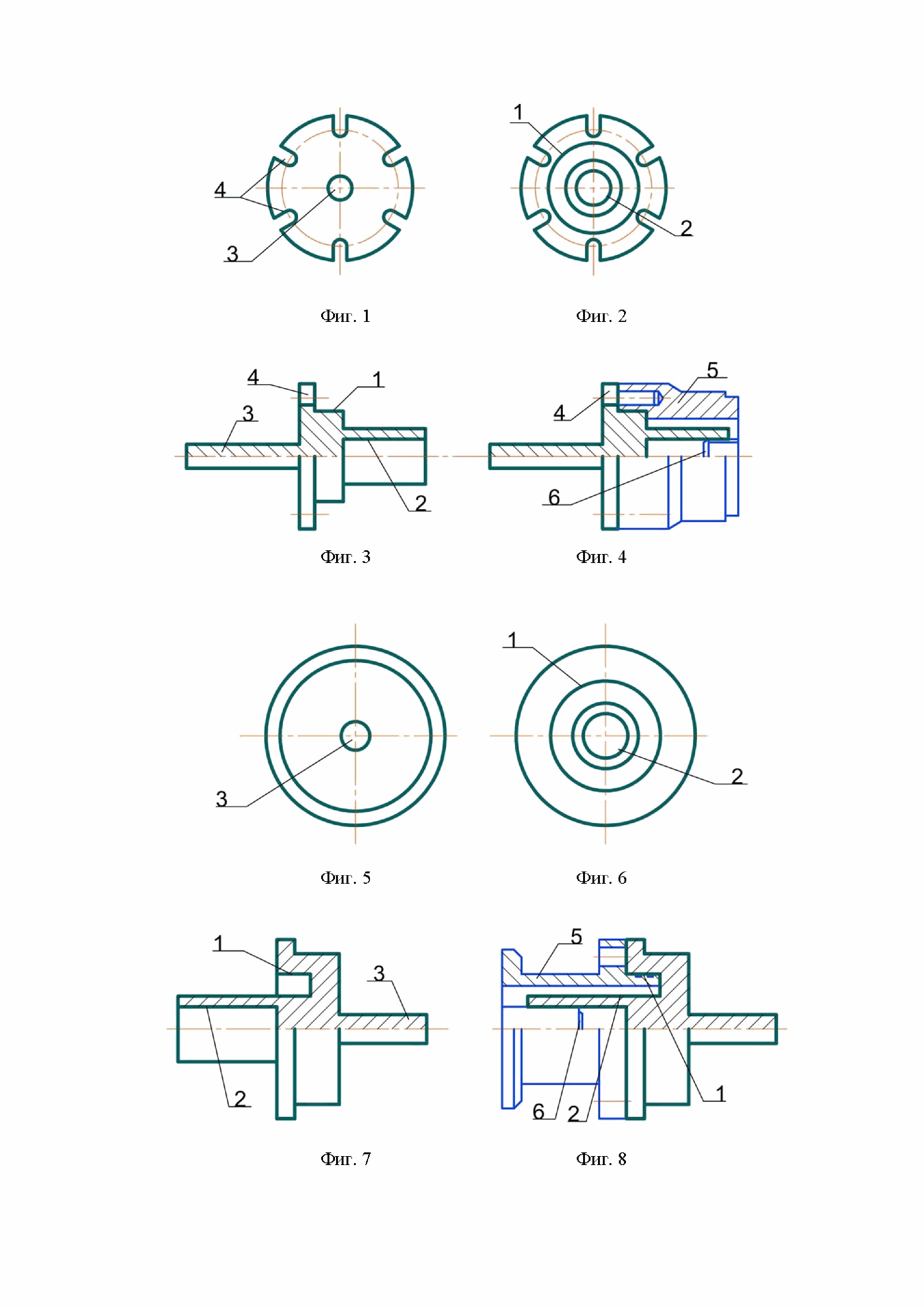 Калибр для контроля соосности может быть выполнен в различных вариантах исполнения, например, показанных на рисунках. Он выполненяется в виде металлической монолитной корпусной детали с соосными посадочной поверхностью 1 на корпус 5 и калибровочной поверхностью 2 для вала 6.