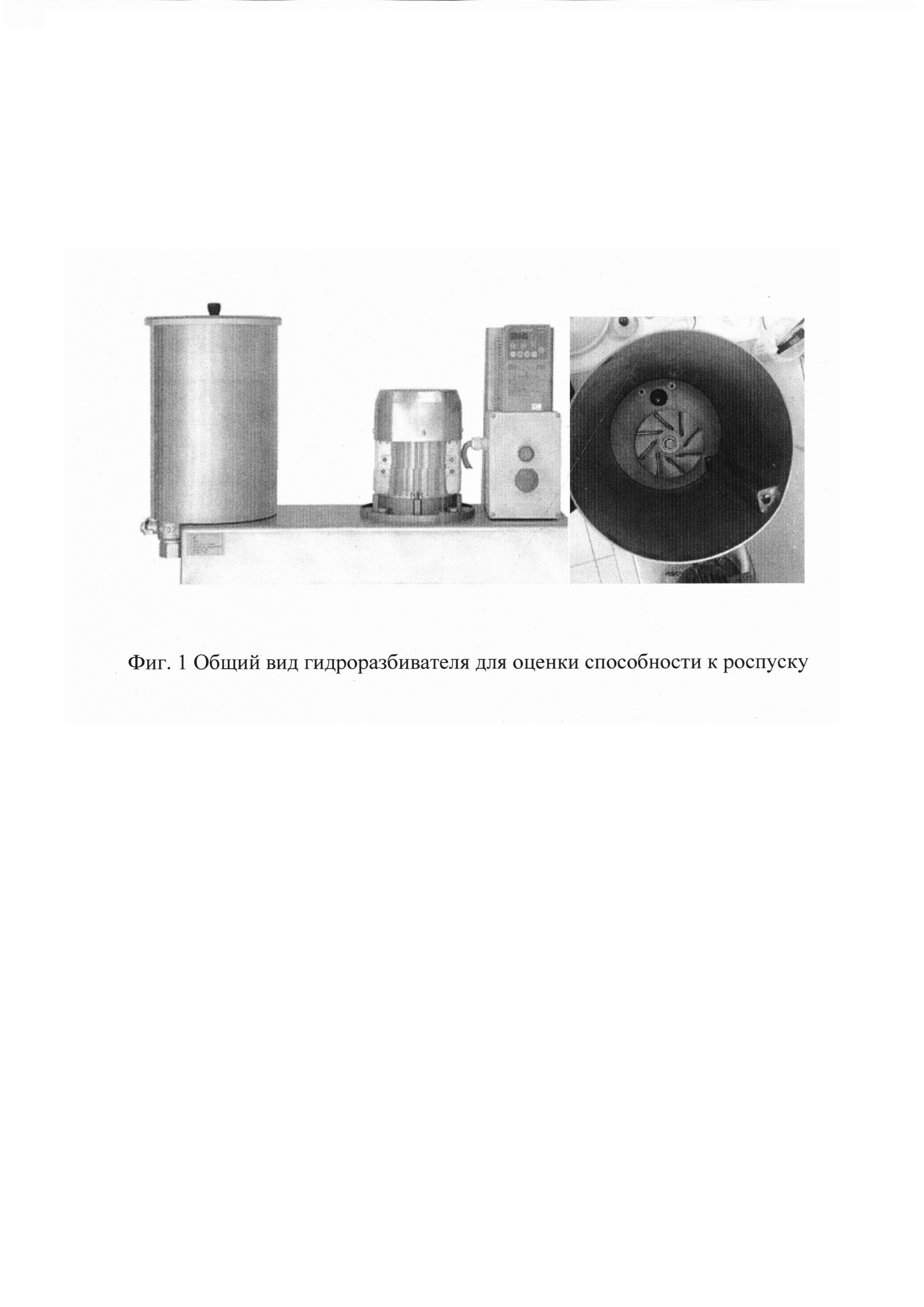 Способность образцов картона (втулки) к роспуску определяли по методике Afnor NFQ 34-020 при оборотах мешалки 400-800 мин-1, температуре воды 16-20°С. Навеска образца картона составляла 3,88 г или размер образца - 9×8 см. Роспуск проводили на лабораторном гидроразбивателе - дезинтеграторе модели N2101, объемом 8 л (представлен на фиг. 1). Скорость вращения мешалки регулировали в диапазоне 400-800 мин-1.