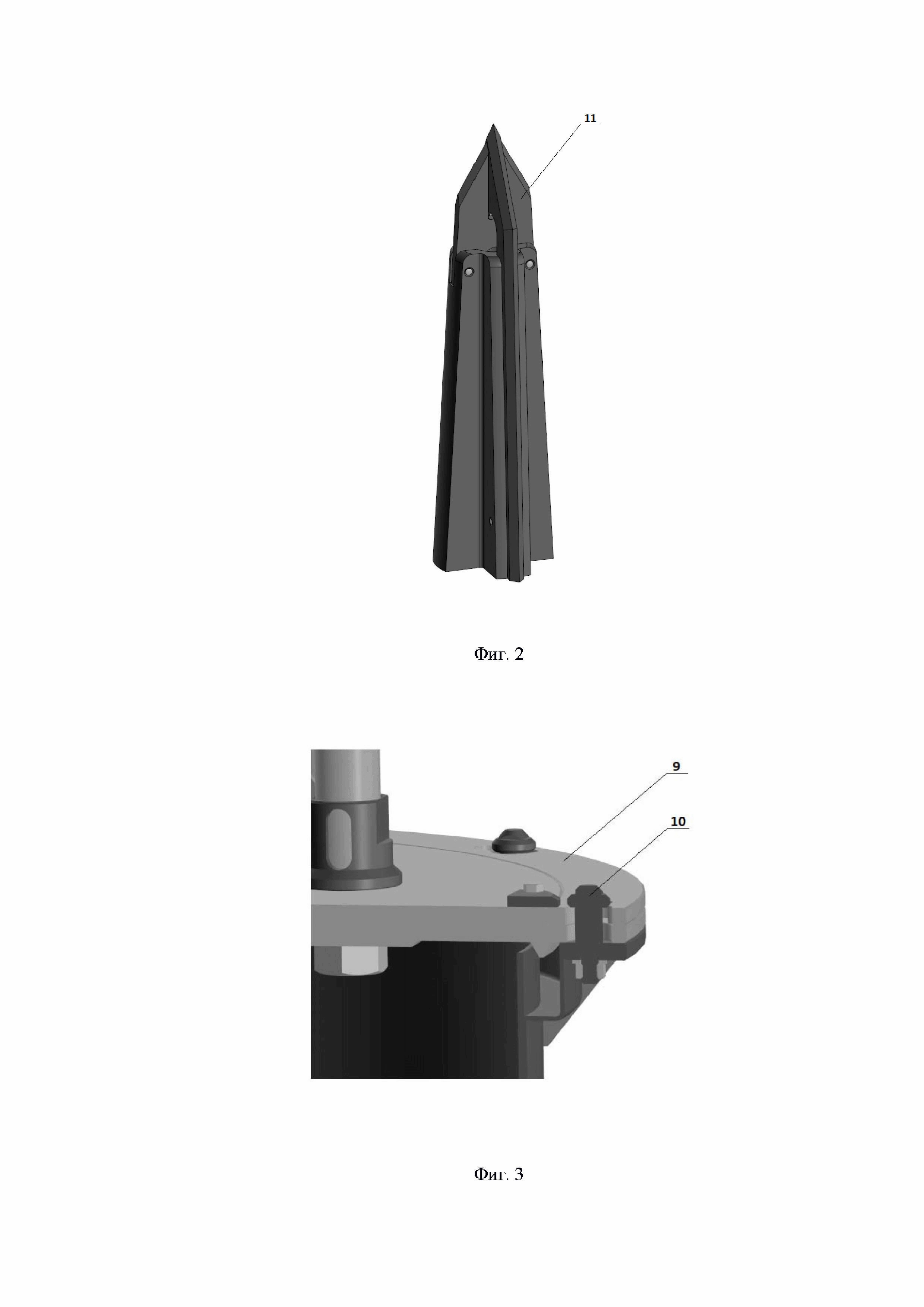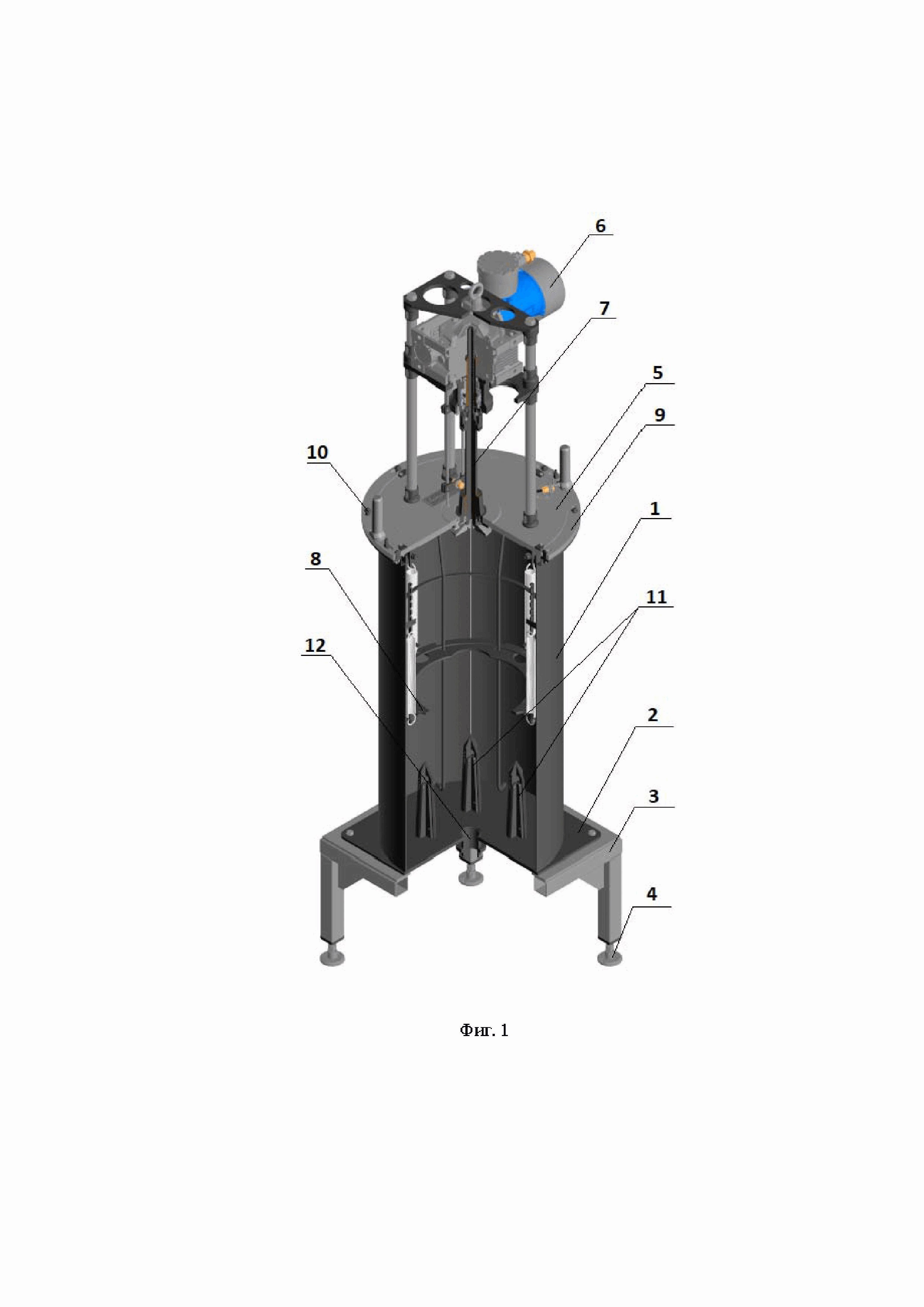 Установка растаривания предназначена для приготовления растворов заданной концентрации из твердых токсичных реагентов, в частности для растаривания бочек с цианистыми солями, без непосредственного участия человека в операциях перфорации дна бочек, растворения и нейтрализации. Известна установка для растаривания металлических барабанов с токсичными реагентами (патент №2705447, публ. 2019.11.07), включающая узел растаривания с вытяжным устройством, платформу для установки барабанов, уровнемер, рабочий орган, выполненный в виде колокола с приспособлением для прокалывания барабанов, емкость приготовления раствора заданной концентрации с системой разводки трубопроводов, снабженной переключателем потока жидкости, отличающаяся тем, что установка снабжена системой управления, интерфейс которой выполнен в виде мнемосхемы установки, платформа для установки барабанов выполнена наклонной, при этом барабаны поднимают электроталью и размещают горизонтально, платформа снабжена отсечным барьером, ограждающей рамой и механизмом удаления опорожненных барабанов, система разводки трубопроводов снабжена электроклапанами, а приспособление для прокалывания барабанов выполнено в виде копья, состоящего из наконечника и пустотелого штока, причем наконечник выполнен в виде плоских ножей, жестко закрепленных между собой, имеющих в поперечном сечении крестообразную форму, на оси наконечника расположена размывная головка с сопловыми отверстиями, пустотелый шток жестко закреплен на каретке, которая перемещается вверх-вниз по направляющим при помощи электродвигателя с редуктором и цепной передачи. К недостаткам известной конструкции можно отнести сложность конструкции привода наконечника, недостаточная герметичность и низкая производительность. Технический результат, достигаемый при использовании установки растаривания, заключается в повышении герметичности установки и упрощение ее конструкции. Технический результат достигается тем, что установка растаривания содержит цилиндрическую емкость, закрепленную на основании с регулируемыми опорами, головное устройство в виде крышки с замком и с установленным на крышке электроприводом штока, воздействующего на загруженную в емкость тару, на дне емкости закреплены не менее четырех наконечников для перфорации тары с каналами подачи подготовленной воды и вывода раствора внутрь емкости, выходной патрубок, при этом внутри емкости установлена подпружиненная опора, препятствующая проколу тары при загрузке в емкость, между емкостью и крышкой образован канал гидрозатвора с входным патрубком и возможностью перелива жидкости из канала в емкость. Установка поясняется чертежами. На Фиг. 1 изображена установка в целом, на Фиг. 2 изображен наконечник для перфорации, на Фиг. 3 изображен канал гидрозатвора и замок головного устройства. Установка содержит герметичную цилиндрическую емкость 1 с опорной пластиной 2, закрепленной на основании 3 с регулируемыми опорами 4, головное устройство 5 в виде крышки, с установленным электроприводом 6 штока 7 и датчиком ограничения хода штока. При операции загрузки - выгрузки тары (барабанов), головное устройство 5 устанавливается на направляющие штыри емкости 1 при помощи грузоподъемного механизма. Внутри емкости 1 установлена подпружиненная опора 8 в виде