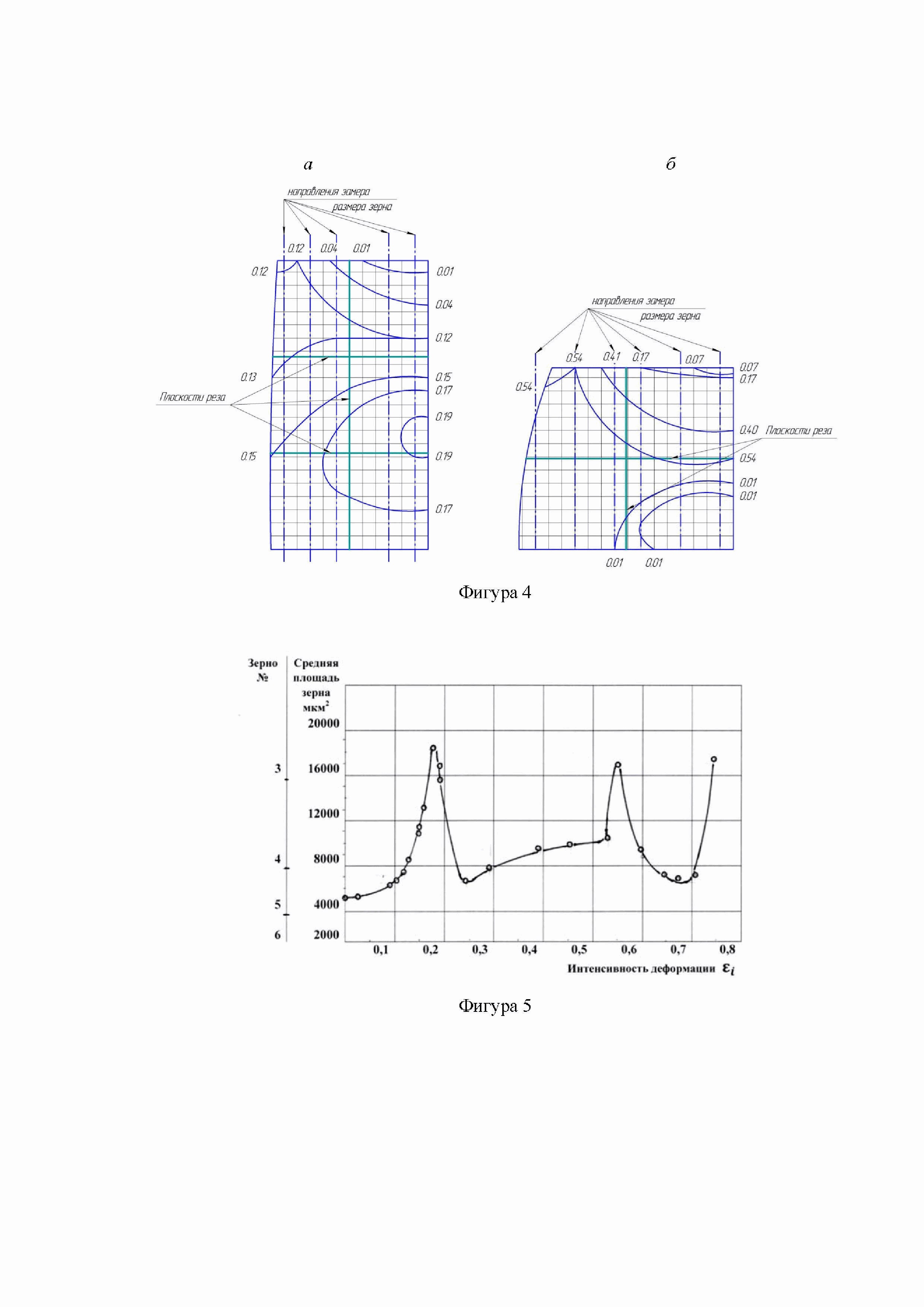 Изобретение относится к металлургической промышленности. Способ предусматривает построение трехмерных зависимостей рекристаллизации в координатах «средняя величина (площадь) зерна - интенсивность деформации - температура». Изобретение позволяет уменьшить число испытаний, повысить точность построения диаграмм и приблизить оценку процесса рекристаллизации к производственным условиям. Известны способы построения диаграмм рекристаллизации, начиная с 20-х годов прошлого столетия (работы Тафеля, Ганеманна и Шнейдера), в которых для испытаний применяется метод осадки цилиндрических образцов плоскопараллельными опорами [1]. Испытания проводятся в диапазоне температур (600÷1200)°С через 50°С и степенях деформации в пределах (3÷80) %. Величина зерна определяется на шлифах продольных сечений осаженных образцов с применением металлографического метода. Зона замера выбирается по месту пересечения диагоналей продольного сечения осаженного образца (метод Гейна). При построении диаграммы рекристаллизации, средняя площадь зерна соотносится с относительной деформацией по высоте. В последующих способах построения, с целью повышения равномерности деформации в осаженных образцах, и как следствие точности оценки степени деформации, осадку проводили с использованием конических опор (метод Зибеля и Помпа) и образцов с торцевыми выточками, которые заполнялись твердой смазкой. Следует отметить способ И.М. Павлова, предусматривающий построение «истинных» диаграмм по размерам зерен, расположенных по вертикальной оси продольного сечения осаженного образца и сопоставляемых с действительной деформацией, которая определялась по изменению шага резьбы ввинченных шурупов [2]. К недостаткам метода следует также отнести большое количество испытаний и металлографических замеров, и недостаточную точность, которая обусловлено тем, что ввинченный шуруп искажает распределение деформаций в осаживаемом образце. Во всех способах построение диаграмм рекристаллизации рода основано на металлографических исследованиях осаженных образцов, количество которых при каждой температуре, в показателе относительной деформации по высоте, имеют значения 3, 5, 7, 10, 15, 20. 25. 30, 40, 50 и 80%. Наряду с неоспоримым удобством способов, в виде определенного места измерения величины зерна в продольном сечении осаженного образца, их применение имеет ряд ограничений, прежде всего из-за большого количества испытаний, неточности построения, а также невозможности использовании показателя относительной степени деформации в условиях пластического деформирования со сложным нагружением. Наиболее близким по технической сущности к предлагаемому является метод Н.И. Корнеева, в котором место измерения величины зерна в продольном сечении осаженного образца не устанавливалось [1]. На всей поверхности продольного сечения выявлялась максимальная величина зерна, которая на диаграмме соотносилась с относительной деформацией образца по высоте. К недостаткам метода следует также отнести большое количество испытаний и металлографических замеров, и недостаточную точность. Техническим результатом предлагаемого изобретения является уменьшение числа испытаний на осадку при каждой температуре до двух, повышение точности построения диаграмм и возможности их использования в произво