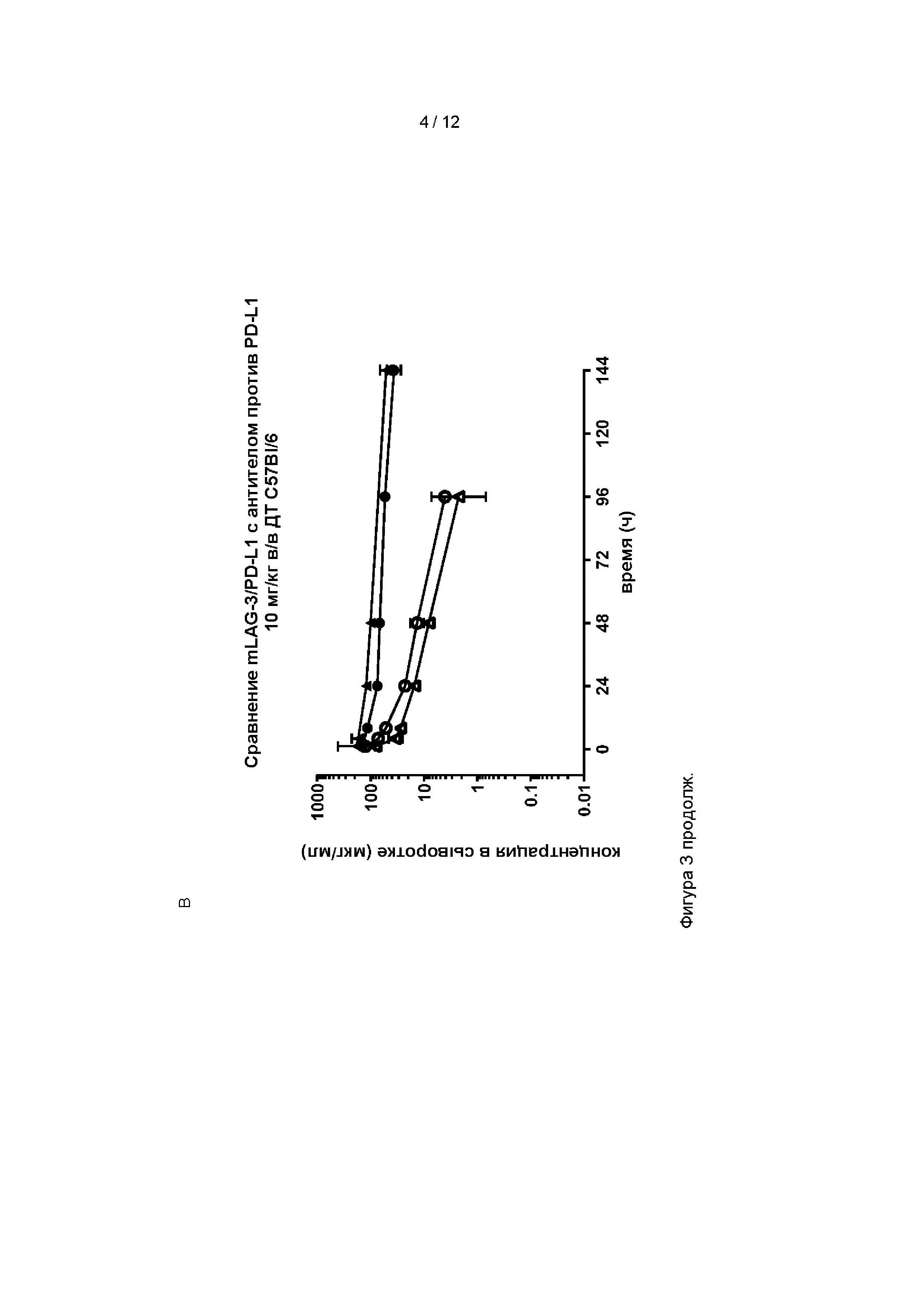 Данные по воздействию в модели сингенной опухоли мыши с суррогатным мАт2 мыши показывают, что для противоопухолевой эффективности непрерывное высокое воздействие FS118 не требовалось, и это сильно отличается от моноспецифичного мАт против PD-L1. В этой модели опухоли дозы суррогатного мАт2 мыши ≥1 мг/кг были ассоциированы с подавлением прогрессирования опухоли, причем влияние доз 3, 10 и 20 мг/кг было статистически значимым. Противоопухолевая эффективность мАт против PD-L1 и суррогатного мАт2 мыши, вводимых в дозе 10 мг/кг каждые 3 дня (3 дозы), и профили воздействия после однократной дозы обеих этих молекул у мышей дт без опухолей показаны на Фигуре 3А. В то время как воздействие мАт против PD-L1 поддерживалось на уровне выше 100 мкг/мл в течение 3-дневного периода, воздействие mLAG-3/PD-L1 за то же время снижалось до приблизительно 10 мкг/мл. Следует отметить, что в модели МС38 минимальное воздействие суррогатного мАт2 мыши снижалось с течением времени, что, возможно, связано с образованием АЛС. При введении дозы 3 мг/кг суррогатного мАт2 мыши каждые 3 дня расчетная Смакс после первой дозы составляла 25 мкг/мл, а наблюдаемая Смакс после последней дозы составляла 6 мкг/мл.