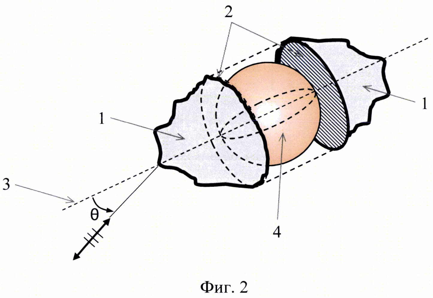 Изобретение относится к области радиолокационной техники и может быть использовано для увеличения эффективной площади рассеяния (ЭПР) объектов. Известен способ увеличения (изменения, искажения образа) ЭПР радиолокационного объекта, состоящий в разделении выпуклого радиолокационного объекта (ВРЛО) ортогонально наиболее вероятному направлению радиоизлучения с образованием не менее двух плоских параллельных поверхностей, отстоящих друг от друга на расстоянии многим больше длины волны радиоизлучения, извлечении заключенных между параллельными плоскостями частей ВРЛО, металлизации образовавшихся плоских поверхностей оставшихся частей и установки между ними крепления из радиопрозрачного материала, жестко удерживающего оставшиеся части ВРЛО. Наиболее близким техническим решением к предлагаемому изобретению является устройство, реализующее указанный способ увеличения ЭПР радиолокационного объекта (RU, патент на изобретение №2640321, МКИ H01Q 15/16, 2017 г. - прототип). Конструкция данного устройства приведена на фиг. 1. Устройство состоит минимум из двух частей ВРЛО 1, с параллельными металлизированными поверхностями 2, отстоящими друг от друга на расстоянии многим больше длины волны радиоизлучения ортогонально наиболее вероятному направлению радиоизлучения 3, жестко удерживаемых радиопрозрачным креплением 4. Достоинством такого устройства является возможность увеличить ЭПР объектов и одновременно получить их ложные радиолокационные портреты. Однако известное устройство обладает рядом недостатков: не обеспечивает увеличение значений ЭПР ВРЛО в широком секторе углов облучения; «неправдоподобно» искажает радиолокационные изображения ВРЛО, делая их чрезмерно протяжёнными за счёт большого числа периодически повторяющихся, убывающих по энергии локальных центров рассеяния. Задачей настоящего изобретения является увеличение эффективной площади рассеяния объектов и получение их ложных радиолокационных изображений. Техническим результатом, обеспечивающим решение указанной задачи, является увеличение мощности отражаемых объектами сигналов с искажением их радиолокационных изображений в геометрических размерах, незначительно превышающих контур объектов. Указанная задача и получение заявленного технического результата достигается за счёт того, что в известном устройстве, реализующем способ увеличения ЭПР радиолокационных объектов, включающем ВРЛО, разделённый двумя отстоящими друг от друга на расстоянии в 10 раз большим длины волны радиоизлучения параллельными плоскостями, ортогональными направлению радиоизлучения и образующие плоские металлизированные поверхности частей ВРЛО, жёстко удерживаемые радиопрозрачным креплением в виде линзы сферической формы из диэлектрика, диэлектрическая проницаемость которой лежит в пределах е ~ 2.. .4 (Кобак В. О. Радиолокационные отражатели. М.: «Сов. радио». 1975. С. 186). Поясним, чем достигается заявленный технический результат, используя теорию и практику применения антенн. Известна двухзеркальная антенна с заполнением пространства между рупором и вспомогательным зеркалом радиопрозрачным диэлектриком (Айзенберг Г.З., Терёшин О.Н., и др., Антенны УКВ. Т.2 М.: «Связь». 1977. С. 30, 31). В основе такого устройства лежит стремление уменьшить утечку энергии рупора через плоскость раск