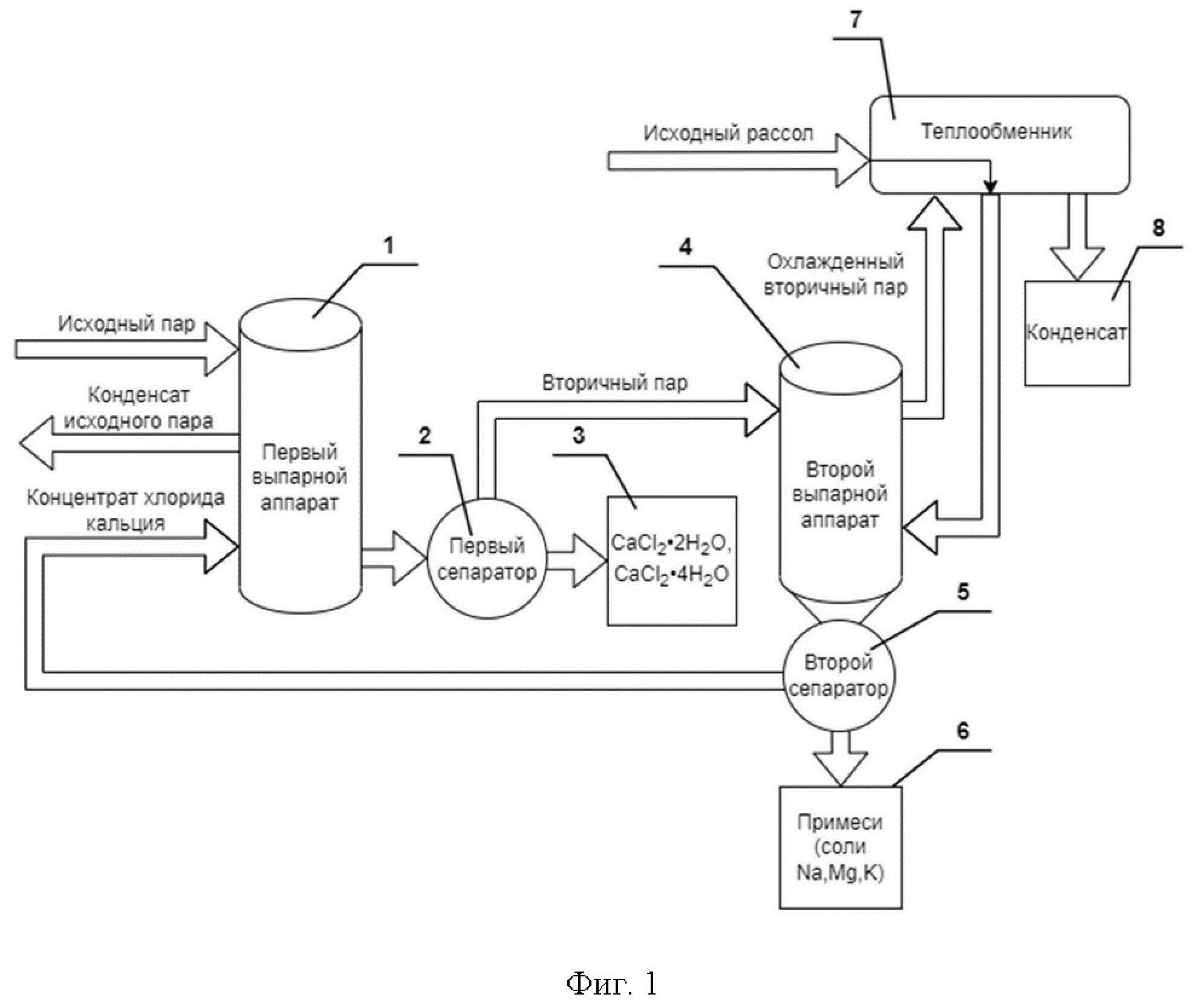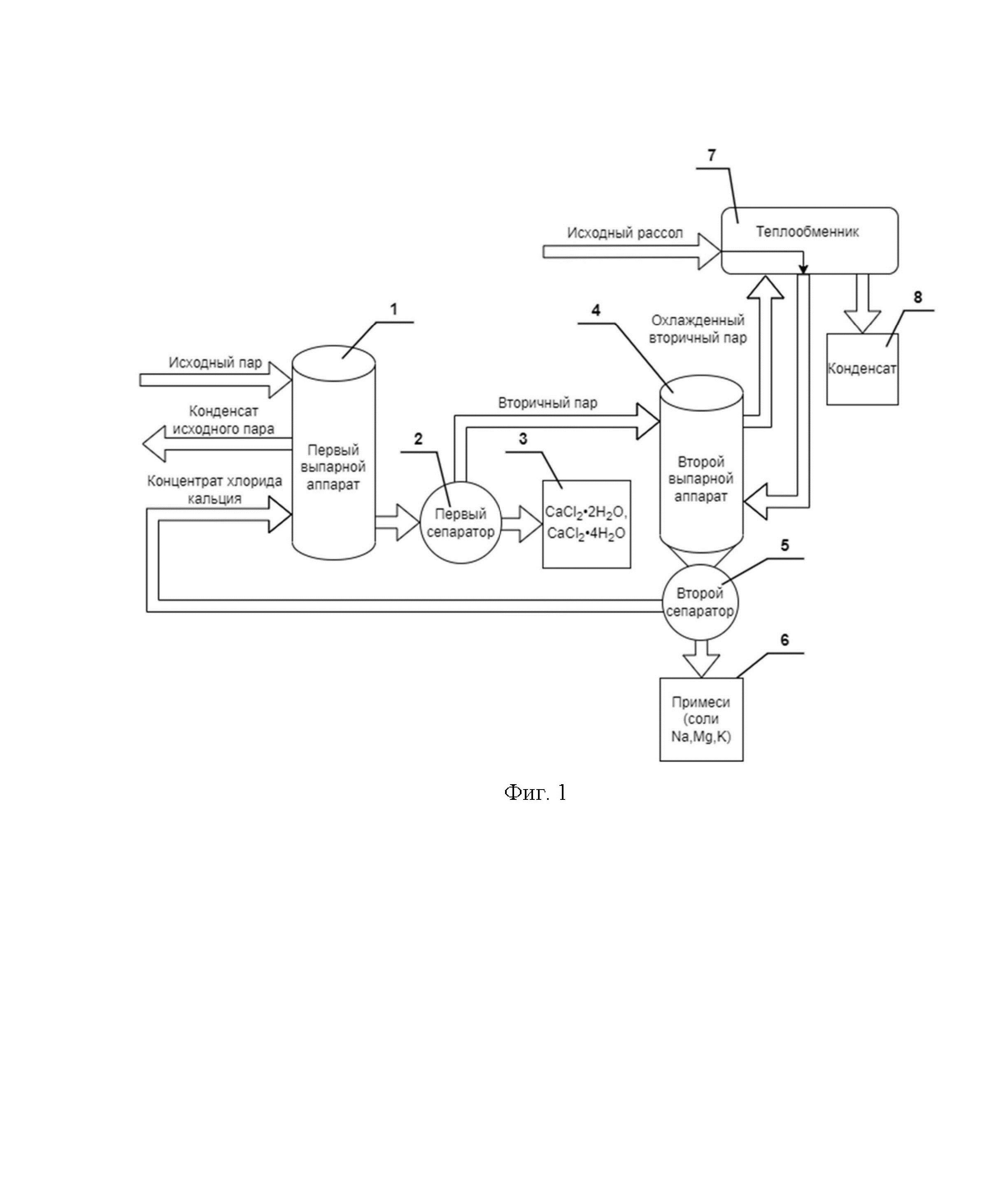 1. Способ получения хлорида кальция из рассола, включающий выпаривание исходного рассола в выпарной установке, включающей по меньшей мере два выпарных аппарата, при этом первичное выпаривание рассола осуществляют на втором выпарном аппарате за счет вторичного пара, получаемого на первом выпарном аппарате, а вторичное выпаривание осуществляют исходным паром на первом выпарном аппарате, в результате чего образуется вторичный пар с пониженной по сравнению с исходным паром температурой, в качестве исходного рассола используют рассол хлоркальциевого типа, содержащий хлорид кальция в количестве более 60% масс. по отношению к примесям других хлоридов - натрия, калия, магния, при выпаривании исходного рассола на втором выпарном аппарате при повышении концентрации солей в рассоле кристаллизуются хлориды натрия, калия и магния, которые отделяют на втором сепараторе с получением твердой фазы и концентрата хлорида кальция, концентрат хлорида кальция направляют на выпаривание на первом выпарном аппарате, где происходит его концентрирование с выпадением в осадок хлорида кальция, осадок сепарируют от пара на первом сепараторе с получением кристаллогидрата хлорида кальция. 2. Способ по п.1, отличающийся тем, что твердую фазу, отделенную после первичного выпаривания и содержащую хлориды натрия, калия и магния, направляют на ступенчатую промывку с растворением сначала хлорида магния, затем хлорида калия и последующим отделением кристаллического материала от маточного раствора, при этом для растворения хлорида калия используют горячую воду, хлорид калия выделяют из раствора путем охлаждения. 3. Способ по п.1, отличающийся тем, что хотя бы один сепаратор для разделения на жидкую и твердую фазу выполнен в виде отстойника, центрифуги или ленточного фильтра. 4. Способ по п.1, отличающийся тем, что после разделения жидкой и твердой фазы хотя бы на одном сепараторе дополнительно осуществляют отделение твердой фазы от жидкой на центрифуге или ленточном фильтре. 5. Способ по п.1, отличающийся тем, что полученный кристаллогидрат хлорида кальция сушат в сушильном шкафу до получения кальцинированного хлорида кальция. 6. Способ получения хлорида кальция из рассола, включающий выпаривание исходного рассола в выпарной установке, включающей по меньшей мере два выпарных аппарата, первичное выпаривание рассола осуществляют на втором выпарном аппарате за счет вторичного пара, получаемого на первом выпарном аппарате, а вторичное выпаривание осуществляют исходным паром на первом выпарном аппарате, в результате чего образуется вторичный пар с пониженной по сравнению с исходным паром температурой, в качестве исходного рассола используют рассол хлоркальциевого типа, содержащий хлорид кальция в количестве более 60% масс. по отношению к примесям других хлоридов - натрия, калия, магния, при выпаривании исходного рассола на втором выпарном аппарате при повышении концентрации солей в рассоле кристаллизуются хлориды натрия, калия и магния, которые отделяют на втором сепараторе с получением твердой фазы и концентрата хлорида кальция, концентрат хлорида кальция направляют на выпаривание на первом выпарном аппарате, где происходит его концентрирование с выпадением в осадок хлорида кальция, осадок сепарируют от пара на первом сепараторе с получением к
