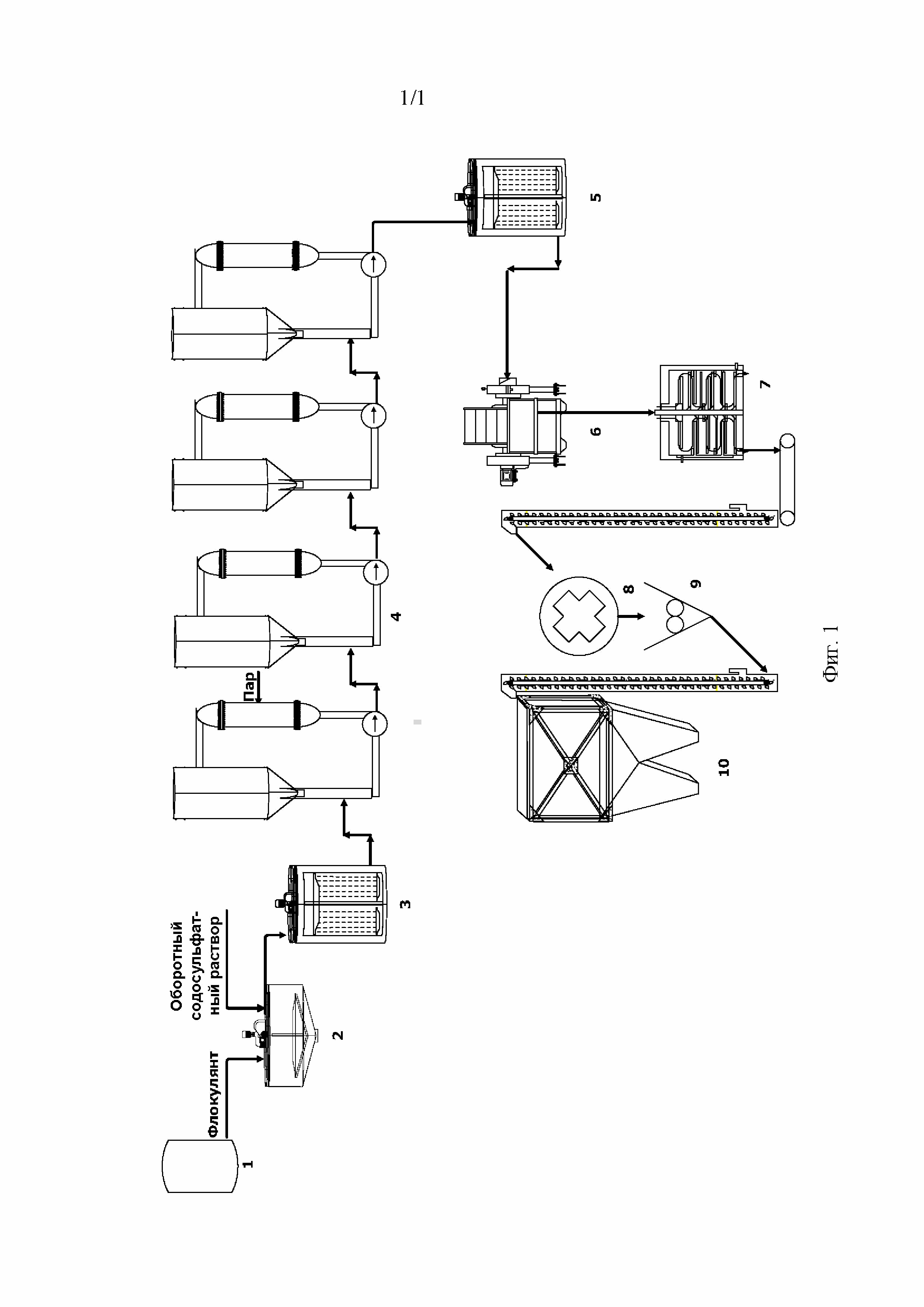 Изобретение относится к цветной металлургии и может быть использовано для получения товарной продукции из отходов, образующихся при мокрой газоочистке отходящих газов от остатков фтористого водорода и диоксида серы с электролизных корпусов производства алюминия. Способ включает обесфторивание раствора с выделением вторичного криолита, его последующее осветление реагентом для снижения взвеси фторсолей и шлама газоочистки с получением осветленного раствора. Упаривание осветленного раствора до появления твердой фазы и фильтрацию полученной пульпы содосульфатной смеси. При этом осветление осуществляют синтетическим флокулянтом, а фильтрацию пульпы содосульфатной смеси совмещают с её промывкой холодной технической водой с отделением фильтрата и осадка содосульфатной смеси, который направляют на сушку, причем высушенный осадок содосульфатной смеси для повышения коэффициента белизны измельчают до крупности минус 200 мкм. Обеспечивается получение содосульфатной смеси с высоким коэффициентом белизны и низким показателем желтизны. 4 з.п. ф-лы, 1 ил., 3 табл.