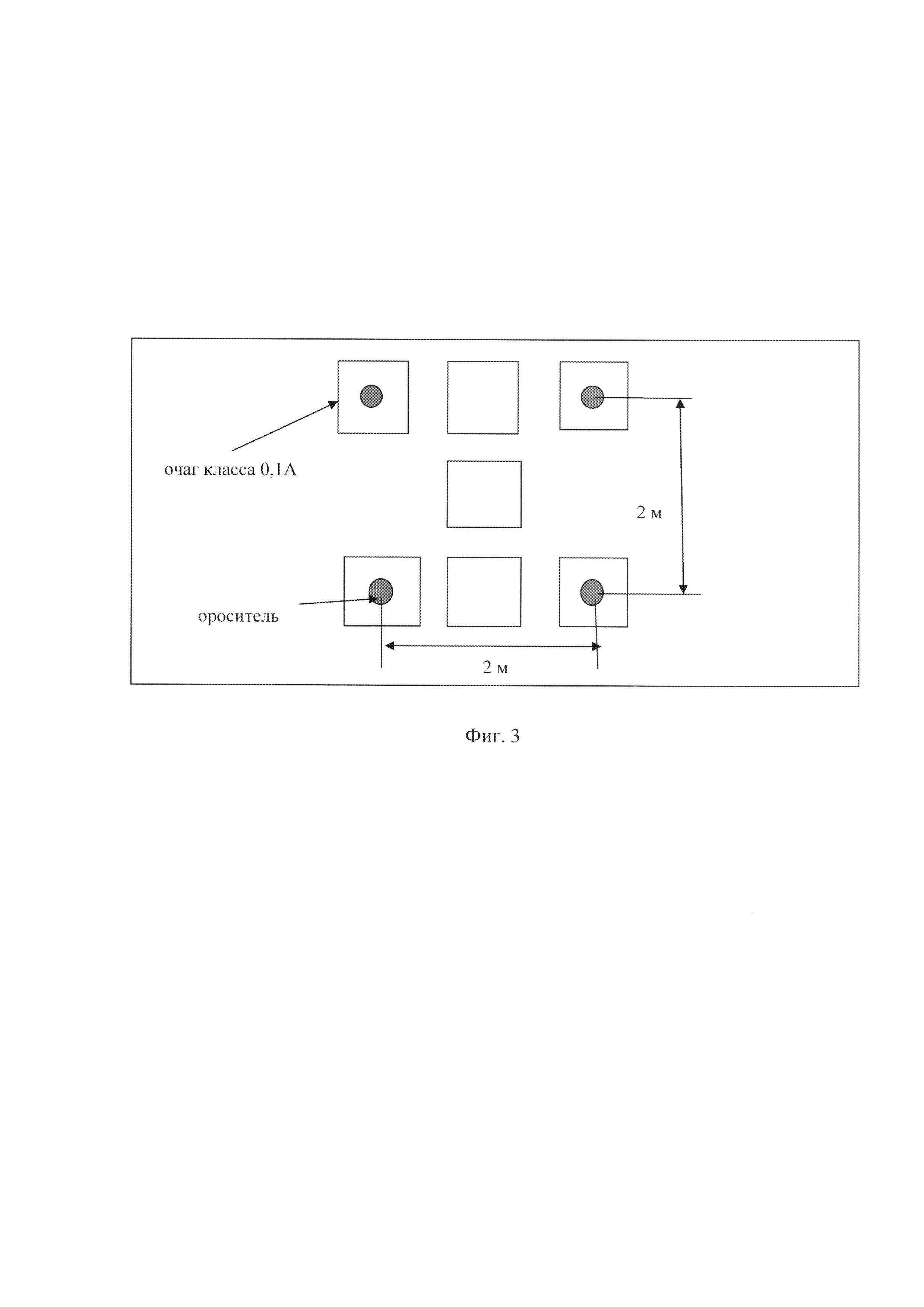 Для моделирования верхового лесного пожара (фиг. 2) выбраны очаги, состоящие из пяти штабелей деревянных брусков (каждый штабель - очаг 1A), расположенных в шахматном порядке с соблюдением расстояний, представленных на фиг. 2. Площадь очага 6,25 м2. Удельная пожарная нагрузка - 24 кг⋅м2, удельное тепловыделение - 2 МВт⋅м2.