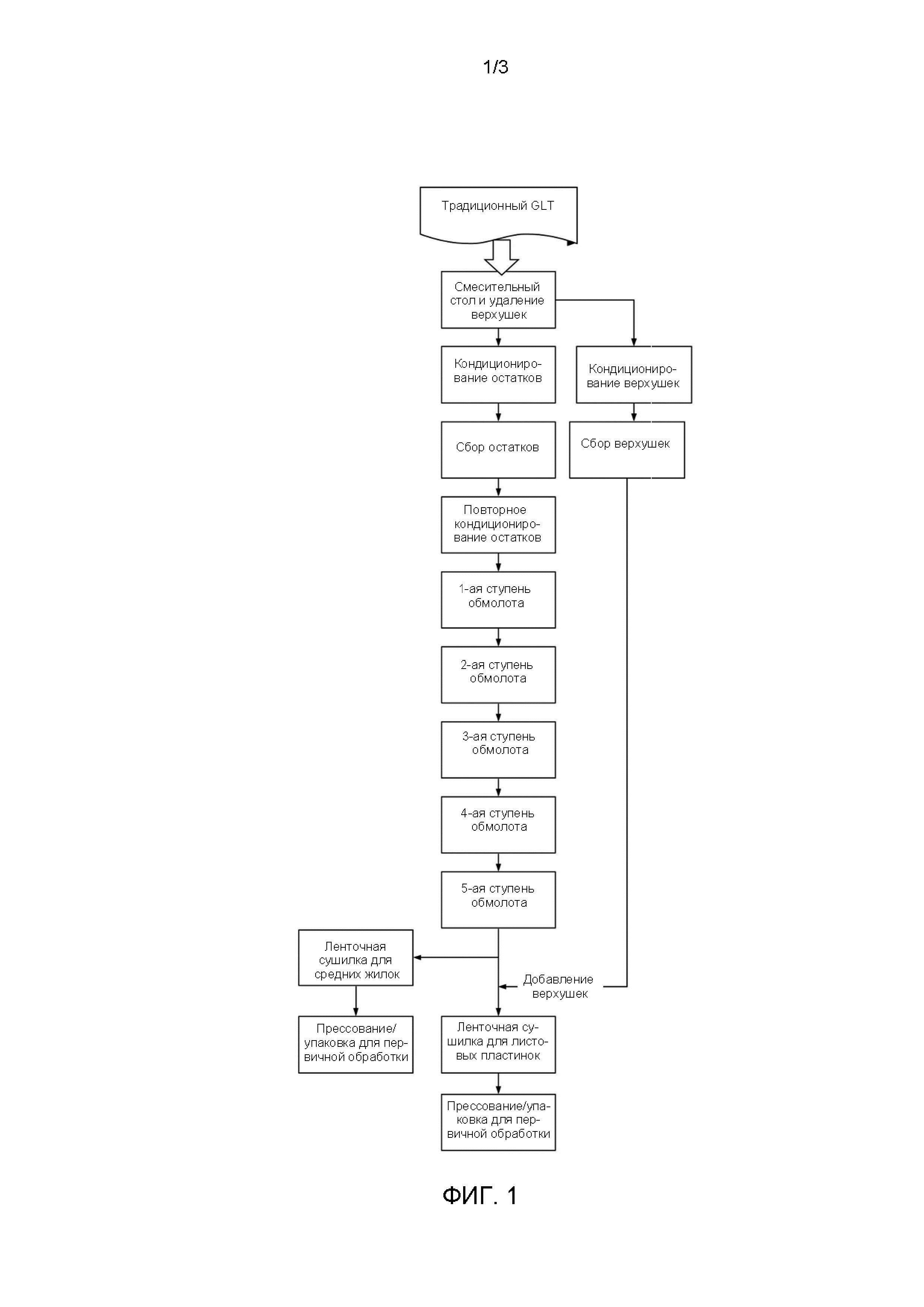 [01] В целом, настоящее изобретение относится к сектору производства и переработки табака и, в частности, к способу производства резаного табака для сигарет и других изделий из зеленых табачных листьев посредством инновационной интеграции процессов обмолота зеленых листьев (GLT) и первичной обработки с меньшими инвестициями и меньшими производственными затратами и при этом производства резаного табака с высокой заполняющей способностью при сохранении примерно такого же вкуса и аромата, как у исходного табака.