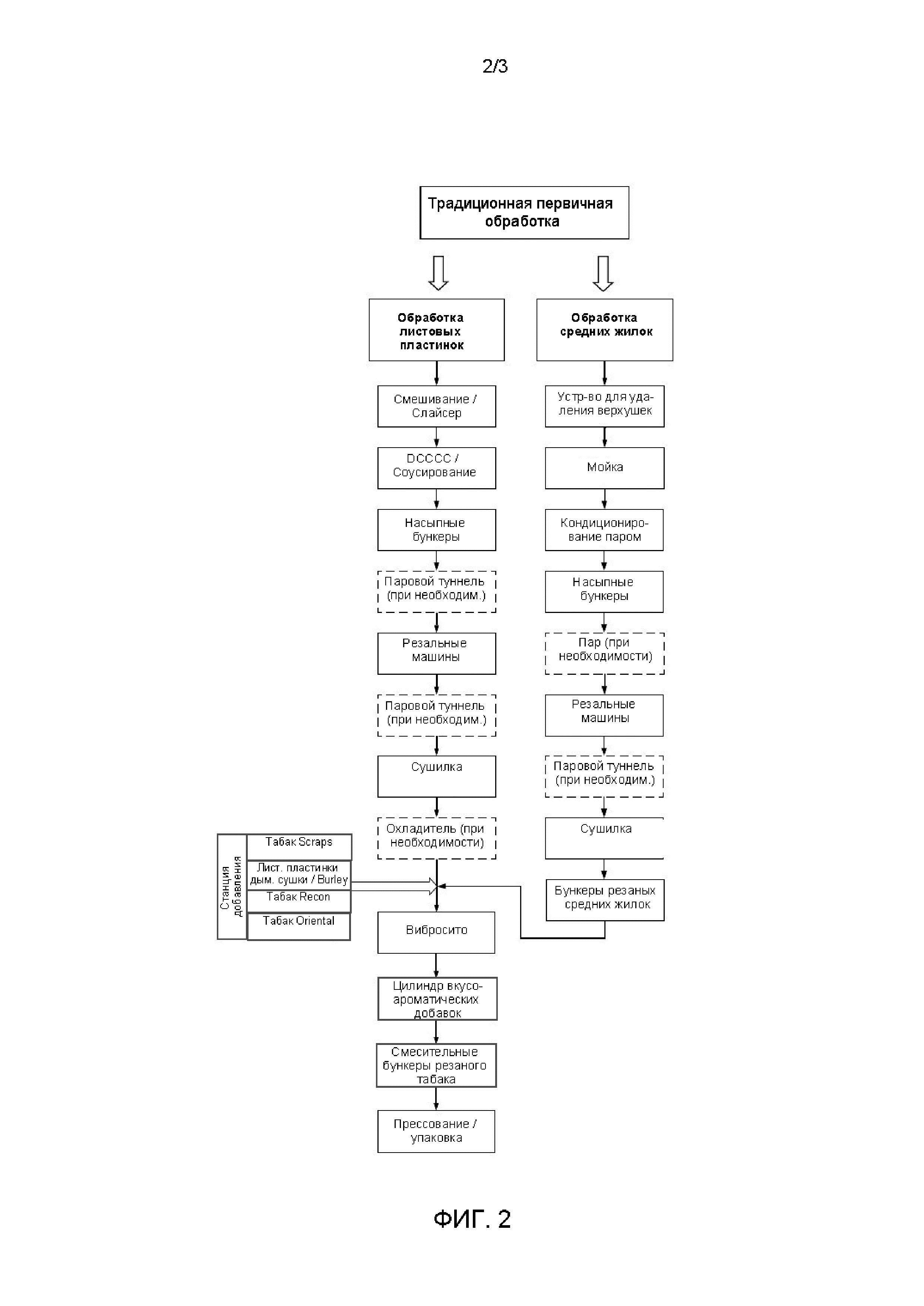 - Существующие традиционные первичные обработки (Фиг. 2) при установке соответствующих линий добавок могут увеличить существующую производительность первичной обработки на 10-100% посредством использования резаного табака согласно изобретению, произведенного где-либо в любой точке мира, с увеличенной заполняющей способностью, улучшенным ситовым анализом и более низкой стоимостью. Эта альтернатива может потребовать определенных дополнительных инвестиций, таких как увеличение вместимости бункера, производительности пресса и т.д., чтобы должным образом сбалансировать общий потенциал первичной обработки.