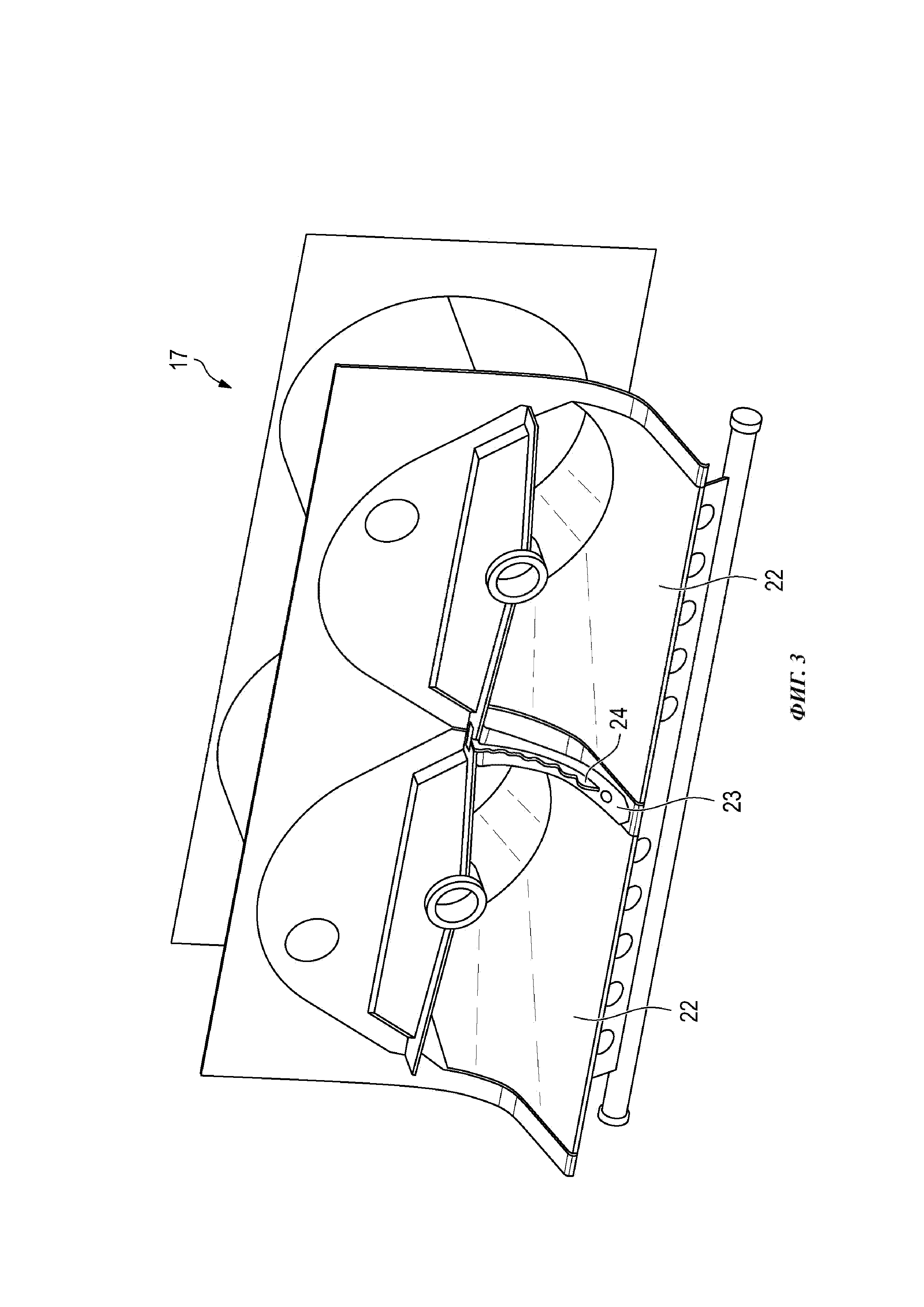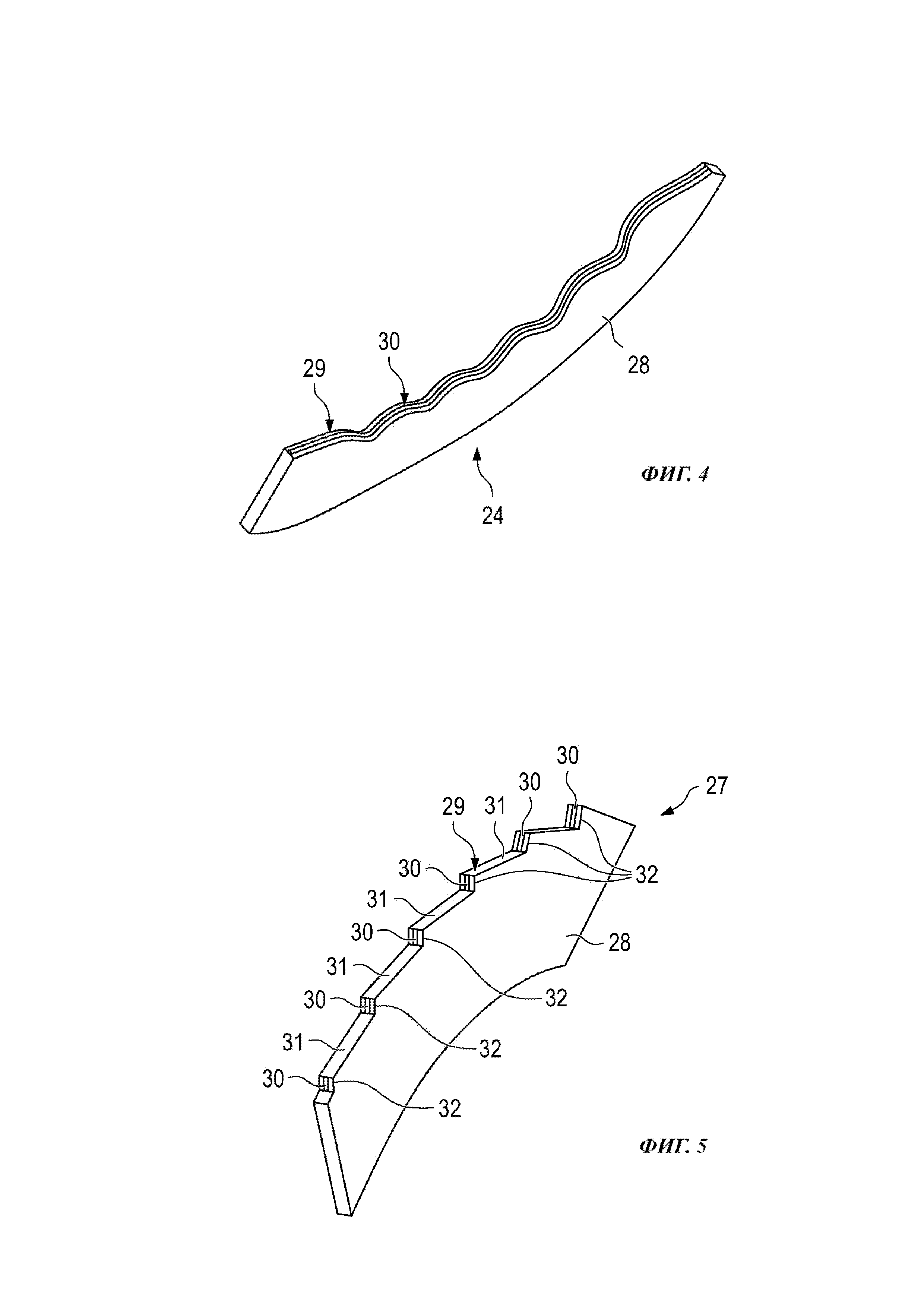 1. Сепарирующее устройство (6) зерноуборочного комбайна, содержащее кожух (17) впускной головки, подающий барабан (5) и два осевых сепарирующих ротора (8), которые одним концом частично входят в кожух (17) впускной головки, причем кожух (17) впускной головки содержит плоские входные участки (22), каждый из которых проходит по ширине соответствующего осевого сепарирующего ротора (8), между которыми расположен участок (23) кожуха в форме рампы, ориентированный параллельно направлению подачи осевых сепарирующих роторов (8) и поддерживающий разделение потока убираемой культуры, поступающего из подающего барабана (5), на частичные потоки, подаваемые в осевые сепарирующие роторы (8), причем участок (23) кожуха в форме рампы снабжен по меньшей мере одним разделительным элементом (24, 27), изготовленным по меньшей мере из одного первого материала, отличающееся тем, что по меньшей мере один разделительный элемент (24, 27) содержит основной корпус (28), ориентированный перпендикулярно поверхности участка (23) кожуха, и торцевую поверхность (29), частично выполненную в виде режущей кромки, причем на торцевой поверхности (29) по меньшей мере частично нанесено покрытие (30) из износостойкого второго материала, расположенное, по существу, по центру в продольном направлении торцевой поверхности (29), при этом покрытие (30) выполнено в виде полосы или ленты, ширина которой меньше общей ширины торцевой поверхности (29). 2. Устройство (6) по п. 1, отличающееся тем, что первый материал представляет собой высокопрочную сталь, а второй материал – композиционный материал с металлической матрицей. 3. Устройство (6) по п. 1 или 2, отличающееся тем, что покрытие (30) нанесено методом наплавки сваркой. 4. Устройство (6) по одному из пп. 1-3, отличающееся тем, что торцевая поверхность (29) имеет, по существу, волнистый или пилообразный профиль. 5. Устройство (6) по п. 4, отличающееся тем, что покрытие (30) нанесено по всему продольному протяжению торцевой поверхности. 6. Устройство (6) по одному из пп. 1-3, отличающееся тем, что торцевая поверхность (29) имеет, по существу, зубчатый профиль, причем зубчатый профиль образован чередующимися, по существу, горизонтальными участками (31), ориентированными в продольном направлении разделительного элемента (24, 27), и участками (32), ориентированными, по существу, перпендикулярно этим участкам. 7. Устройство (6) по п. 6, отличающееся тем, что покрытие (30) нанесено только на вертикальные участки (32), ориентированные, по существу, перпендикулярно горизонтальным участкам (31). 8. Устройство (6) по одному из предыдущих пунктов, отличающееся тем, что подающий барабан (5) в области участка (23) кожуха в форме рампы снабжен разделительными элементами (27), последовательно расположенными в окружном направлении. 9. Устройство (6) по п. 8, отличающееся тем, что каждые два разделительных элемента (27) подающего барабана (5) расположены парным образом рядом друг с другом, причем разделительные элементы (27) каждой пары сходятся друг к другу в направлении (DR) вращения подающего барабана (5). 10. Зерноуборочный комбайн (20) с сепарирующим устройством (6), отличающийся тем, что сепарирующее устройство (6) выполнено в соответствии с одним из предыдущих пунктов.