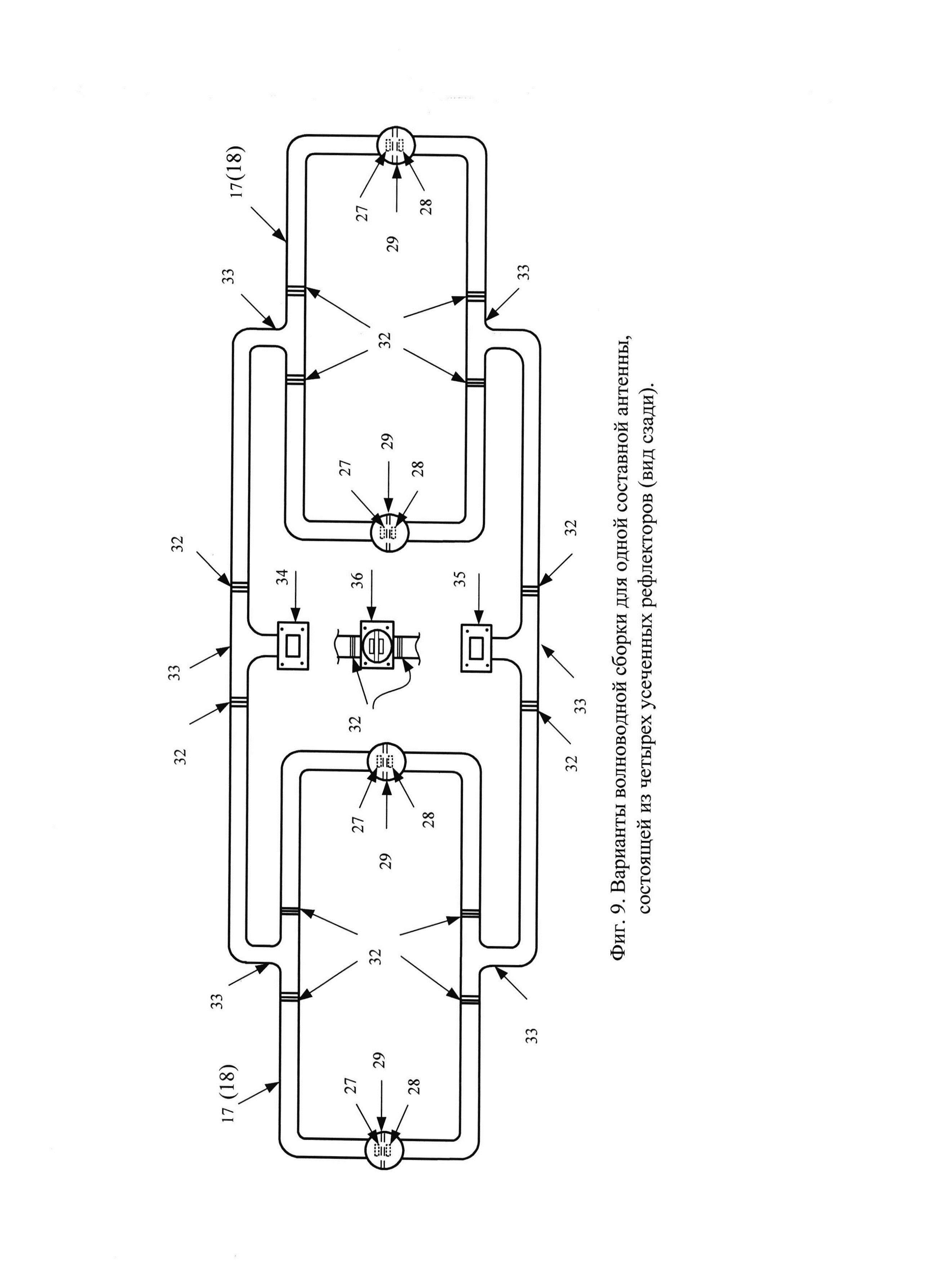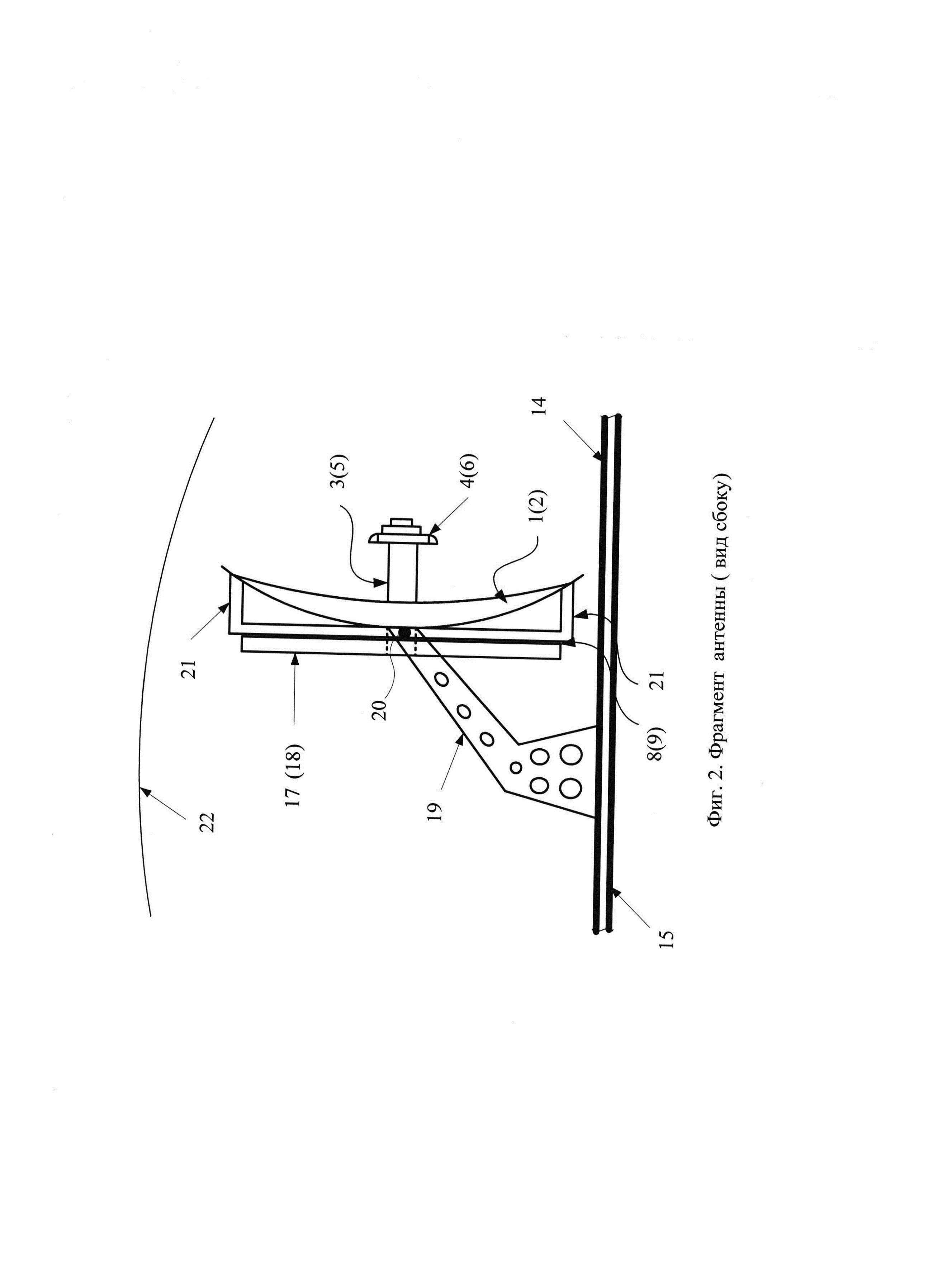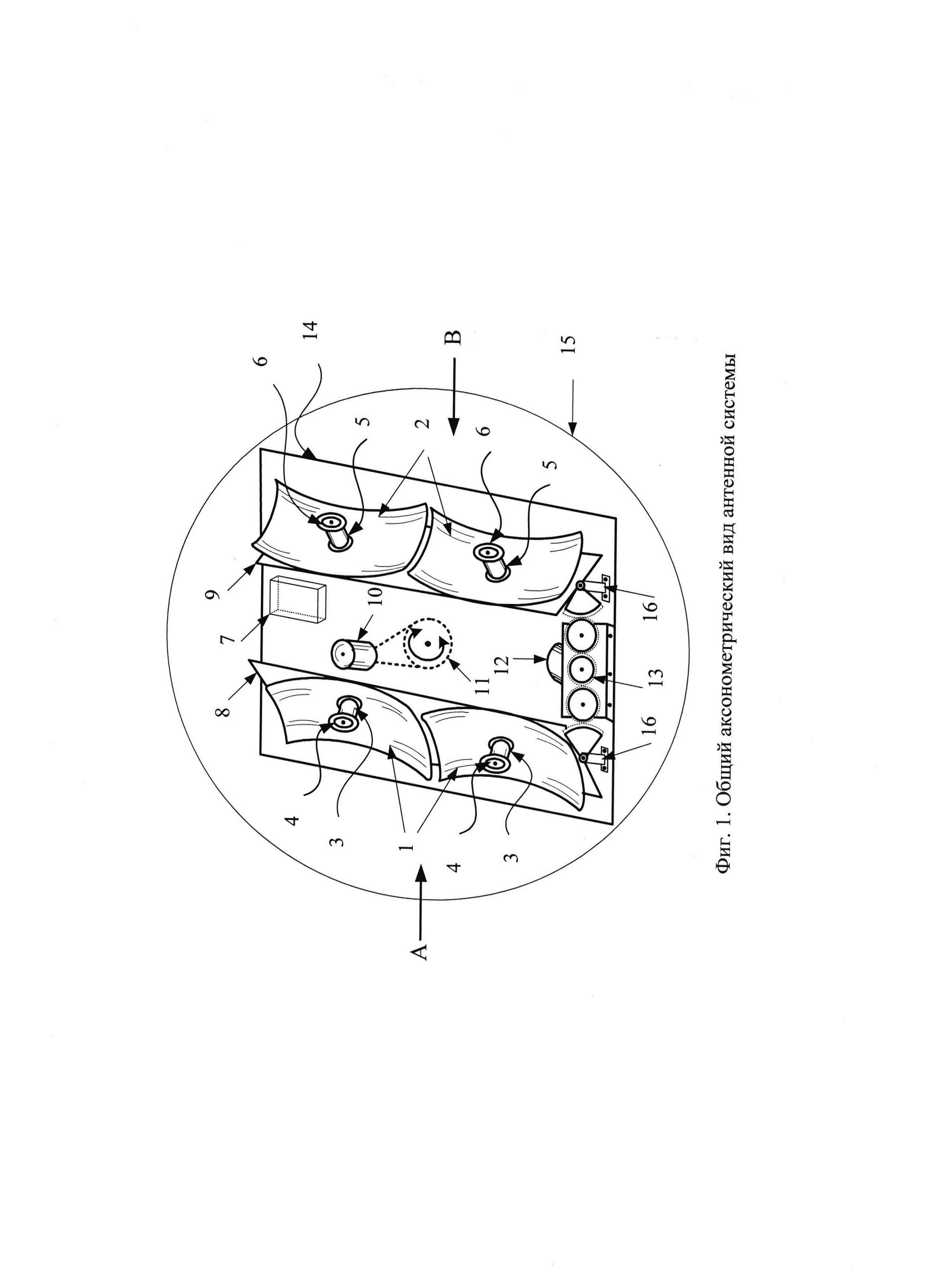 Изобретение относится к области антенных средств связи и может быть использовано для организации каналов спутниковой связи как на неподвижных, так и подвижных объектах, например, на самолетах, поездах, автомобилях и др. Потребности в услугах подвижной спутниковой связи SOTM (Satcom-On-The-Move) постоянно растут, и для их удовлетворения необходима организация высокоскоростных каналов в различных спутниковых частотных диапазонах, например, Ku и Ka с улучшенными электродинамическими характеристиками и малыми габаритами оборудования. Благодаря усовершенствованию приемо-передающего оборудования, используемого на спутниках связи, таких как HTS (High Throughput Satellites), на землю передаются более мощные сигналы, что позволяет использовать антенны с электромеханическим управлением диаграммой направленности и с жесткими требованиями к массогабаритным характеристикам. В свою очередь это способствует созданию низкопрофильных антенных систем для качественного приема и передачи сигналов в различных частотах спутникового диапазона и оснащения системами спутниковой связи транспортных средств различного типа. Одним из направлений решения задачи создания низкопрофильных антенных систем является применение в их составе усеченных параболических рефлекторов, которые просты в изготовлении, и имеют небольшие габариты. Известна [1 - Патент US №6,950,073 В2 "Communication system with broadband antenna" с приоритетом 27.09.2005 г.] система связи, включающая антенную решетку с питающей сетью, подключенной к коммуникационной электронике и содержащую множество антенн, каждая из которых приспособлена для приема информационного сигнала, и множество кросс поляризационных селекторов ОМТ, соединенных с соответствующими преобразователями из множества антенн, каждый ОМТ приспособлен для обеспечения первого компонентного сигнала, имеющего первую поляризацию, и второго компонентного сигнала, имеющего вторую поляризацию. Подсистема связи также содержит сеть подачи, которая принимает первый компонентный сигнал и второй компонентный сигнал от каждого кросс поляризационного селектора и выдает первый суммированный компонентный сигнал на первый порт подачи и второй суммированный компонентный сигнал на второй порт подачи, и устройство коррекции фазы, подключенное к первому и второму портам подачи адаптированное для согласования фазы первого суммированного компонентного сигнала со вторым суммированным компонентным сигналом. Недостатком данной антенны являются сложность изготовления линзовых антенн и их высокая стоимость. Известна [2 - Патент US №9,318,810 В2 "Ring focus antenna" с приоритетом 2.04.2015 г.] антенна для использования в мобильных и портативных спутниковых антенных системах, которая способна принимать/передавать сигналы с круговой и линейной поляризацией. Антенна включает в себя вогнутый основной рефлектор параболической формы, имеющий фокальный круг вокруг оси. Круглый волноводный рупор отходит от основного рефлектора концентрично этой оси. За дистальным концом рупора волновода установлен субрефлектор, при этом между субрефлектором и дистальным концом круглого рупора волновода остается кольцевой зазор. Недостатком данной антенны являются низкий коэффициент усиления сигнала и большая высота профиля. Известно [3 - Патент RU №2296397 С2 "Антенно-фидерное устройство и антенна, входяща
