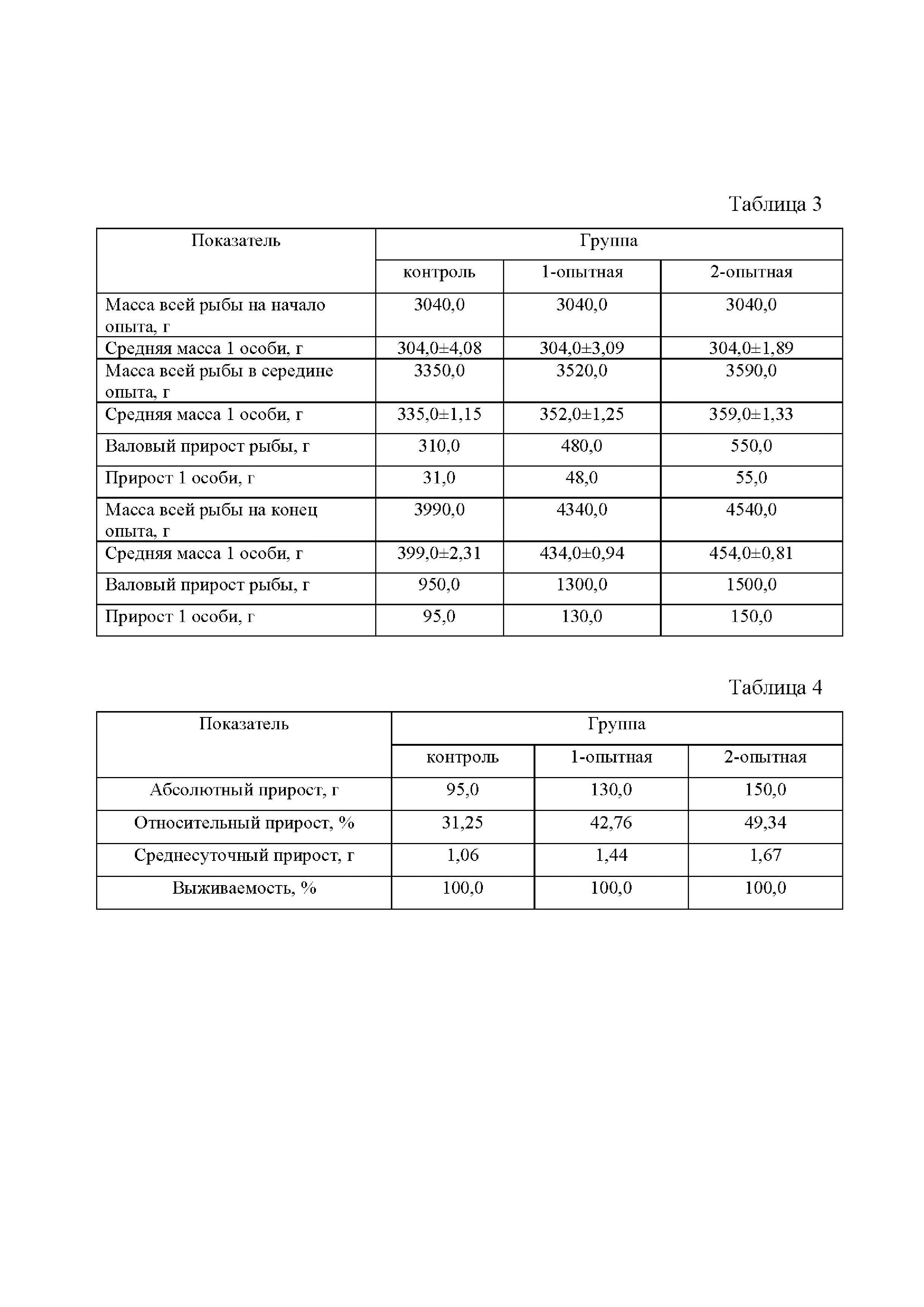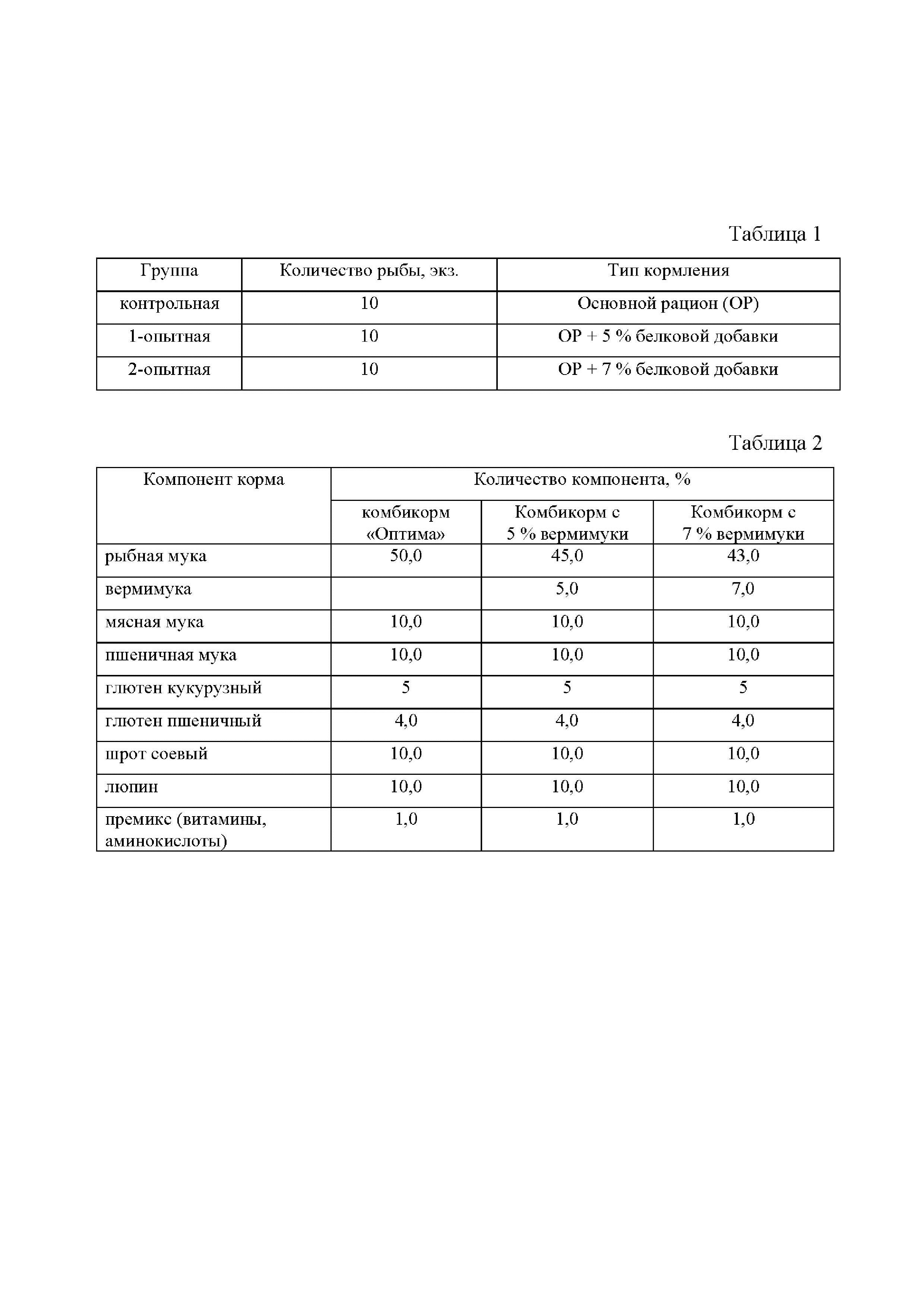 Изобретение относится к области сельского хозяйства, в частности к кормопроизводству в аквакультуре. Для производства белковой кормовой добавки используют гибрид дождевого черв Изобретение относится к области сельского хозяйства, в частности к кормлению и кормопроизводству в аквакультуре. Известны комбикорма с белковой добавкой из протеиновых зеленых концентратов, полученных из травяного сока рапса, представляющие собой концентрат белка, в количестве от 6,6 до 8,25% (патент № 2579767 RU от 18.06.2016, МПК 50/80; А23К 10/20; А23К 10/30; А23К 20/174). Однако, данное изобретение применяется только у карповых рыб, имеет растительное происхождение и ограничено к применению у осетровых рыб. Известны комбикорма с белковой добавкой «Агро-Матик», состоящей из муки бобов белого люпина и мясокостной муки птицы для лососевых рыб (патент № 2762722 С1 RU от 22.12.2021, МПК А23К 50/80; А23К 10/20; А23К 10/30). Однако, данное изобретение имеет недостаток, связанный с отсутствием рыбной муки, которая является основным источником легкоусвояемого протеина. Известен способ производства белково-витаминной кормовой муки из гибрида красного калифорнийского дождевого червя и вермикомпостированных яблочных выжимок, выбранный за прототип (патент № 2470521 С2 RU от 27.12.2012, МПК А23К 1/00), включающий введение дождевых червей в субстрат из яблочных выжимок, вермикомпостирование, последующие сушку и измельчение, отличающийся тем, что измельченный субстрат, увлажненный до 80-90%, размещают буртами на открытых площадках, при температуре не ниже 15°С, или в отапливаемом помещении, заселяют червями и вермикомпостируют в течение 20 суток, сушат червей и вермикомпост конвективным методом в течение 2 ч при температуре 21° и в течение 2 ч при температуре 24-27° в вакууме, полученную сухую массу измельчают на мельнице до размера частиц 0,02-0,03 мм. Однако данный способ предусматривает использование калифорнийского дождевого червя, отличающийся неустойчивостью к низким температурам и переходу к другим видам корма. Технической задачей заявляемого изобретения является разработка способа получения кормовой белковой добавки из гибрида дождевого червя «Владимировский Старатель» для альтернативной замены рыбной муки в комбикормах для осетровых рыб. Техническим результатом является разработка оптимальной дозировки белковой кормовой добавки из вермикультуры для комбикормов осетровых рыб, поддерживающей все ростовые и обменные процессы на высоком уровне, приводящие к получению высокой продуктивности и хорошего качества товарной продукции. Техническая задача решается, а технический результат достигается в белковой кормовой добавке из дождевого червя для выращивания осетровых рыб, характеризующейся тем, что для производства белковой кормовой добавки используется гибрид дождевого червя «Владимирский Старатель». Добавку получают путем высушивания дождевого червя при температуре 60°С в течение 12 часов в термостате и размельчения до состояния муки, которую вводят в комбикорм в количестве 5-7%, заменяя аналогичное количество рыбной муки. Введение муки из дождевого червя не влияет на морфо-гранулометрические и питательные свойства корма, способствуют полному поеданию корма с кормовой добавкой, обладающей аттрактантными свойствами, обеспечивающими пищевую привлекательность корма, а процесс усвоения питательных 