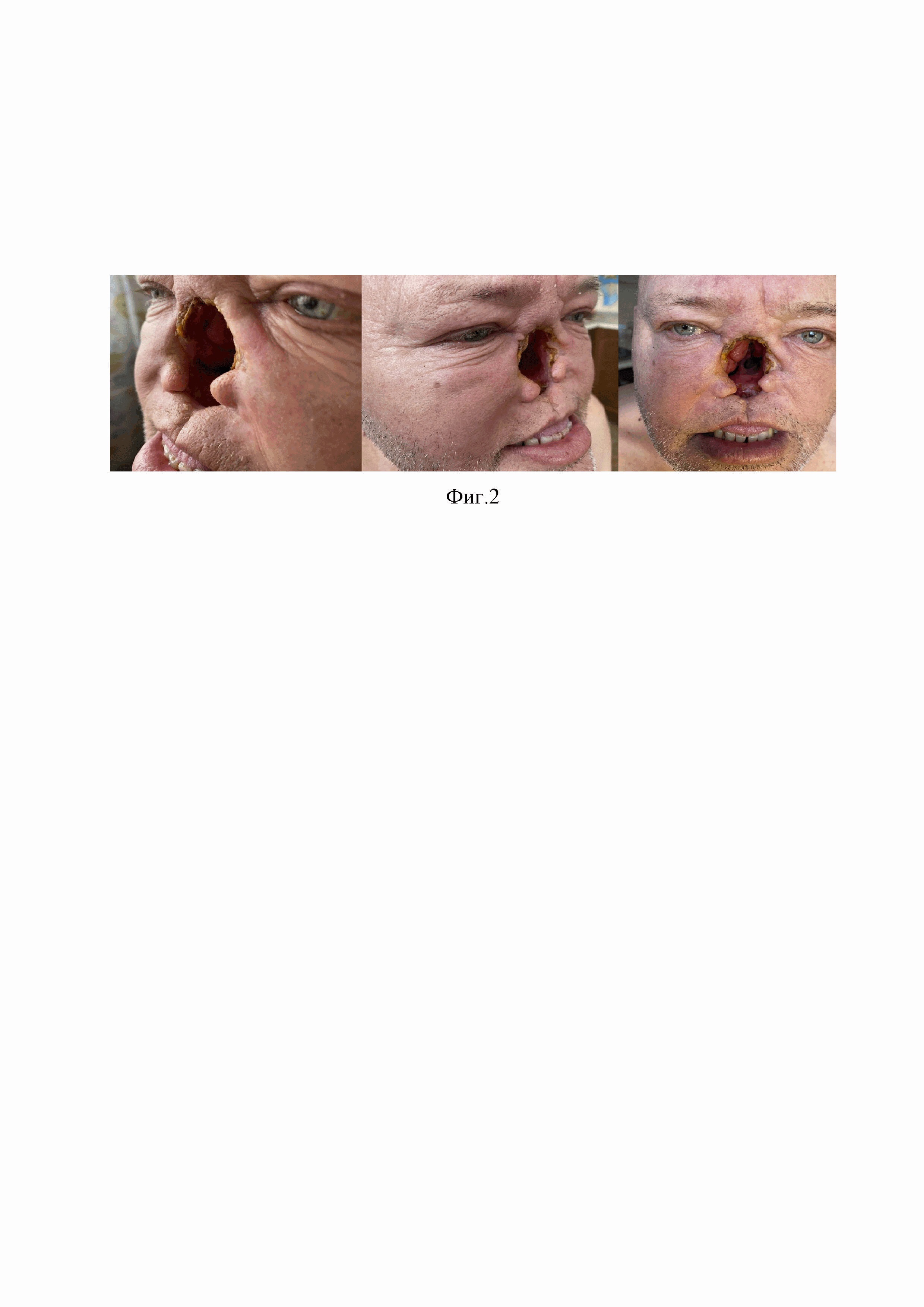 Изобретение относится к медицине, а именно к реконструктивной хирургии, и может быть использовано в онкологии, травматологии, ортопедии при выполнении тотальной реконструкции наружного носа. По данным статистики на 2018 г., заболеваемость злокачественными онкологическими заболеваниями в Российской Федерации составила 624709 случаев. Прирост этого показателя по сравнению с 2017 г. составил 1,2% [1]. Рак области головы и шеи – одна из самых распространенных форм рака, находящаяся на восьмом месте в структуре смертности от онкологических заболеваний. Согласно эпидемиологическим исследованиям, заболеваемость орофарингеальной плоскоклеточной карциномой в последнее время выросла. Злокачественные новообразования придаточных пазух носа составляют <5% всех новообразований головы и шеи, с частотой 0,5-1,0 на 100 000 человек [2]. Пациентам со злокачественными образованиями нередко выполняется частичная либо тотальная ринэктомия, зачастую производимая с захватом окружающих тканей. Деформация, вызванная потерей носа и окружающих структур, вызывает не только психологические проблемы и проблемы социальной адаптации у пациентов, но и может приводить к нарушению таких важных функций как дыхание, жевание и речь. Соответствующее лечение способствует реабилитации пациентов, компенсации утраченных функций, адаптации в социальной среде и улучшению качества их жизни. Зачастую оперативное лечение таких пациентов носит комплексный характер: хирургическое лечение разбито на несколько этапов, привлечены специалисты из разных специальностей в условиях, когда ресурсы для реконструкции ограничены, а потребность в квалифицированной помощи высока. Оно является вызовом как для врачебной бригады, так и для пациента. Тотальная реконструкция носа и окружающих анатомических структур – наиболее подходящая опция для таких пациентов. Специально для этих целей в 1970-х в Китае был представлен лучевой лоскут для комплексной реконструкции назо-оральных дефектов [3]. С тех пор лучевой лоскут – один из наиболее часто используемых лоскутов для закрытия дефектов носа, поскольку с его помощью возможна реконструкция как наружных дефектов, так и дефектов слизистых оболочек [4,5]. Лучевой лоскут также был описан в сложенномварианте, предназначенном для одновременного закрытия дефекта кожи и слизистой оболочки, например, при полнослойных дефектах щек и губ [6,7]. Реконструкция тотальных дефектов носа подразумевает восстановление кожи, хрящевой ткани и слизистой оболочки. В этой связи может потребоваться перенос лоскута с применением микрохирургической техники [8-10]. Одним из таких вариантом и стал лучевой лоскут [11, 12]. Гибкая кожа без волосяного покрова с богатой и надежной васкуляризацией позволяет создавать различные трехмерные конструкции для реконструкции мягкого неба [13-16], обеспечивая создание внутренней оболочки носа [10,11]. Существующие методики реконструкции тотальных и субтотальных дефектов наружного носа включают: экзопротезирование, микрохирургические лоскутные методики и комбинированные методы. Устранение дефекта с помощью экзопротеза позволяет получить сравнительно быстрый, стойкий и предсказуемый результат, однако пациент не ощущает протез как часть своего тела. Также необходимо ежедневно проводить гигиенические процедуры протезного ложа и с