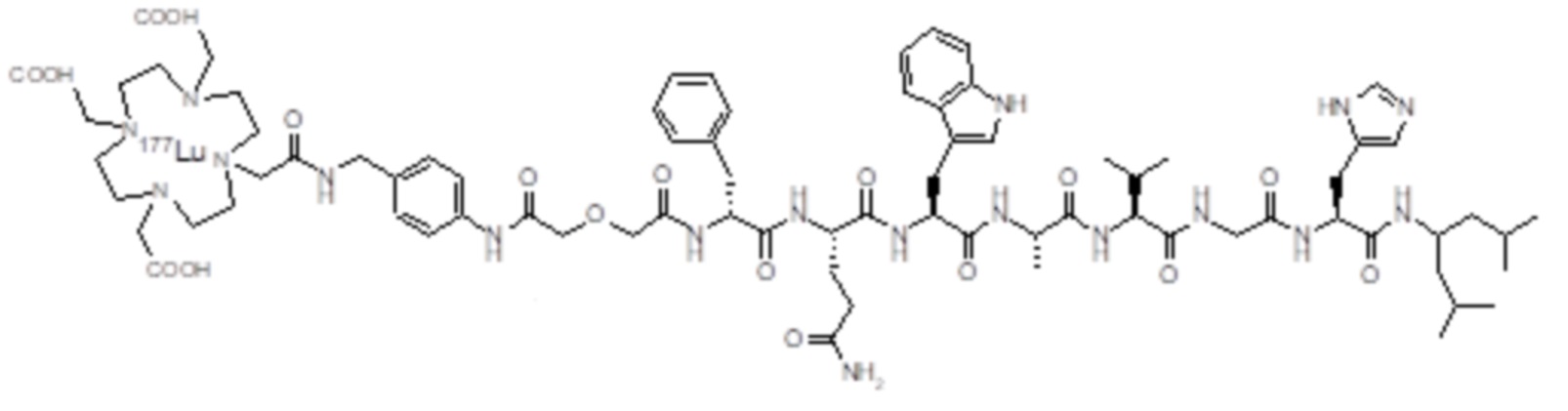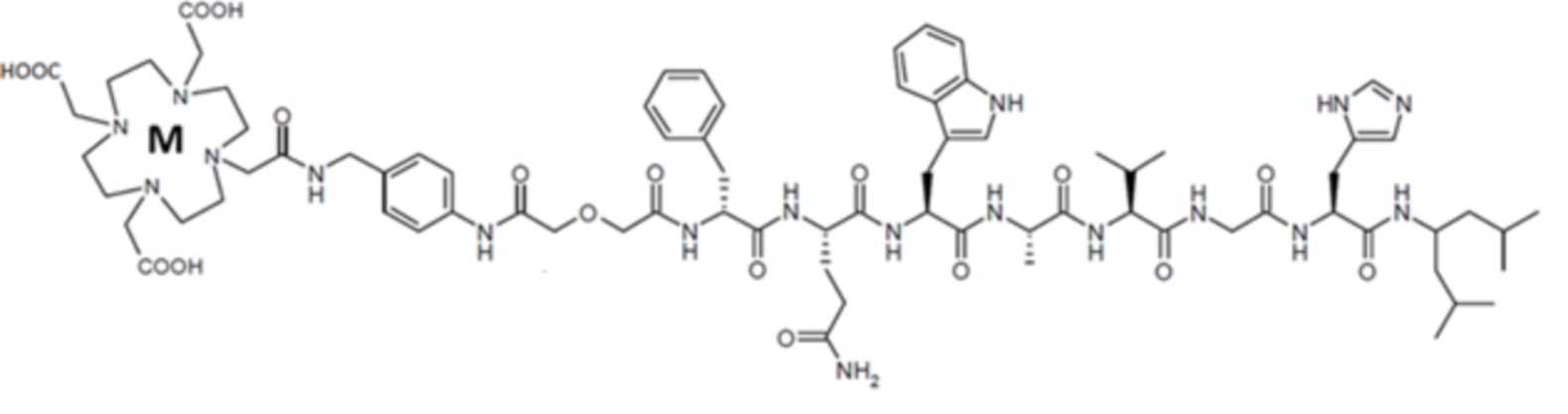 Настоящее изобретение относится к области диагностики и лечения онкологического заболевания, а именно к соединению, имеющему структуру где M представляет собой177Lu или68Ga. Изобретение также относится к лекарственному средству и терапевтической композиции на основе указанного соединения. Изобретение позволяет обеспечить высокую степень захвата и удерживания диагностической и терапевтической радиоактивной метки селективно по отношению как к первичному, так и метастатическому GRPR+ онкологическому заболеванию. 4 н. и 2 з.п. ф-лы, 8 ил., 1 пр.