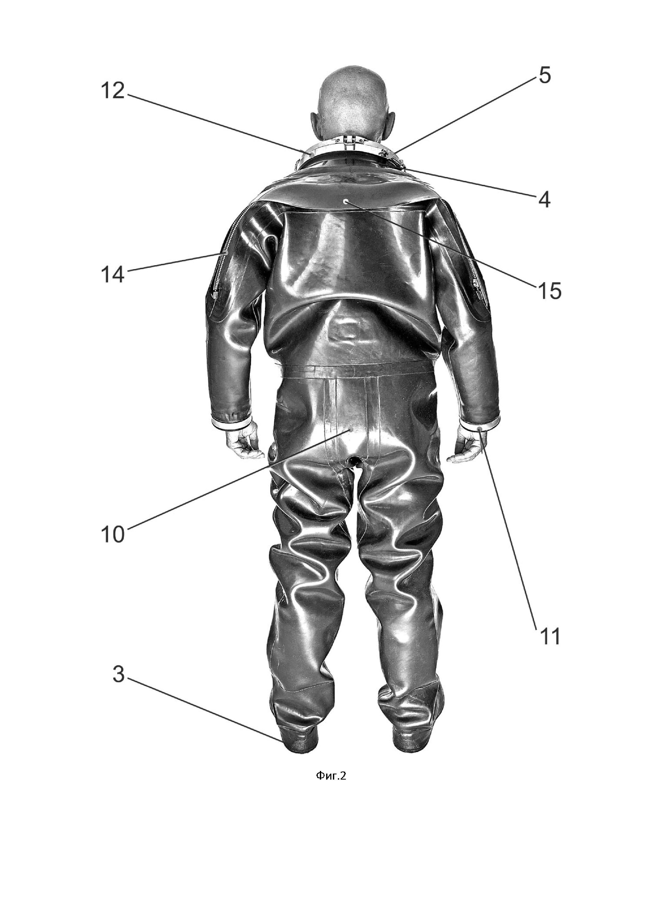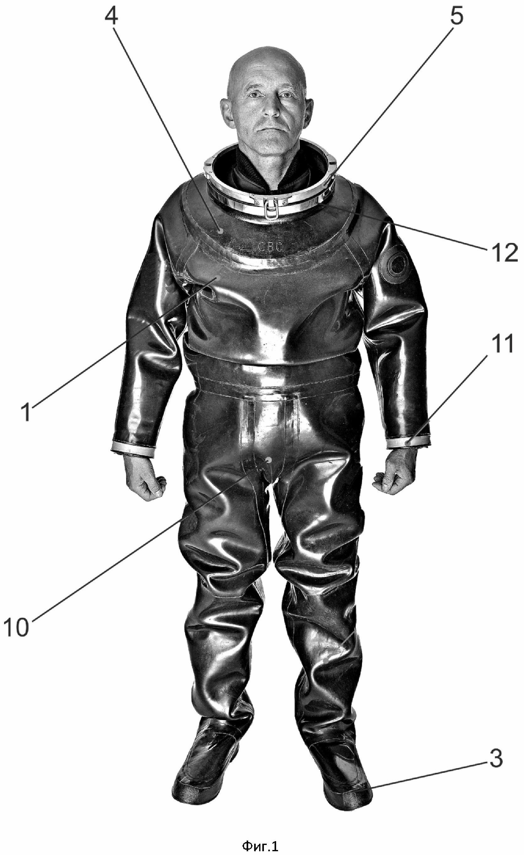 Изобретение относится к защитному водолазному оборудованию, а именно к эластичным водолазным костюмам [B63C 11/04, B63C 11/06, B63C 11/043]. Из уровня техники известен ГИДРОКОСТЮМ С МАНЖЕТАМИ НА ШЕЕ И ЗАПЯСТЬЯХ [US4365351 (A), опубликовано: 28.12.1982], для использования с дыхательным аппаратом, включающий капюшон, предназначенный для покрытия области шеи дайвера, причем указанный костюм включает: покрытие тела из водонепроницаемой ткани, включающее край ткани, образующий отверстие для шеи, причем указанный край выполнен коническим, сужающимся к голове водолаза; уплотнение горловины, содержащее кольцевой элемент, образованный из упругого пенорезинового материала с открытыми порами и характеризующийся осевым сквозным каналом, который имеет цилиндрическую форму в верхней части и сужается в нижней части, при этом стенка указанного кольцевого элемента имеет одинаковую толщину от верхнего конца вниз к промежуточному месту и расходится оттуда к относительно тонкому краю на нижнем конце, внутренний диаметр верхней части указанного элемента обычно несколько меньше диаметра шеи дайвера, в результате чего верхняя концевая часть указанного элемента будет упруго смыкаться и захватывать шею дайвера, при этом сужающаяся часть указанного кольцевого элемента дополняет и установлена на указанной краевой части ткани; и устойчивое к растяжению ленточное средство, наклеенное на полосу, покрывающую относительно тонкий нижний край указанного кольцевого элемента и указанную ткань, чтобы прикрепить указанный кольцевой элемент к указанному костюму, допуская радиальное расширение и сжатие указанной верхней концевой части при натягивании на голову дайвера. Недостатком аналога является низкая надежность герметичности манжет, обусловленная выполнением герметизации за счет плотного прилегания манжет непосредственно к телу водолаза. Также известен ЗАЩИТНЫЙ ГИДРОКОМБИНЕЗОН [RU2422323 (C1), опубликовано: 27.06.2011], оболочка которого выполнена из элементов полотнищ раскроя прорезиненной синтетической ткани, склеенных по кромкам, содержащий входное отверстие в виде горизонтальной прорези на уровне плеч, средство герметизации прорези, средства гидроизоляции верхнего выреза и применения лицевого обтюратора, шлема, капюшона, лицевой маски; средства герметизации для рукавов и брюк в виде манжет, рукавиц, бот; дополнительные элементы в виде укрепляющих накладок, карманов, тяжей; внутреннюю теплоизоляцию, отличающийся тем, что гидрокомбинезон под герметичной оболочкой содержит внутренний армирующий каркас из анизотропно упругой проволочной сетки, образованной спиральными пружинами или плоскими, или с овальным поперечным сечением, с обеспечением упругости сетки вдоль оси пружин и гибкости поперек оси пружин, пружины скреплены между собой вдоль оси, при этом армирующий каркас из сетки размещен с обеспечением гибкости сетки вдоль гидрокомбинезона и рукавов и с обеспечением упругости сетки и расположения оси пружин поперек гидрокомбинезона и поперек рукавов. Недостатком аналога является малая область применения гидрокомбинезона из-за невозможности обеспечения защиты водолаза на большой глубине при отсутствии в конструкции возможности присоединения к гидрокомбинезону шлема. Наиболее близким по технической сущности является ГИДРОКОСТЮМ И ШЕЙНОЕ УПЛОТНЕНИЕ