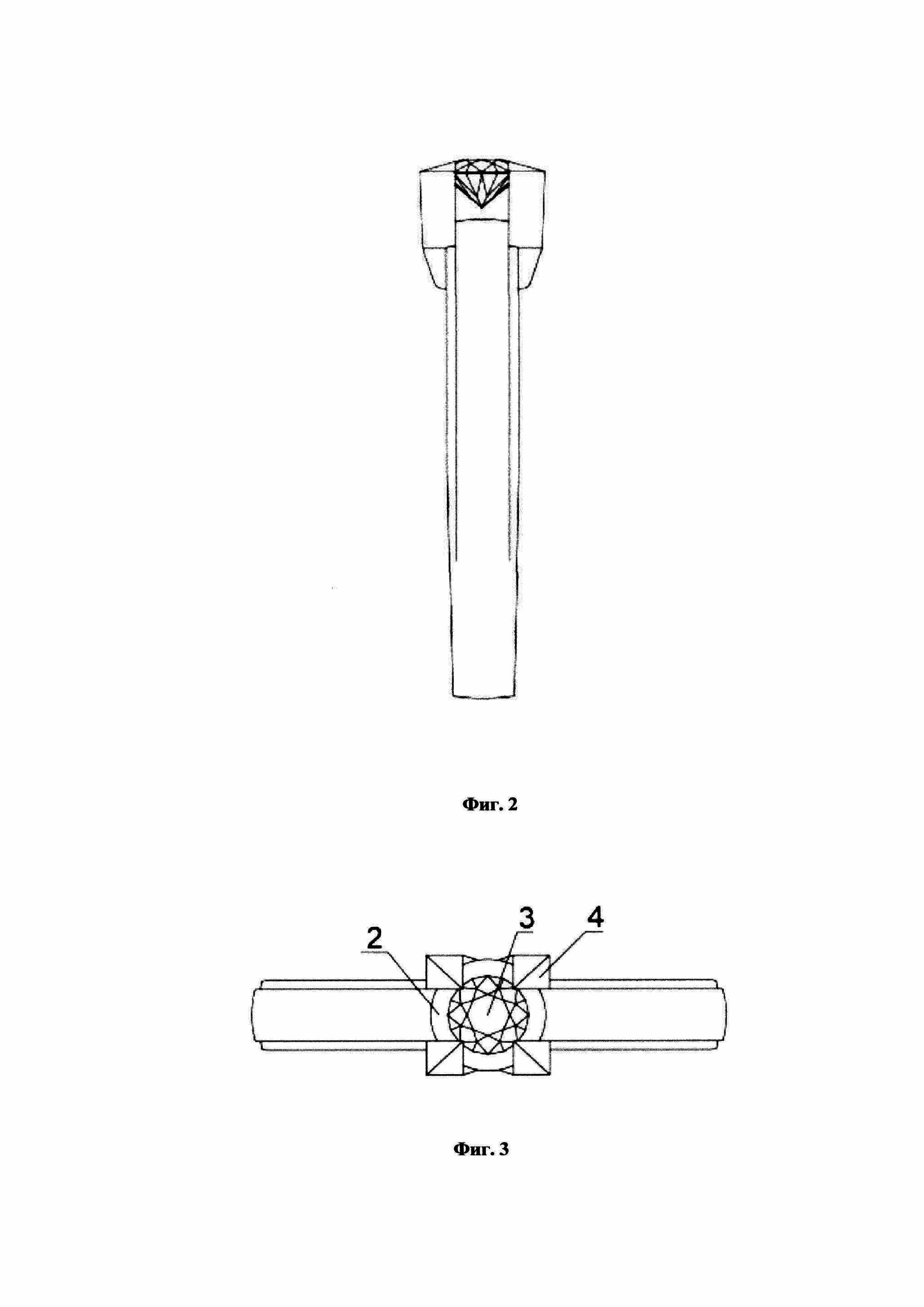 Изобретение относится к ювелирной отрасли, а именно к технологии закрепки вставки в ювелирные изделия с использованием алмазного диска под ней с целью визуального увеличения размера драгоценного камня. Мода на ювелирные изделия с бриллиантами не имеет срока давности и не подвластна сезонности. Ювелирное изделие с бриллиантами - это не просто украшение, это еще и инвестиция. Долгие годы не ослабевает конкуренция среди производителей в ювелирной отрасли. Технологи-ювелиры предпринимают многочисленные попытки создать такой уникальный продукт, который заслужит внимание потребителя и сумеет принести максимальную выручку. Дизайнеры и производители ювелирных изделий находятся в постоянном поиске уникальных, интересных дизайнов ювелирных изделий и готовы инвестировать как материальные, так и человеческие ресурсы для создания новых тенденций и стилей. Кроме того, развитие общества и повышение уровня жизни способствуют быстрому росту спроса на бриллианты. Алмазы представляют собой особый вид минералов и благодаря великолепному внешнему виду и придаваемому им глубинному смыслу высоко ценятся покупателями. Обычно алмазы используются в украшениях, таких как колье, серьги-подвески, кольца и т.д. Основные существующие виды закрепки бриллиантов в украшения - это крапановая, Паве, глухая закрепка, корнеровая, рельсовая, закрепка бриллиантов «на щелчок». Из-за быстрого истощения алмазных ресурсов стоимость крупных камней постоянно растет. Обычному потребителю трудно приобрести ювелирное изделие с бриллиантом весом более 1 карата. Несмотря на то, что у бриллиантов небольшого размера более привлекательная цена, обычный потребитель заинтересован приобрести ювелирное изделие со вставкой большого размера. Существуют визуальные приемы, чтобы сделать драгоценный камень визуально больше. Несколько маленьких камней стоят дешевле, чем один большой, поэтому делают модели, состоящие из нескольких камней, плотно закрепленных друг с другом так, что издалека смотрятся как один камень. Бывают модели, где под камнем делают зеркало из металла и родируют его так, чтобы его блеск отражался от полированной поверхности и сверкал. Соответственно, также он "увеличивается". В зеркале вокруг камня делают нарезку по металлу лучами, также для внешнего эффекта. Модель "малинка" - в середине один, как правило более крупный, камень, а вокруг, "ромашкой"- россыпь камней (ссылка на Интернет-источник: Какие способы визуально увеличить камни в украшениях существуют? |Ювелирное закулисье| Дзен (dzen.ru). За истекшие 150 лет предпринимались многочисленные попытки создать «увеличенный внешний вид» бриллиантов. Например, в течение более 125 лет люди создают «кластерные» композиции из бриллиантов с большим центральным бриллиантом, который плотно окружен бриллиантами небольшого размера, так чтобы с расстояния вся композиция бриллиантов выглядела как один бриллиант «солитер» большого диаметрального размера, т.е. как кластер. Тем не менее, кластерные композиции из бриллиантов состоят из множества бриллиантов, и, если смотреть даже на расстоянии вытянутой руки, можно рассмотреть отдельные бриллианты, которые ухудшают общий внешний вид. Кроме того, закрепление множества небольших камней вокруг большого центрального камня требует использования кастов специальной