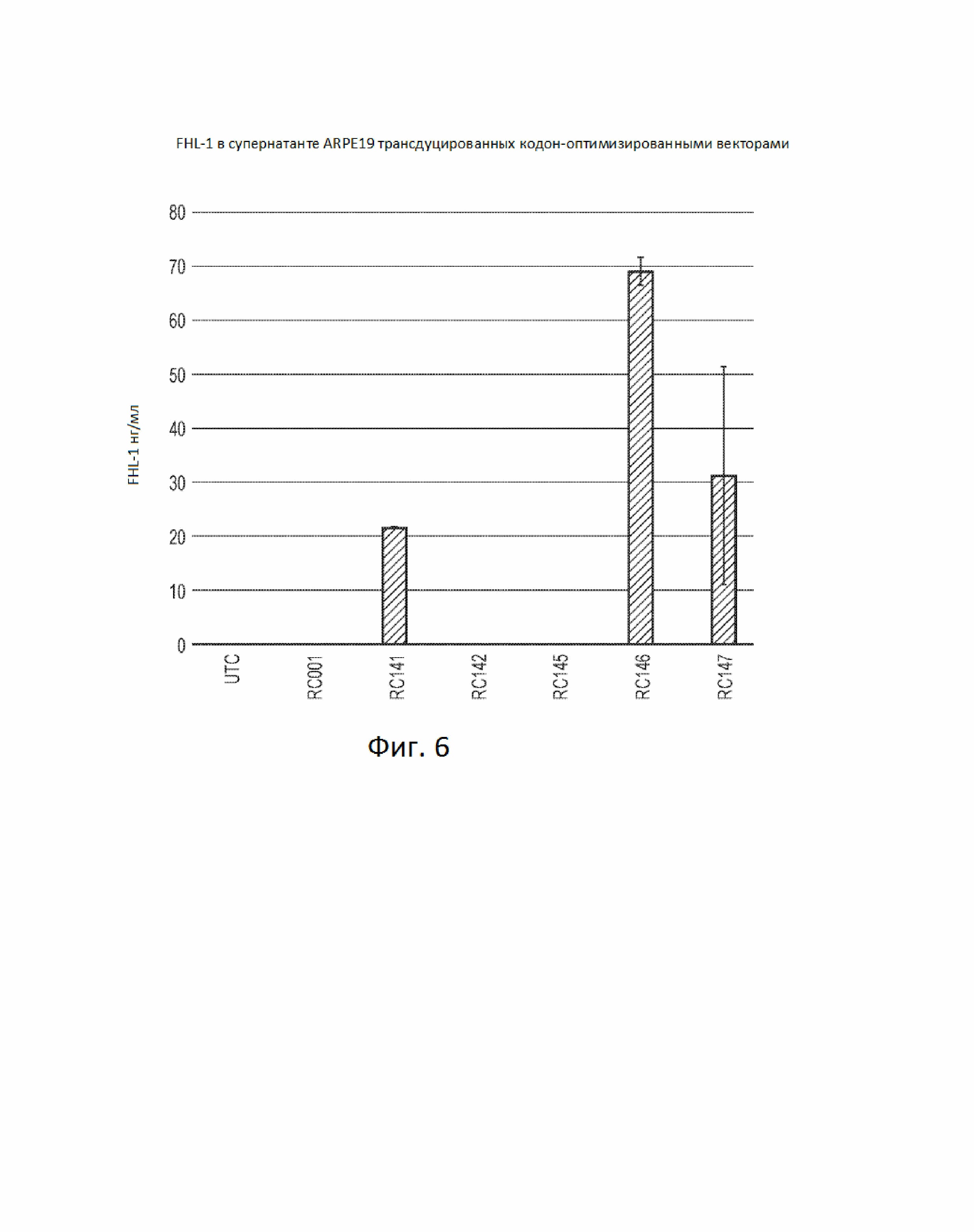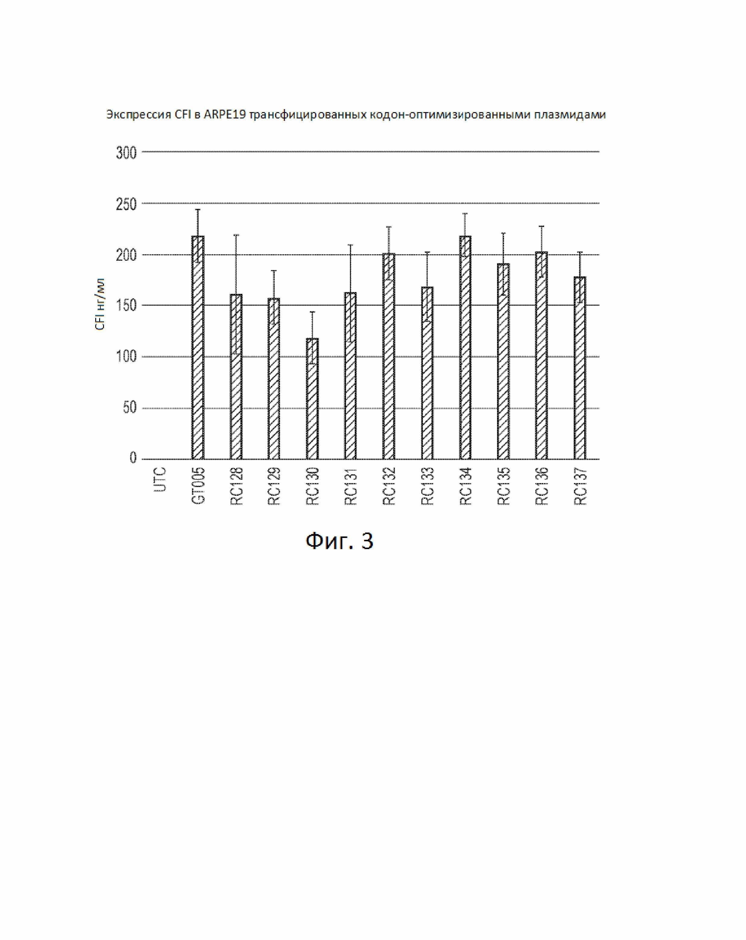 Каждая из RC136 (CFI; SEQ ID NO: 10) и RC146 (FHL-1; SEQ ID NO: 12) дает более высокую экспрессию трансгена, чем последовательности дикого типа и другие протестированные кодон-оптимизированные последовательности.