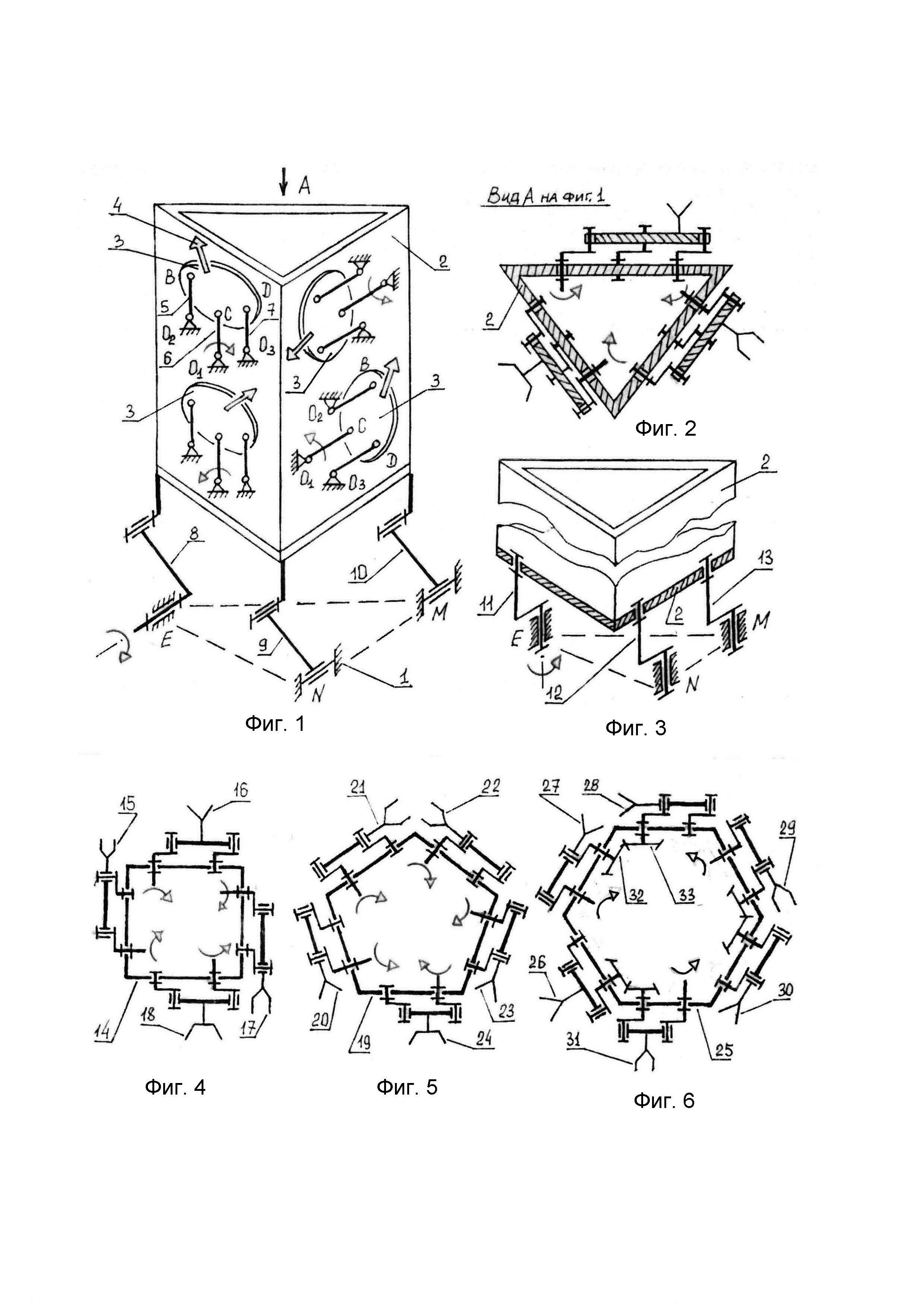 1. Пространственный параллелограммный манипулятор-трипод, содержащий кинематически связанные между собой стойку и приводную платформу, отличающийся тем, что он снабжен связанным со стойкой дополнительным звеном, представляющим собой подвижное опорное основание, выполненное в виде пустотелой многогранной призмы, на боковых гранях которой установлены структурные модули, каждый из которых выполнен в виде подвижной платформы с отдельным рабочим органом, шарнирно соединенной с одной из боковых граней призмы через три кривошипных или коромысловых рычага одинаковой длины, образующих между собой двойной шарнирный параллелограмм с параллельными осями всех цилиндрических шарниров, при этом один из упомянутых рычагов выполнен с возможностью привода от вращательного двигателя, установленного внутри пустотелой призмы. 2. Манипулятор-трипод по п. 1, отличающийся тем, что основание многогранной призмы шарнирно соединено со стойкой посредством трех параллельных рычагов одинаковой длины, один из которых выполнен с приводной вращательной кинематической парой, расположенной на трехшарнирной стойке параллельно или перпендикулярно ее плоскости. 3. Манипулятор-трипод по п. 2, отличающийся тем, что основание пустотелой призмы выполнено в виде торцевого треугольника, а структурные модули установлены по одному на каждой из трех боковых граней треугольной призмы и расположены вокруг ее вертикальной оси для образования пространственного шарнирного манипулятора с четырьмя управляемыми степенями свободы W=4. 4. Манипулятор-трипод по п. 2, отличающийся тем, что основание пустотелой призмы выполнено в виде торцевого треугольника, а структурные модули установлены по два вдоль вертикали каждой из трех боковых граней треугольной призмы для образования пространственного шарнирного манипулятора с семью управляемыми степенями свободы W=7. 5. Манипулятор-трипод по п. 2, отличающийся тем, что подвижное опорное основание выполнено в виде шарнирно соединенной со стойкой пустотелой четырехугольной призмы, например, в виде параллелепипеда, торцевым основанием которого является параллелограмм, а все четыре боковые грани которого представляют прямоугольники с установленными на них структурными модулями с отдельными рабочими органами. 6. Манипулятор-трипод по п. 5, отличающийся тем, что структурные модули установлены по одному на каждой из четырех боковых граней параллелепипеда и расположены вокруг его вертикальной оси для образования пространственного манипулятора с пятью управляемыми степенями свободы W=5. 7. Манипулятор-трипод по п. 5, отличающийся тем, что структурные модули установлены попарно между собой по вертикали вдоль каждой из четырех боковых граней параллелепипеда для образования пространственного манипулятора с девятью управляемыми степенями свободы W=9. 8. Манипулятор-трипод по п. 2, отличающийся тем, что подвижное опорное основание выполнено в виде шарнирно соединенной со стойкой пустотелой пятиугольной призмы, торцевым основанием которой является пятиугольник, а структурные модули установлены по одному на каждой из пяти боковых граней призмы и расположены вокруг ее вертикальной оси для образования пространственного манипулятора с шестью управляемыми степенями свободы W=6. 9. Манипулятор-трипод по п. 2, отличающийся тем, что