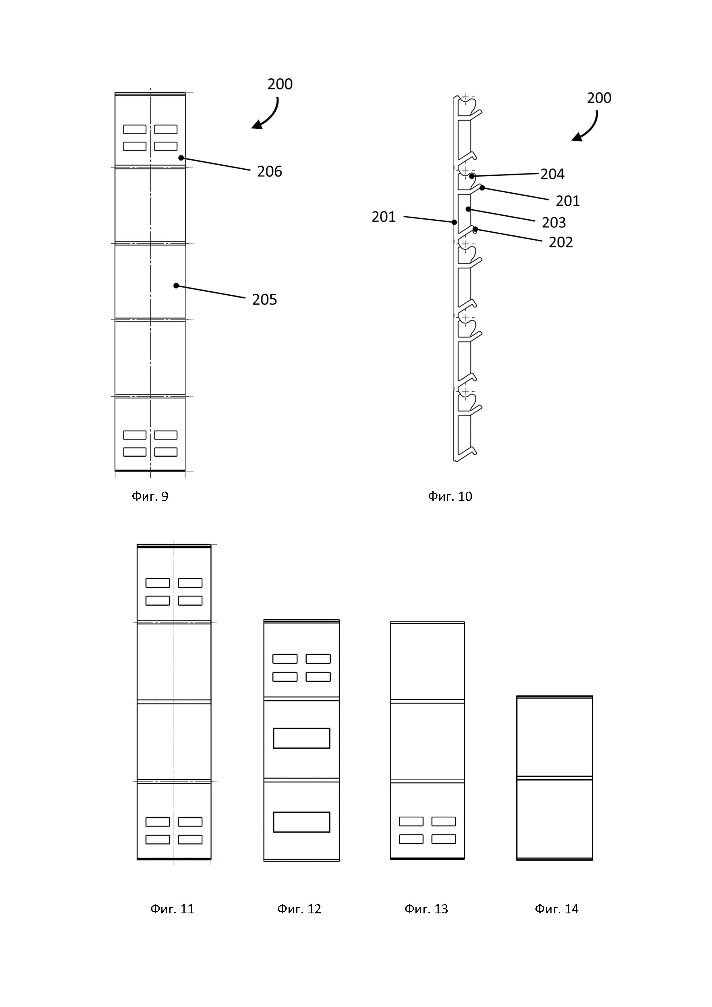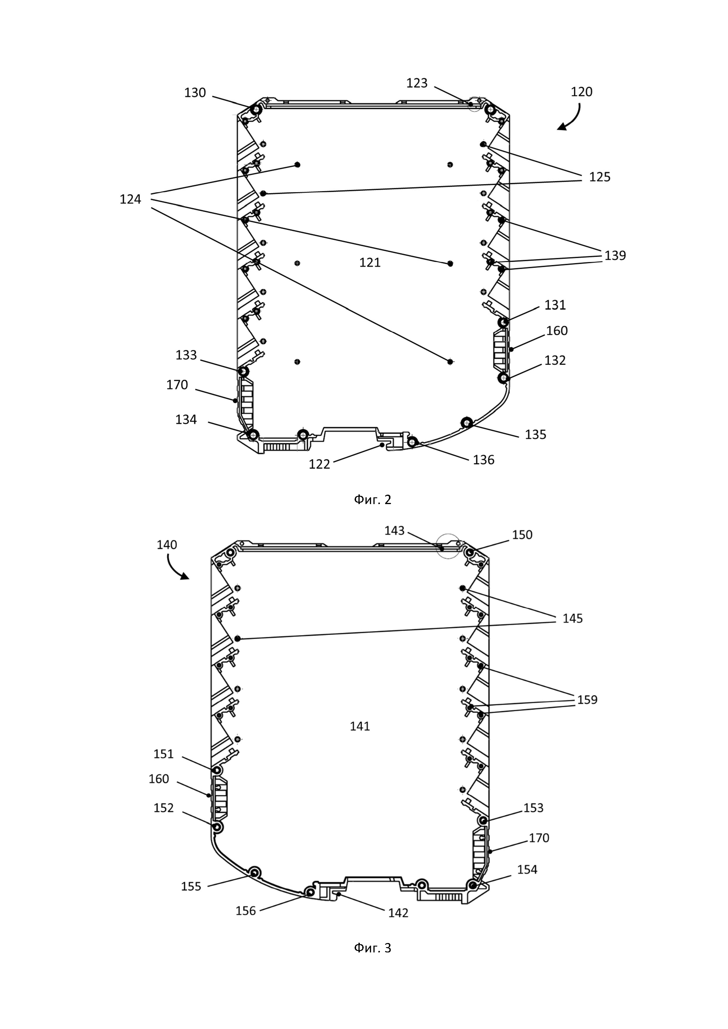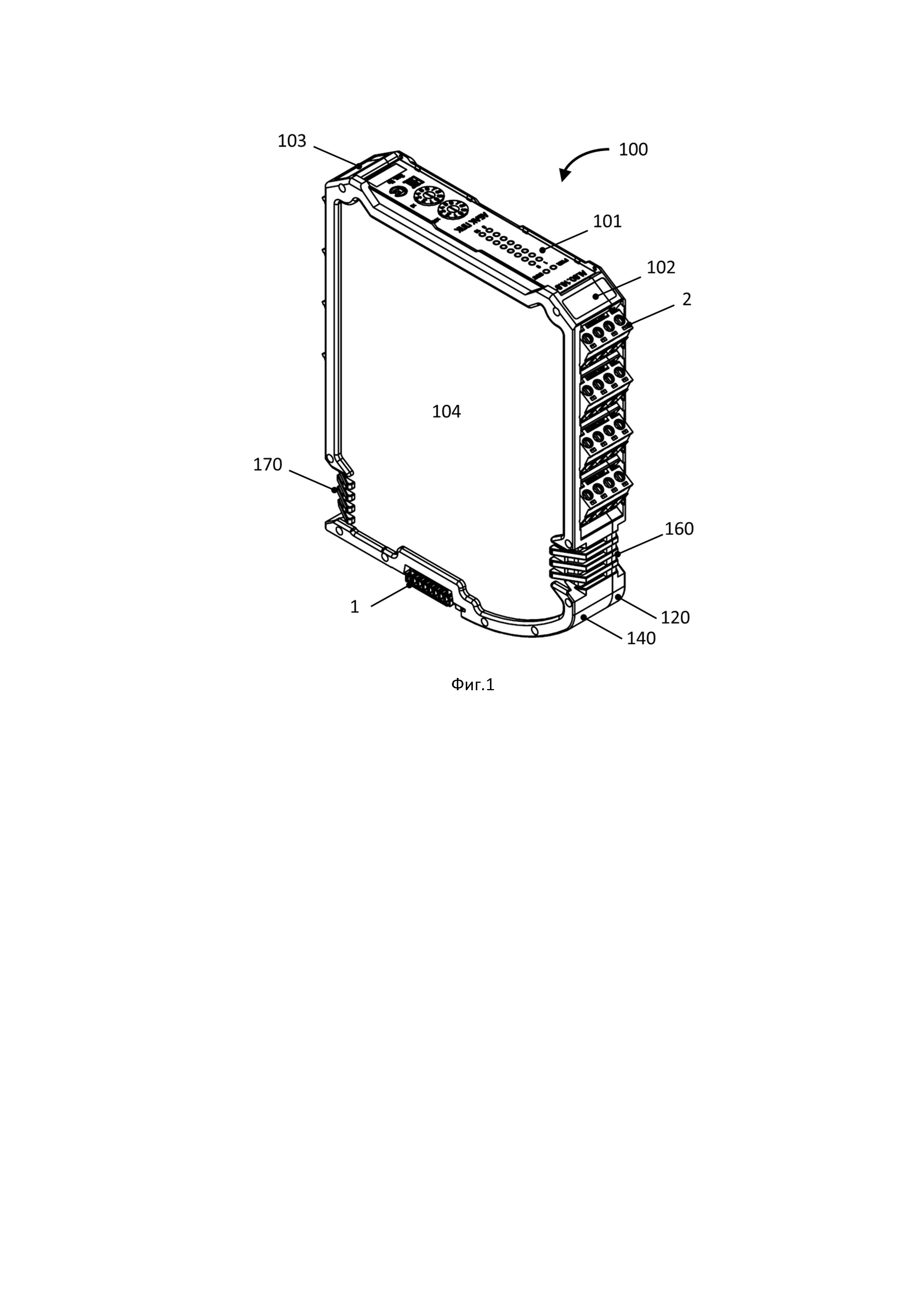 Область техники, к которой относится изобретение Изобретение относится к области производства корпусных устройств электронного оборудования, в частности, к корпусам модулей программируемых логических контроллеров (ПЛК). Уровень техники В патенте США 6172875 (опубл. 09.01.2001, МПК G05B19/05; G06F1/18) описан сборный модуль программируемого логического контроллера и система блокировки. Предложена система взаимнофиксируемых модулей для использования с программируемым логическим контроллером. В системе используется множество модулей, например, модули ввода/вывода, которые механически связаны друг с другом, что устраняет необходимость в стойке или объединительной плате. Каждый модуль включает в себя подвижную часть вилки, которую можно по выбору перемещать для зацепления с соответствующей приемной вилкой следующего соседнего модуля. Элементы механической блокировки и заглушки предназначены для обеспечения возможности вставки и удаления отдельных модулей, расположенных между соседними модулями, без перемещения любого из соседних модулей. Известное решение характеризуется небольшим размером и невозможностью размещения множества различных электронных компонент. Более того, наличие больших по размеру вентиляционных проемов не позволяет добавить дополнительные электронные компоненты, например, порты ввода-вывода, не ухудшив характеристики охлаждения, что может увеличить перегрев, привести к более быстрому выходу оборудования из строя. В патенте США 7336497 (опубл. 26.02.2008, МПК H05K7/16) описан корпус для электроники для размещения на опорной рейке, который включает в себя базовую часть и верхнюю часть. Базовая часть и верхняя часть могут разъемно соединяться друг с другом, а базовая часть может защелкиваться на опорной рейке. Две боковые стенки корпуса, имеющие крепления, расположены друг напротив друга и расположены параллельно друг другу. Боковые стенки корпуса также расположены перпендикулярно несущей рейке. Печатная плата располагается параллельно опорной рейке с помощью крепежных элементов. Для соединения электрических проводников предусмотрены по меньшей мере две соединительные клеммы или вставные соединители. Соединительные клеммы электрически подключаются к печатной плате. Известное решение также характеризуется небольшим размером, а пирамидальная форма не способствует размещению множества различных электронных компонент. Частично это проблема решается за счет размещения нескольких печатных плат между боковыми стенками устройства. Однако, в этом случае ухудшается ремонтопригодность, увеличивается время, необходимое на демонтаж и замену вышедшего из строя компонента, что может привести к снижению срока службы оборудования в целом. В патенте США 10483725 (опубл. 19.11.2019, МПК H01R25/16; H01R9/26; H02B1/052; H05K7/14) описан корпус несущей рейки и электронный модуль с корпусом несущей рейки и системой управления, причем корпус несущей рейки содержит: отверстие для приема несущей рейки, в которое могут быть вставлены удерживающие ножки несущей рейки; запирающий механизм для закрепления удерживающих ножек в требуемом монтажном положении, содержащий запирающие ползунки для блокировки корпуса несущей рейки в заблокированном положении; вставной контактный элемент, расположенный внутри корпуса несущей рейки, обращенный к приемному отве