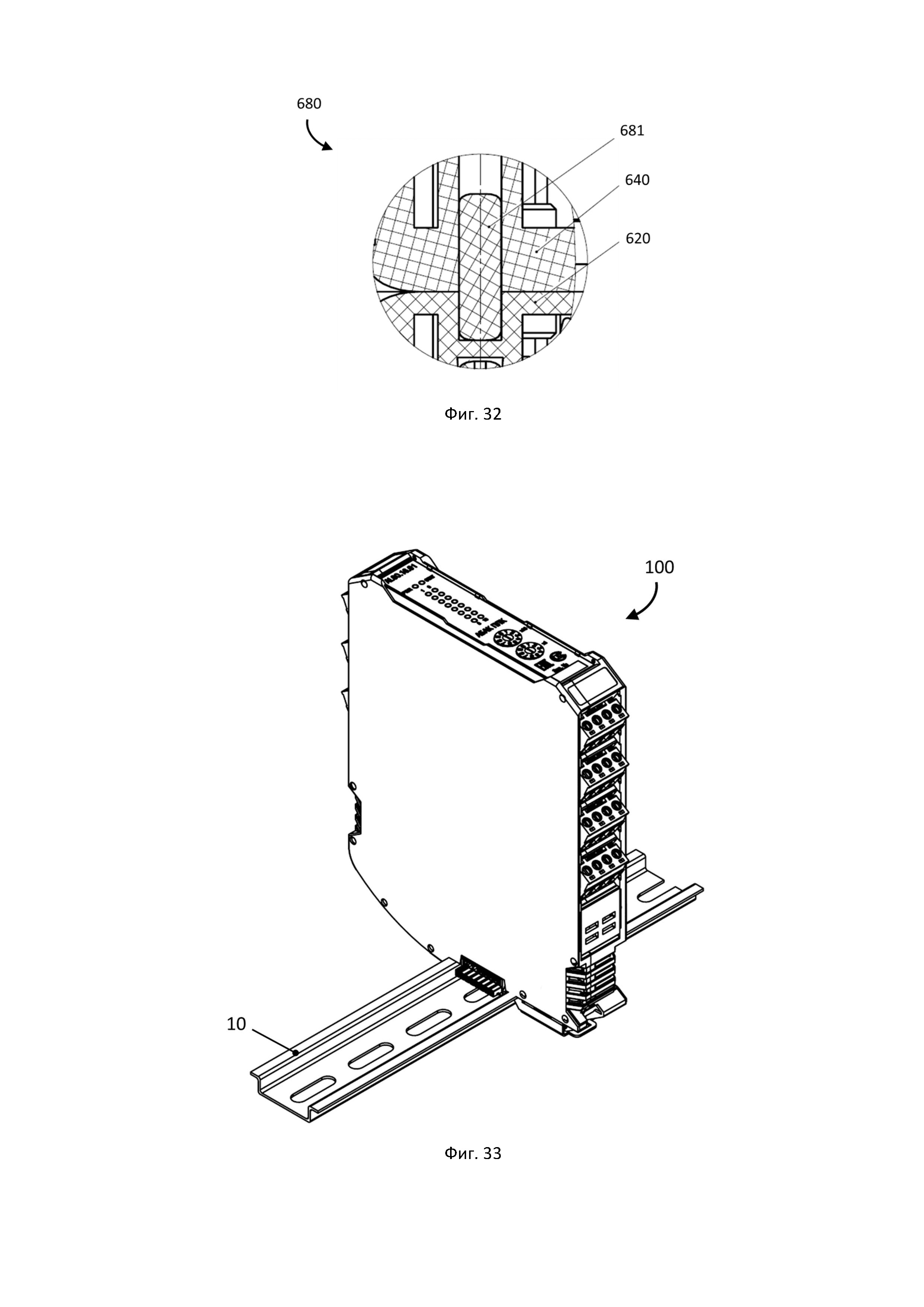 Изобретение относится к области производства корпусных устройств электронного оборудования, в частности к корпусам модулей программируемых логических контроллеров (ПЛК). Предложен корпус модуля программируемого логического контроллера, содержащий: опорный элемент, выполненный с возможностью размещения на нем платы печатной и других компонентов модуля ПЛК, закрывающий элемент, ответный по форме опорному элементу, выполненный с возможностью дополнительной фиксации компонентов модуля ПЛК при соединении с опорным элементом, при этом на одной части корпуса предусмотрен вентиляционный проем и по меньшей мере одно отверстие для установки компонента модуля ПЛК, образованные опорным элементом и закрывающим элементом при их соединении, на противоположной части корпуса предусмотрен вентиляционный проем и по меньшей мере одно отверстие для установки компонента модуля ПЛК, образованные опорным элементом и закрывающим элементом при их соединении, в опорном элементе и закрывающем элементе в нижней части корпуса предусмотрены пазы для установки шинного соединителя, в опорном элементе и закрывающем элементе в верхней части корпуса предусмотрены пазы для установки внешней панели, при этом опорный элемент и закрывающий элемент выполнены закругленными в нижней части корпуса, причем вентиляционный проем на указанной одной части корпуса расположен выше, чем вентиляционный проем на указанной противоположной части корпуса. Обеспечивается достижение технического результата, который заключается в увеличении срока полезной эксплуатации модульного программного логического контроллера. 4 н. и 6 з.п. ф-лы, 34 ил.