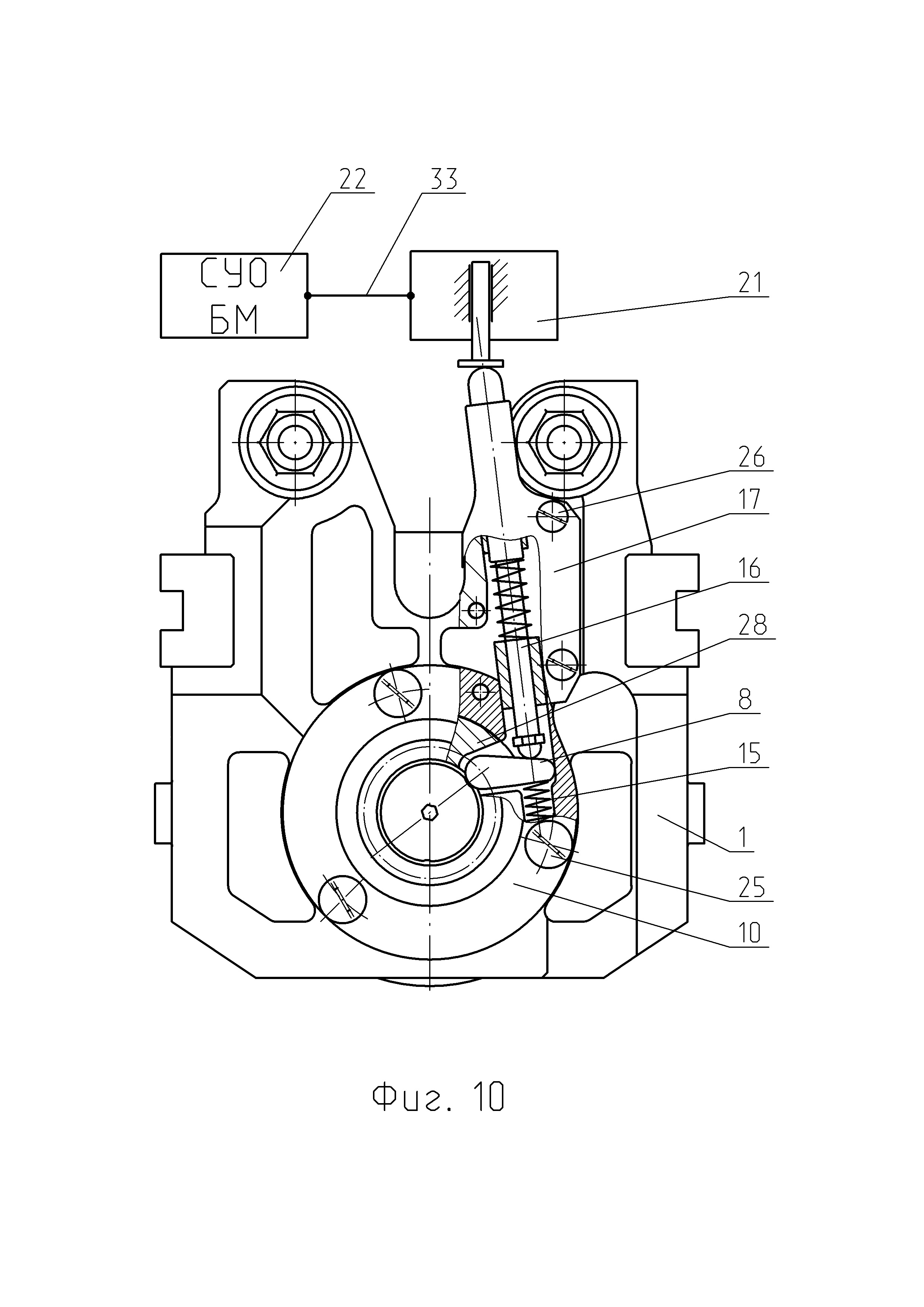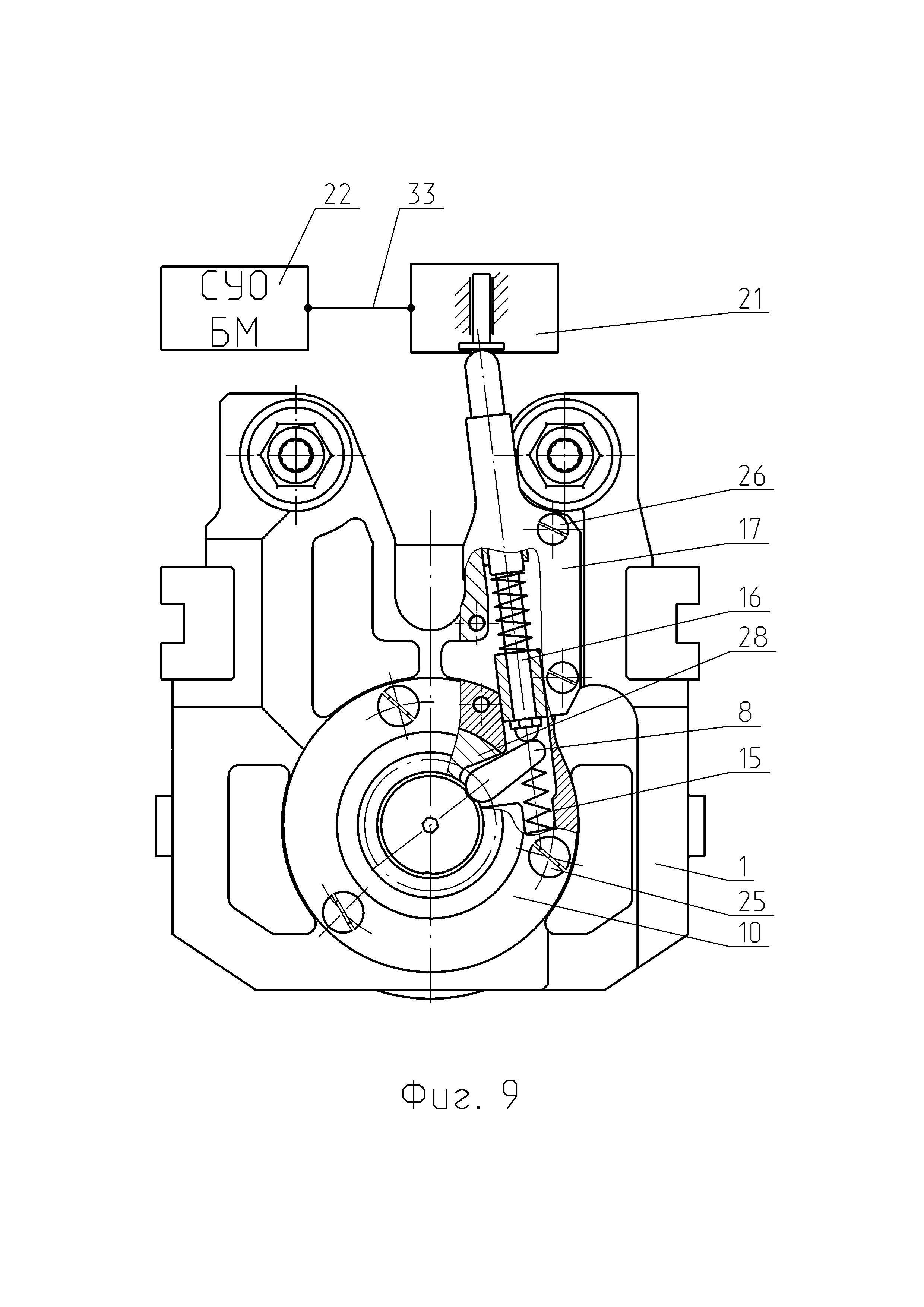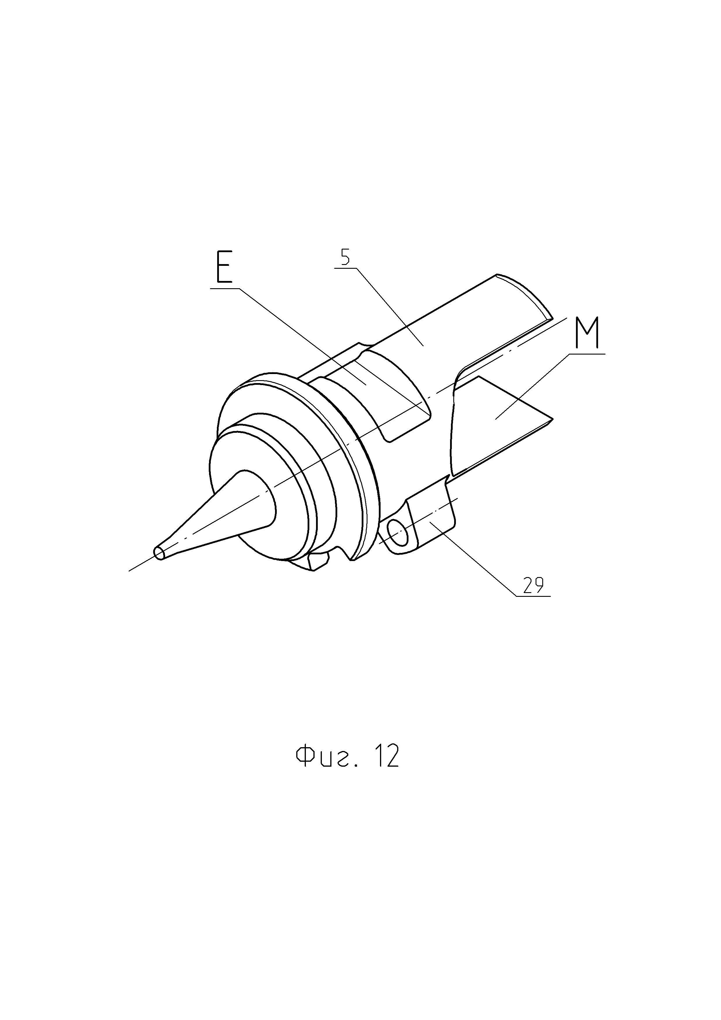 1. Автоматическая пушка, в которой все операции для производства выстрела производятся автоматически за счет энергии отдачи, в составе: ствола, выполненного в виде трубы-моноблока за одно целое с казенной частью, накатника, затвора и ствольной обоймы, магазина с патронами, люльки с механизмами, гидравлического буфера, досылающего механизма и тормоза отката, станка с платформой, механизма наведения, автоматического прицела, электрического следящего привода, с продольно-скользящим поршневым затвором, отличающаяся тем, чтов конструкции поршневого затвора автоматической пушки ударник выполнен дистанционно управляемым, с электромеханическим приводом исполнительного механизма управляемого спуска и производства выстрела, по сигналу от внешнего задатчика темпа стрельбы, например, системы управления огнем боевой машины, обеспечивающей автоматический расчет и введение временных установок управляемого спуска ударника для каждого выстрела в очереди, в заданном диапазоне скорострельности посредством передачи сигнала по кабелю, соединяющему систему управления огнем и электромеханический привод исполнительного механизма управляемого спуска, для реализации механизма управляемого спуска и производства выстрела, позволяющего контролировать момент срабатывания ударника и инициировать выстрел после затухания колебаний от удара остова затвора о казенную часть ствола автоматической пушки с сохранением темпа стрельбы, в составе: - тяги, конец которой жестко закреплен в стебле остова затвора, параллельной оси поршневого затвора, в средней части которой находится скользящий рычаг на подпружиненной тяге, располагающийся в фигурном вырезе в стебле остова затвора с возможностью перемещения и прижатый к фигурном пазу на внутренней поверхности поршня затвора с помощью бонома с пружиной, размещенного в фигурном вырезе стебля остова затвора, с возможностью взаимодействия с поршнем затвора и перемещения в фигурном пазу на внутренней поверхности поршня затвора, с другой стороны на резьбовом конце тяги законтрена гайка фигурная, упирающаяся в серьгу ударника и находящаяся в зазоре между внутренней поверхностью стебля остова затвора и ударником, которая при сжатии пружины на тяге, при перемещении и вращении поршня затвора тянет ударник для взведения боевой пружины; - г-образного рычага, продольный стержень которого установлен в отверстии стебля остова затвора, с возможностью вращения, с фигурной защелкой, посаженной на шлицы на другом конце продольного стержня г-образного рычага, и которая находится в пазу на внутренней поверхности стебля остова затвора и в пазу на ударнике, при закрытом положении, для его удержания и блокирования, в зависимости от положения ударника внутри стебля остова затвора, при этом на подпружиненную г-образную часть рычага воздействует толкатель с приводом для освобождения ударника и производства выстрела; - толкателя, установленного в кронштейне на задней части остова затвора, удерживаемого пружиной, находящегося в контакте с подпружиненным концом г-образного рычага, при этом для производства выстрела электромеханический привод исполнительного механизма перемещает толкатель, который поворачивает конец г-образного рычага, при этом язычок защелки выходит из паза на ударнике, высвобождая его; -