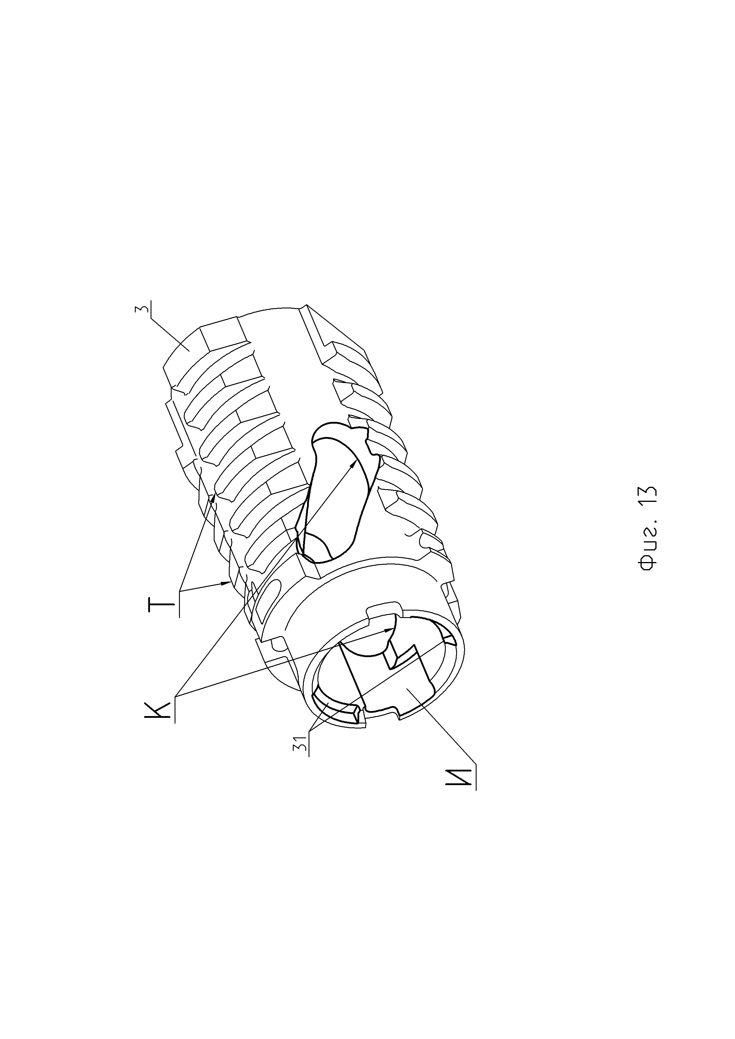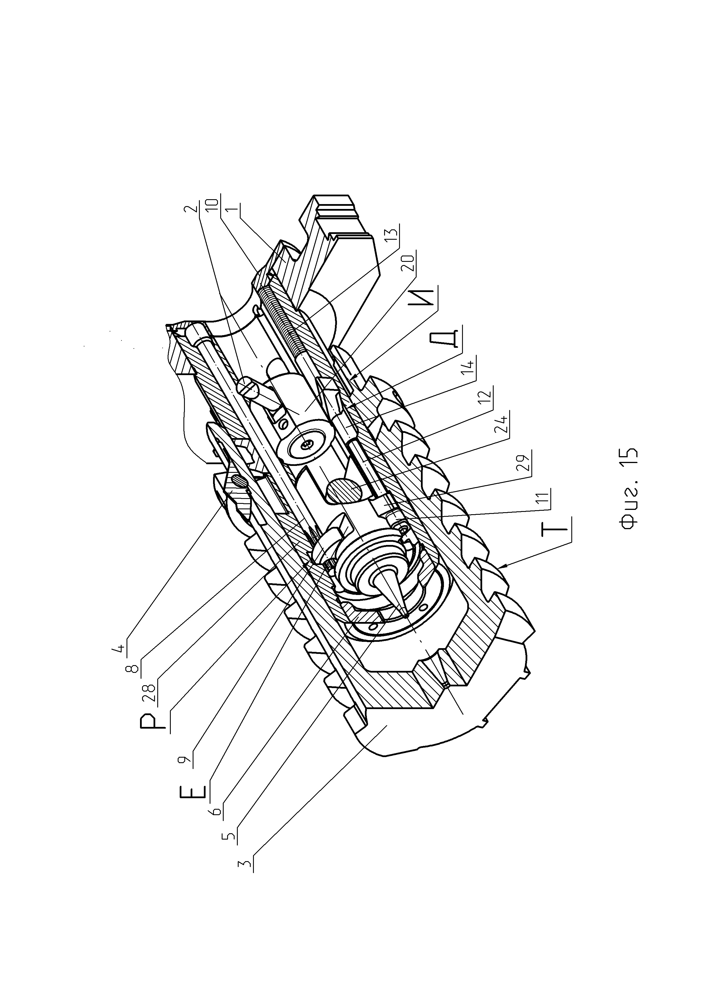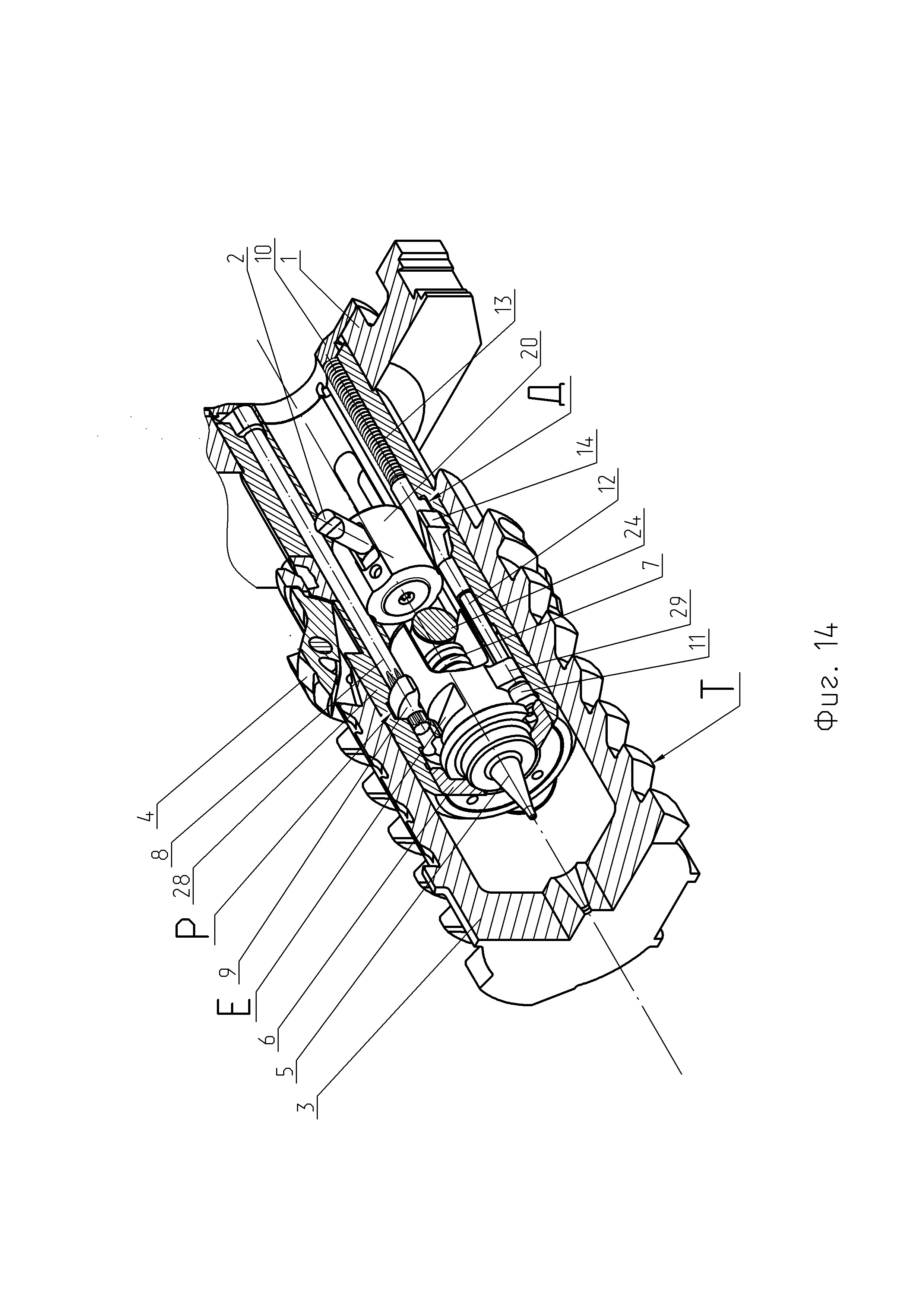 1. Автоматическая пушка, в которой все операции для производства выстрела производятся автоматически за счет энергии отдачи, в составе: ствола, выполненного в виде трубы-моноблока за одно целое с казенной частью, накатника, затвора и ствольной обоймы, магазина с патронами, люльки с механизмами, гидравлического буфера, досылающего механизма и тормоза отката, станка с платформой, механизма наведения, автоматического прицела, электрического следящего привода, с продольно-скользящим поршневым затвором, отличающаяся тем, чтов конструкции поршневого затвора автоматической пушки ударник выполнен дистанционно управляемым, с электромеханическим приводом исполнительного механизма управляемого спуска и производства выстрела, по сигналу от внешнего задатчика темпа стрельбы, например, системы управления огнем боевой машины, обеспечивающей автоматический расчет и введение временных установок управляемого спуска ударника для каждого выстрела в очереди, в заданном диапазоне скорострельности посредством передачи сигнала по кабелю, соединяющему систему управления огнем и электромеханический привод исполнительного механизма управляемого спуска, для реализации механизма управляемого спуска и производства выстрела, позволяющего контролировать момент срабатывания ударника и инициировать выстрел после затухания колебаний от удара остова затвора о казенную часть ствола автоматической пушки с сохранением темпа стрельбы, в составе: - тяги, конец которой жестко закреплен в стебле остова затвора, параллельной оси поршневого затвора, в средней части которой находится скользящий рычаг на подпружиненной тяге, располагающийся в фигурном вырезе в стебле остова затвора с возможностью перемещения и прижатый к фигурном пазу на внутренней поверхности поршня затвора с помощью бонома с пружиной, размещенного в фигурном вырезе стебля остова затвора, с возможностью взаимодействия с поршнем затвора и перемещения в фигурном пазу на внутренней поверхности поршня затвора, с другой стороны на резьбовом конце тяги законтрена гайка фигурная, упирающаяся в серьгу ударника и находящаяся в зазоре между внутренней поверхностью стебля остова затвора и ударником, которая при сжатии пружины на тяге, при перемещении и вращении поршня затвора тянет ударник для взведения боевой пружины; - г-образного рычага, продольный стержень которого установлен в отверстии стебля остова затвора, с возможностью вращения, с фигурной защелкой, посаженной на шлицы на другом конце продольного стержня г-образного рычага, и которая находится в пазу на внутренней поверхности стебля остова затвора и в пазу на ударнике, при закрытом положении, для его удержания и блокирования, в зависимости от положения ударника внутри стебля остова затвора, при этом на подпружиненную г-образную часть рычага воздействует толкатель с приводом для освобождения ударника и производства выстрела; - толкателя, установленного в кронштейне на задней части остова затвора, удерживаемого пружиной, находящегося в контакте с подпружиненным концом г-образного рычага, при этом для производства выстрела электромеханический привод исполнительного механизма перемещает толкатель, который поворачивает конец г-образного рычага, при этом язычок защелки выходит из паза на ударнике, высвобождая его; -