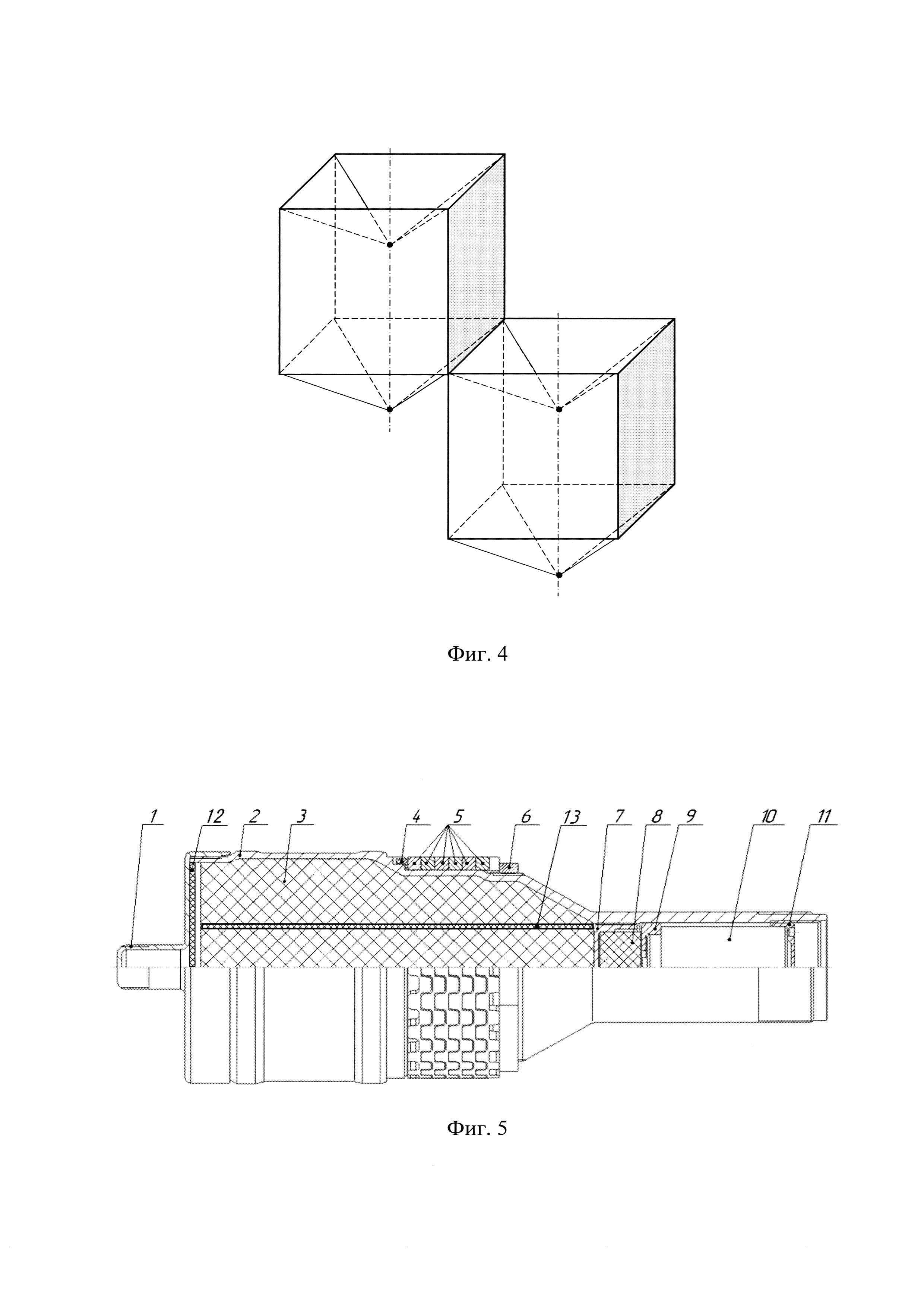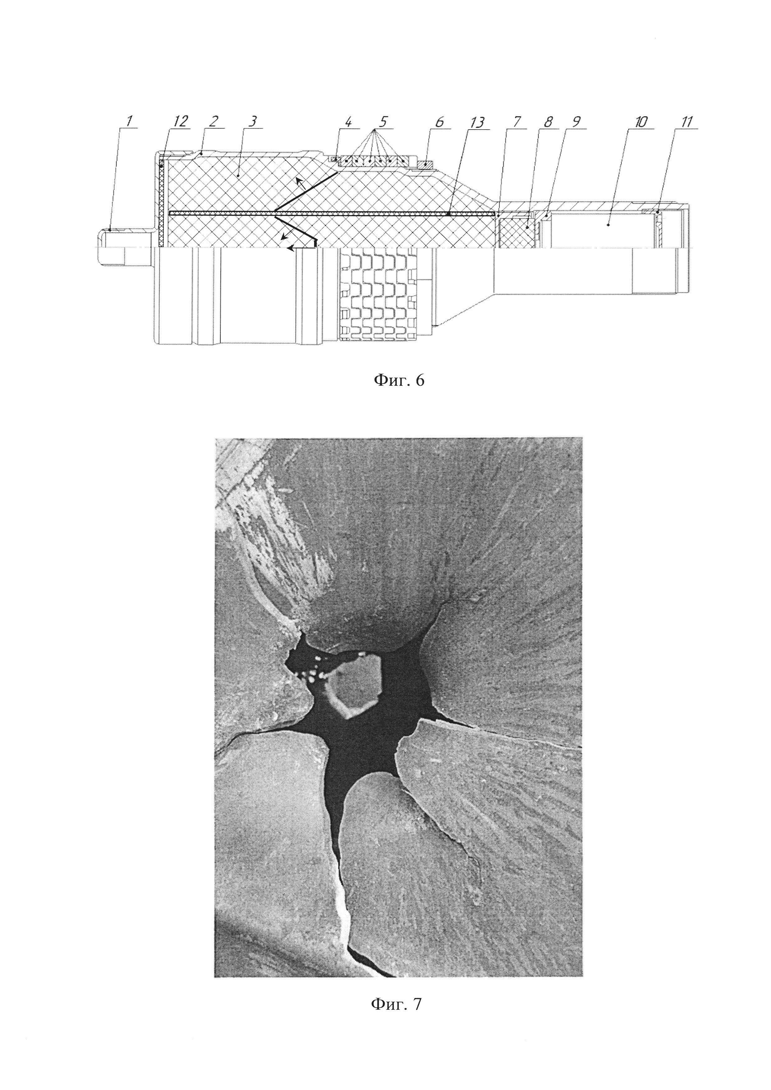 6. предлагается дополнительно разместить внутри заряда 3 параллельно его оси промежуточный полый заряд 13 с высокой скоростью детонации, например, как это показано на Фиг. 5. В этом случае заряд 13 делит заряд 3 на две части - центральную, в виде цилиндрического заряда, и периферийную, прилегающую к корпусу 2. Предназначение заряда 13 заключается в принудительном ведении процесса детонации по заряду 3 вследствие его более высокой скорости детонации, чем у заряда 3. Тогда в обоих зарядах (центральном и периферийном) под влиянием детонации заряда 13 организуется своя система ДВ (Фиг. 6):