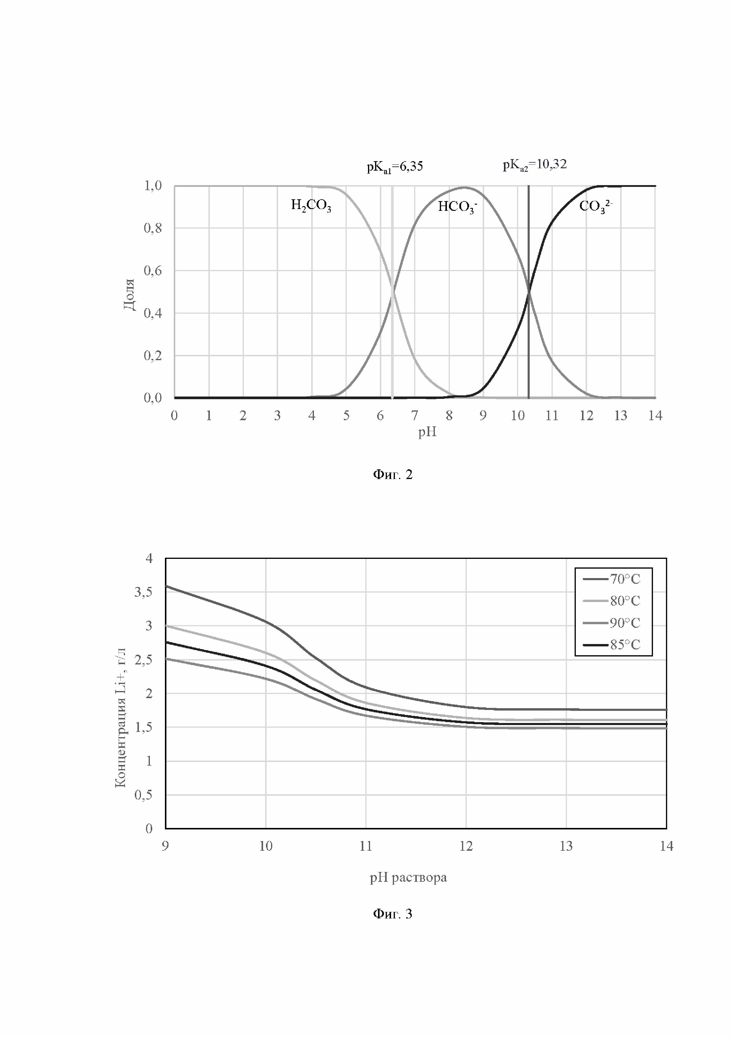 Поддержание на стадии a) в реакторе pH, равного 11 и более, предпочтительно 11-12, позволяет увеличить выход целевого продукта (карбоната лития) и снизить выход гидрокарбоната лития, образование которого является неизбежным при более низком pH. На фиг. 2 представлена зависимость образования карбонат-иона и гидрокарбонат-иона от pH среды.