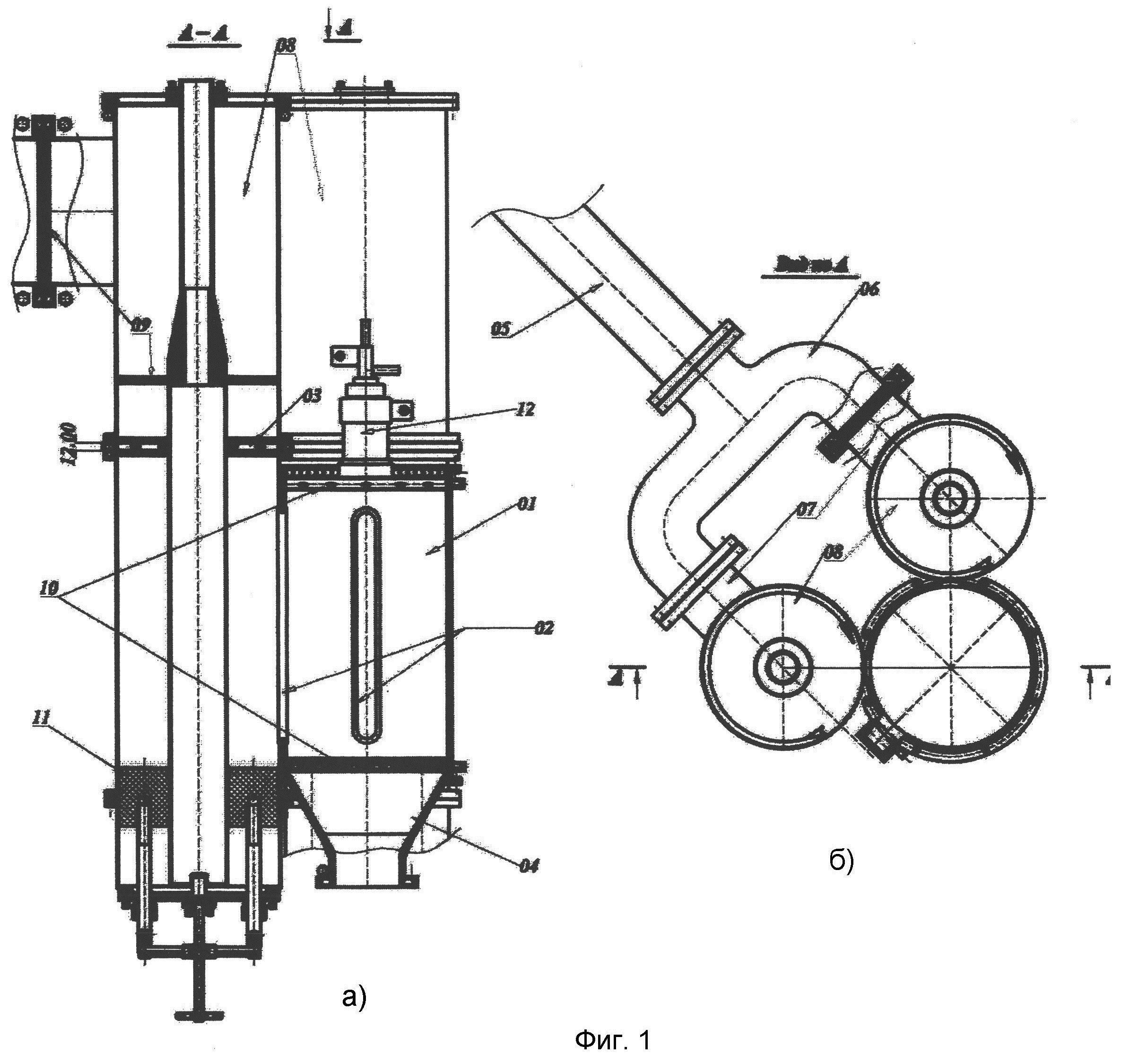 Изобретение относится к средствам генерирования плазмы СВЧ-разряда. Ввод СВЧ-энергии осуществляется в металлическую разрядную камеру через продольную вдоль оси камеры щель из присоединяемой к этой щели металлической трубы-волновода, располагаемой вдоль оси разрядной камеры. Через эту же щель вводится вращающийся вокруг оси разрядной камеры поток газа, закрученный внутри трубы-волновода. Для предотвращения образования зоны рециркуляции газа в осевой зоне внутри трубы-волновода располагают дополнительную металлическую трубу меньшего диаметра. Между трубой меньшего диаметра и внешней трубой-волноводом вводится вращающийся поток газа, далее по образованному таким образом коаксиальному волноводу вводится СВЧ-энергия на электромагнитной волне типа H11, которая возбуждается в коаксиальном волноводе, через окно во внешней трубе коаксиального волновода в зоне, удаленной от щели ввода, в разрядную камеру. Причем обеспечивается удаление герметизирующего диэлектрического окна ввода СВЧ-энергии в зону, недостижимую для продуктов реакции, из активной зоны СВЧ-разряда и теплового воздействия плазмы на окно, а также совмещение щели ввода СВЧ-энергии в разрядную камеру с вводом плазмообразующего или исходного рабочего газа. Техническим результатом является повышение надежности и долговечности устройства с возможностью проведения плазмохимических и тепловых (сфероидизация) процессов большой производительности при вводимой в СВЧ-разряд СВЧ-мощности 30 кВт и более при атмосферном давлении плазмообразующего газа. 2 н.п. ф-лы, 1 ил.