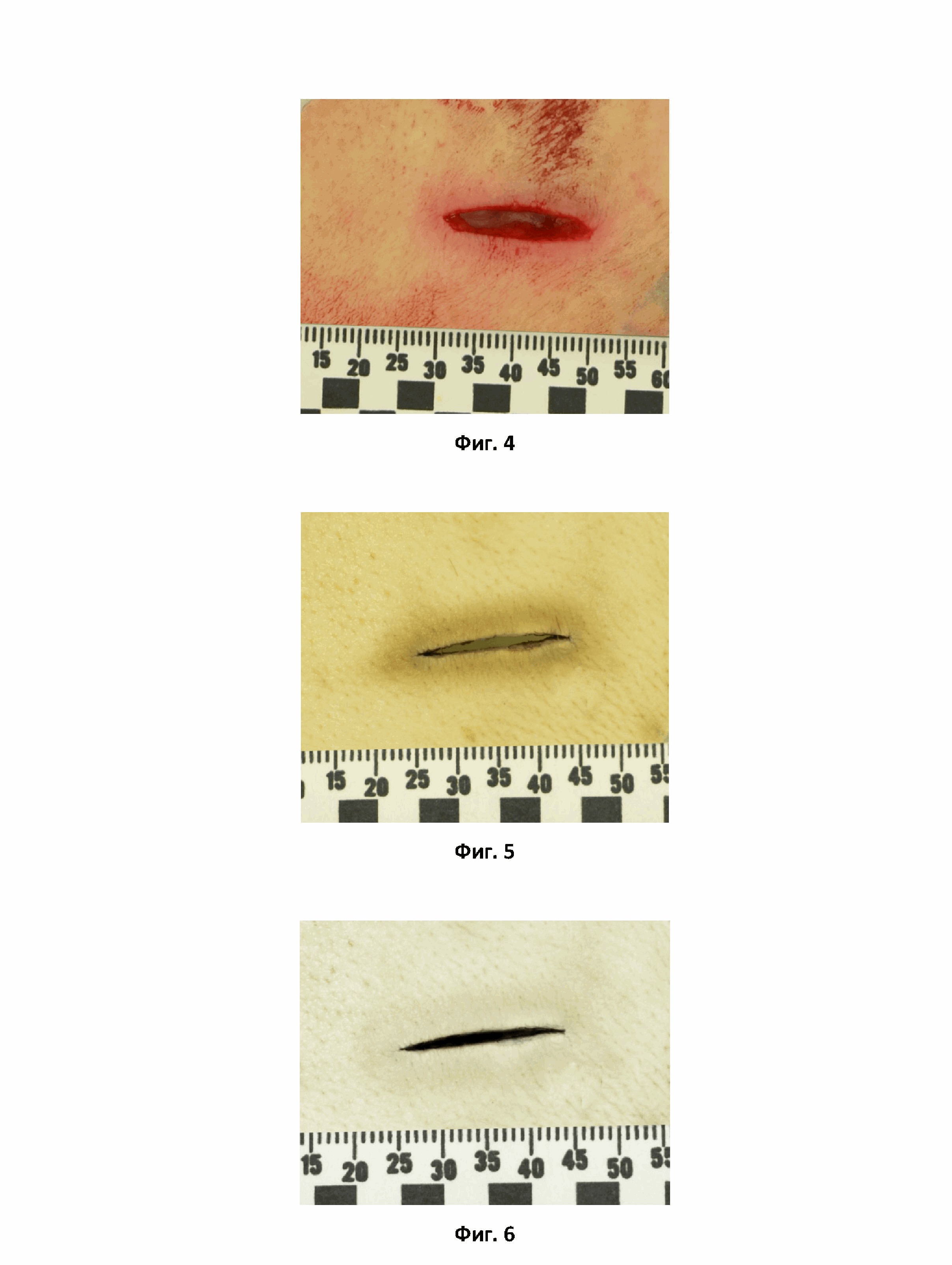 на фиг. 6 – представлена фотография колото-резаной раны (наблюдение № 2): после обработки предлагаемым раствором № 2;
