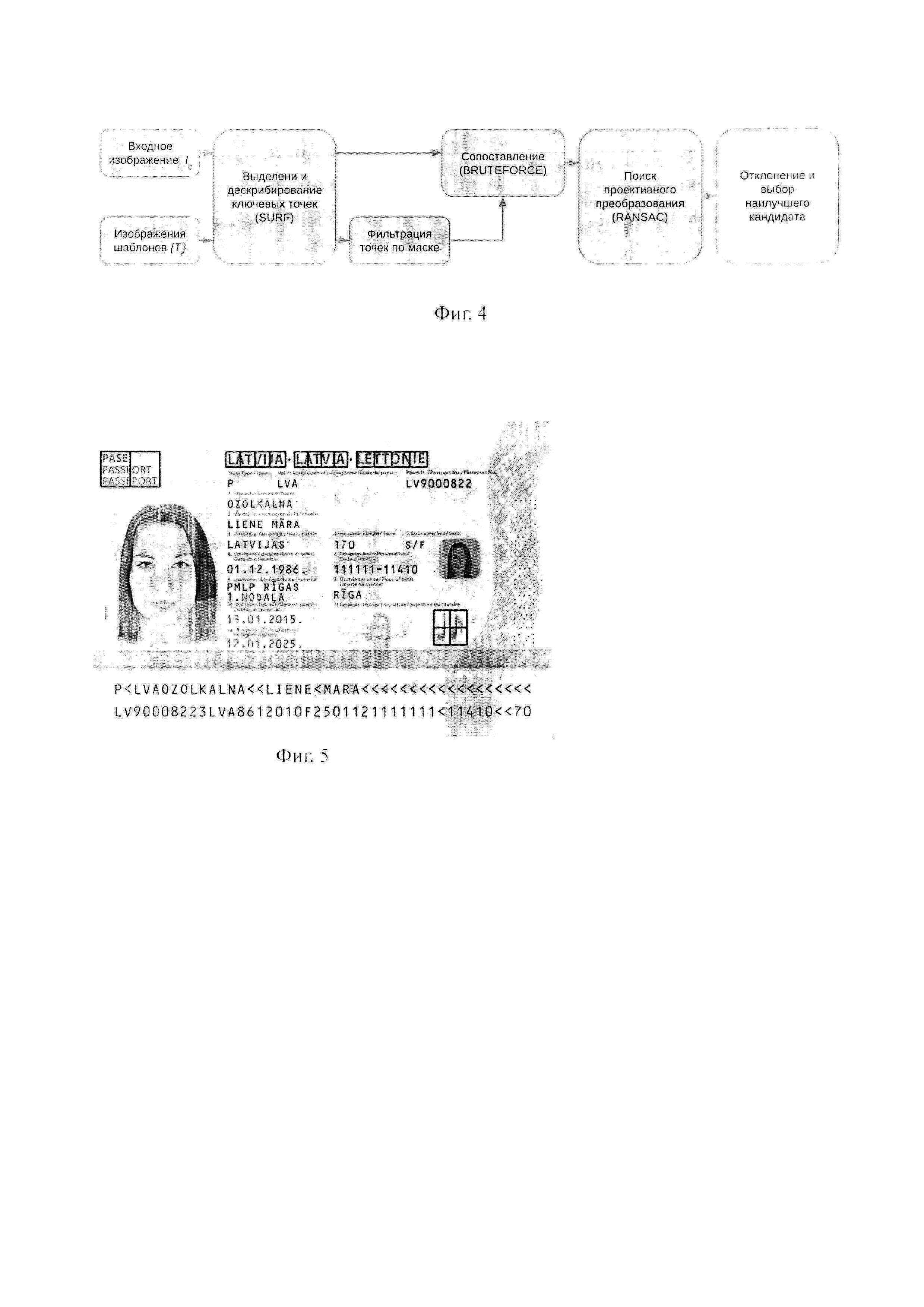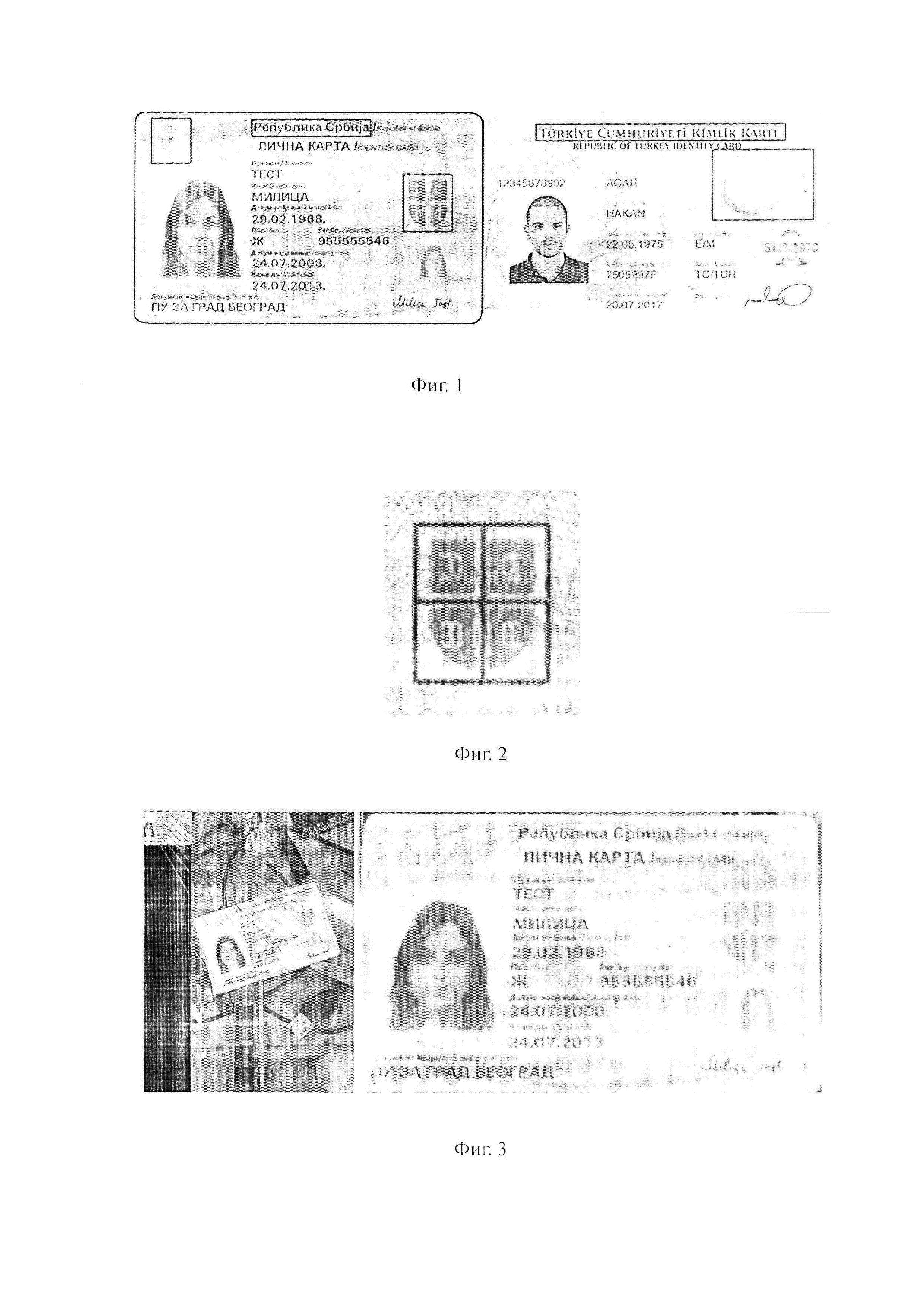 Заявленное техническое решение относится к области распознавания документа на фотокадре. Задачей распознавания документа на фотокадре предшествует задача идентификации и локализации документа. Суть данной задачи состоит в том, что подсистеме локализации и идентификации (далее - система) на вход подается снимок, на котором может присутствовать документ, а на выход система должна дать ответ в виде тина документа и координат его местоположения на снимке. От того, правильный ли ответ дала система, зависит качество дальнейшего распознавания документа. Алгоритмы идентификации и локализации бывают разные, но все они используют информацию о документе. Такой информацией могут быть границы фотографии, статический текст, точки (локальные особенности) с сильным перепадом цвета, гербы и изображения (глобальные особенности) и т.д. Среди всего этого многообразия можно выделить подмножество глобальных особенностей соответствующих конкретно одному типу документа. Важно отметить, что особенность определяется не только тем. чем она представлена (изображение герба, специфический текст), но и нем, где она находится (в верхнем правом углу документа или где-то слева по центру). Так статический текст названия поля, например "имя", не является особенностью, по которой можно определить тип документа. А изображение, например, герба - является. Из уровня техники известны различные способы валидации ответов систем локализации и идентификации документов с помощью глобальных особенностей. Например, в статье [Rusinol, М., & Llados, J. (2009). Logo Spotting by a Bag-ol-words Approach for Document Categorization. 2009 10th International Con Terence on Document Analysis and Recognition, doi: 10.1109/ICDAR.2009.1031 приводится алгоритм идентификации документа по глобальным особенностям. Авторы отмечают, что имеет место ложное срабатывания на документах с повторяющимися особенностями. Отличие настоящего изобретения от рассматриваемой работы в том, что в рамках изобретения не решается задача идентификации, а рассматривается задача отклонения по глобальным особенностям. Задачей заявленного изобретения является устранение недостатков известного уровня 'техники и использование уникальных глобальных особенностей документов, представляемых в виде зон, для отклонения ложных ответов системы локализации и идентификации документов. Технический результат заключается в обеспечении способа валидации ответов систем локализации и идентификации документов с помощью глобальных особенностей, который позволяет обеспечить повышение качества и надежности системы и последующего распознавания документов. Поставленная задача решается, а заявленный технический результат достигается посредством заявленного способа валидации ответов систем локализации и идентификации документов с помощью верификации глобальных особенностей документа. Заявленный способ валидации ответов систем локализации и идентификации документов с помощью верификации глобальных особенностей документа заключается в том, что для изображений-шаблонов и для изображения-запроса выделяются ключевые точки и дескрибируются, далее точки запроса приводятся в единообразие с каждым набором точек шаблонов полным перебором, далее по полученным сопоставлениям находится проективное преобразование, по которому определяется четырехугольник документа, далее из всех кандидатов с