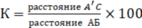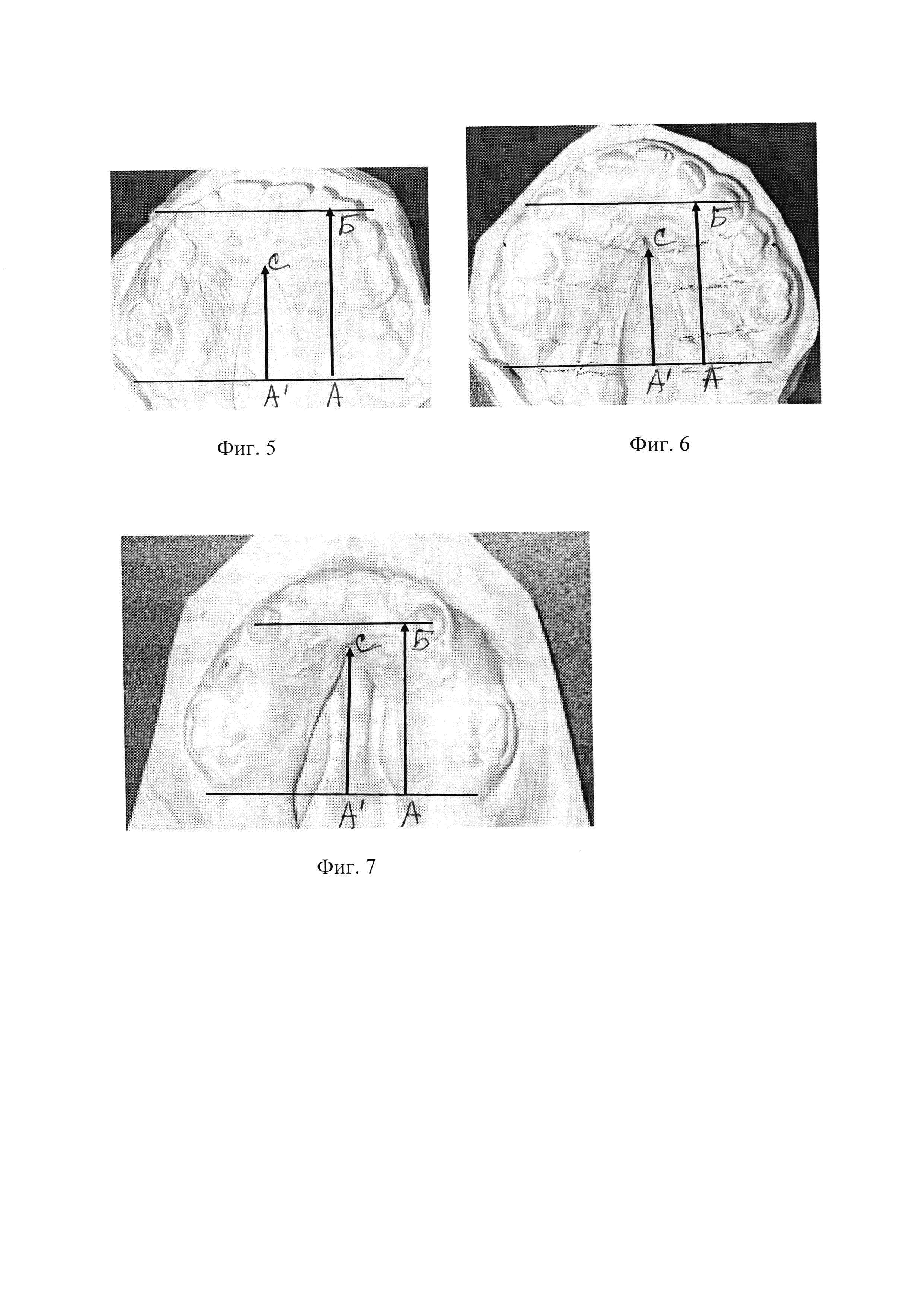 Способ определения степени дефекта твердого неба у детей, заключающийся в том, что на диагностической модели верхней челюсти ребенка проводят линию А, проходящую касательно к дистальным концам альвеолярного отростка челюсти, и линию Б, проходящую через вершины бугров клыков, определяют расстояние АБ между этими линиями, отмечают точку С, соответствующую вершине краев схождения расщелины, от нее перпендикулярно к линии А опускают линию, определяя в месте пересечения линий точку А', определяют расстояние между токами С и А', и определяют К - степень дефекта, %, как соотношение дефекта твердого неба к индивидуальному размеру неба по формуле: и при значении К до 30% и менее определяют первую степень и рекомендуют хирургическое вмешательство с закрытием дефекта неба в периоде новорожденности, массаж неба, полноценное искусственное кормление; при К от 31 до 60% определяют вторую степень дефекта и рекомендуют хирургическое вмешательство с закрытием дефекта неба от 6 месяцев до года жизни, массаж неба и диспансерное наблюдение у ортодонта; при К от 61% и более определяют третью степень дефекта и рекомендуют хирургическое вмешательство с закрытием дефекта неба от 1 года до 1,5 лет жизни, массаж неба.