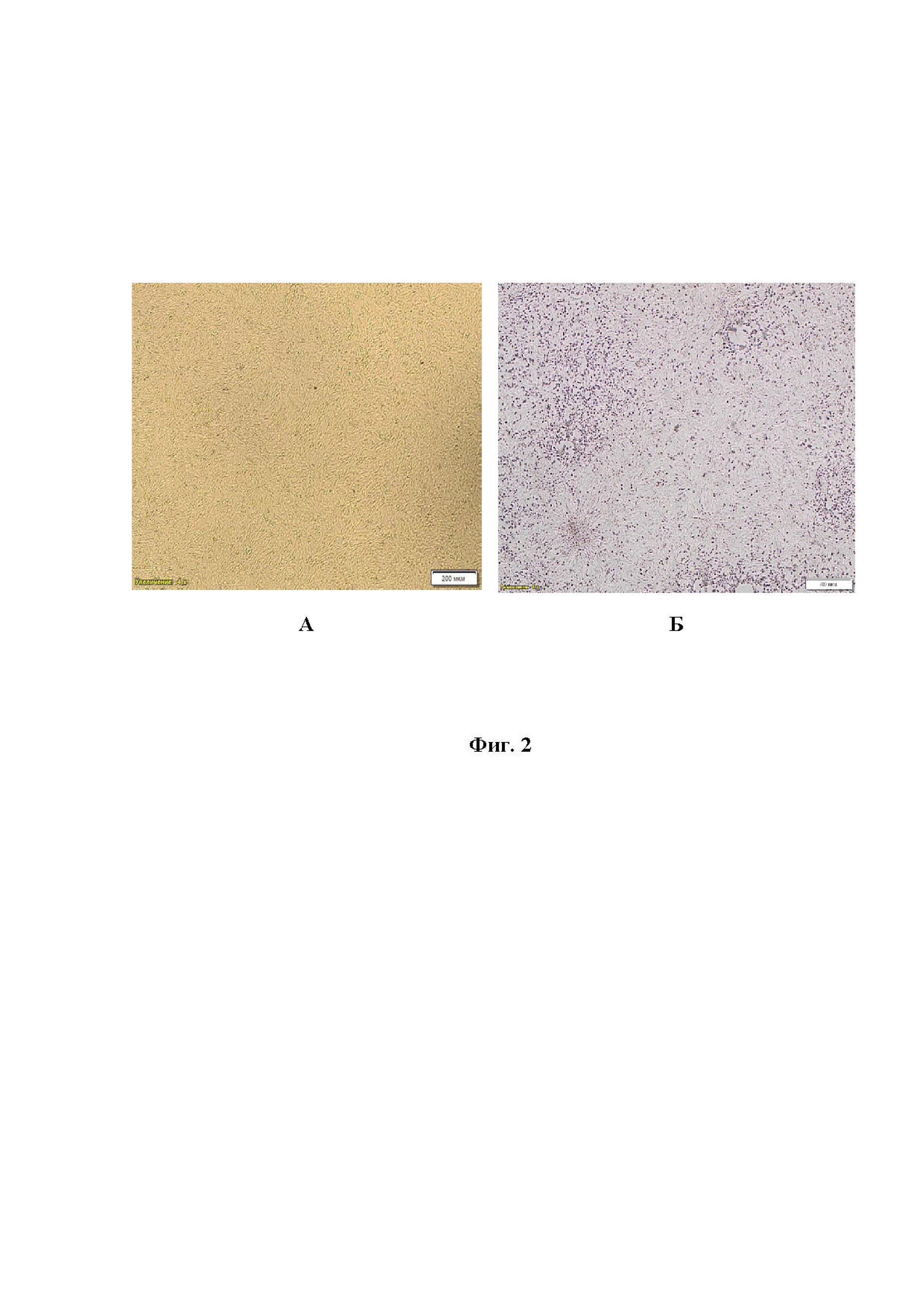 Фиг. 2 - Состояние монослоя клеточной линии CRFK до (А) и после (Б) репродукции вируса Feline calicivirus калицивирусной инфекции кошек штамма «Мира».