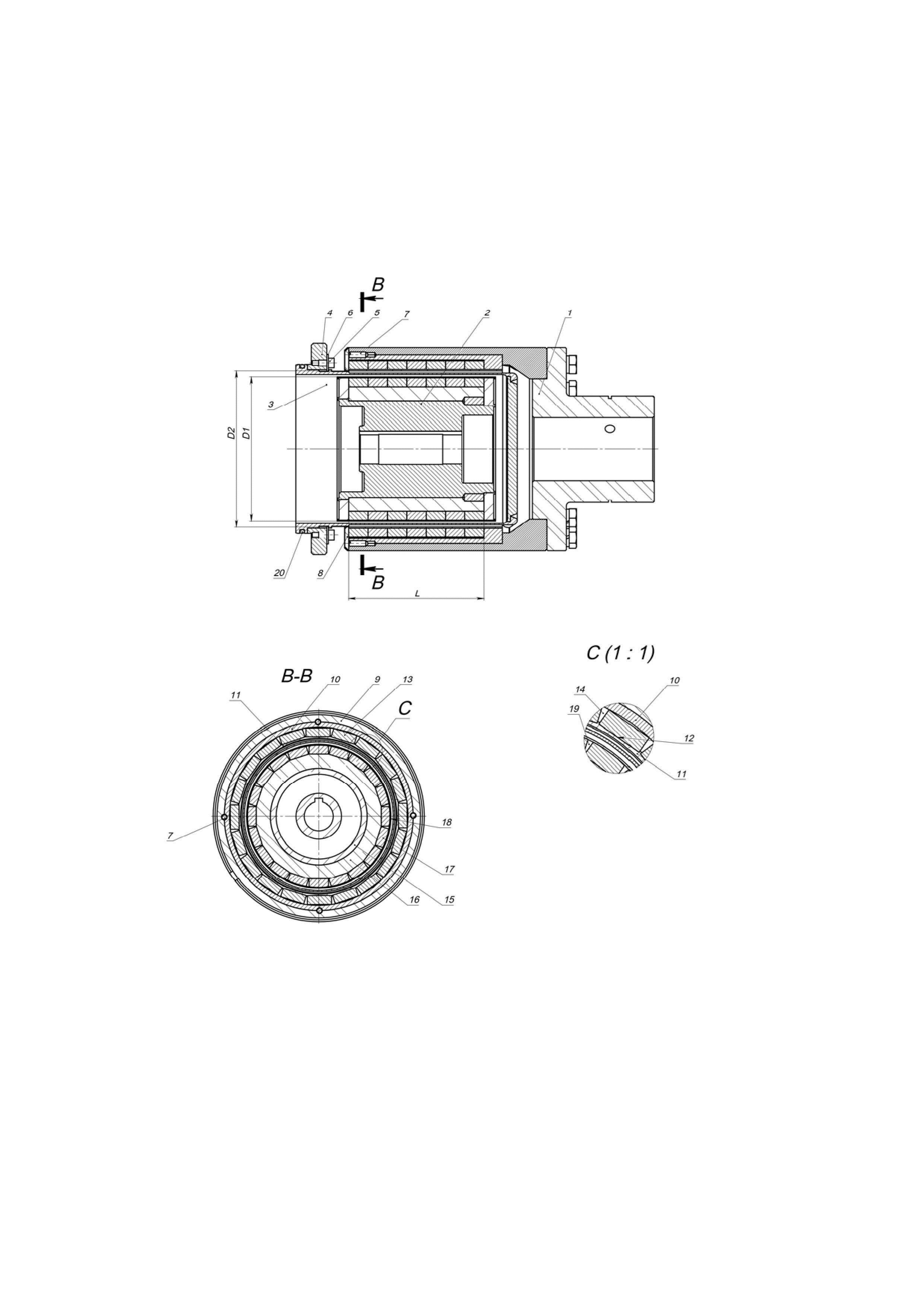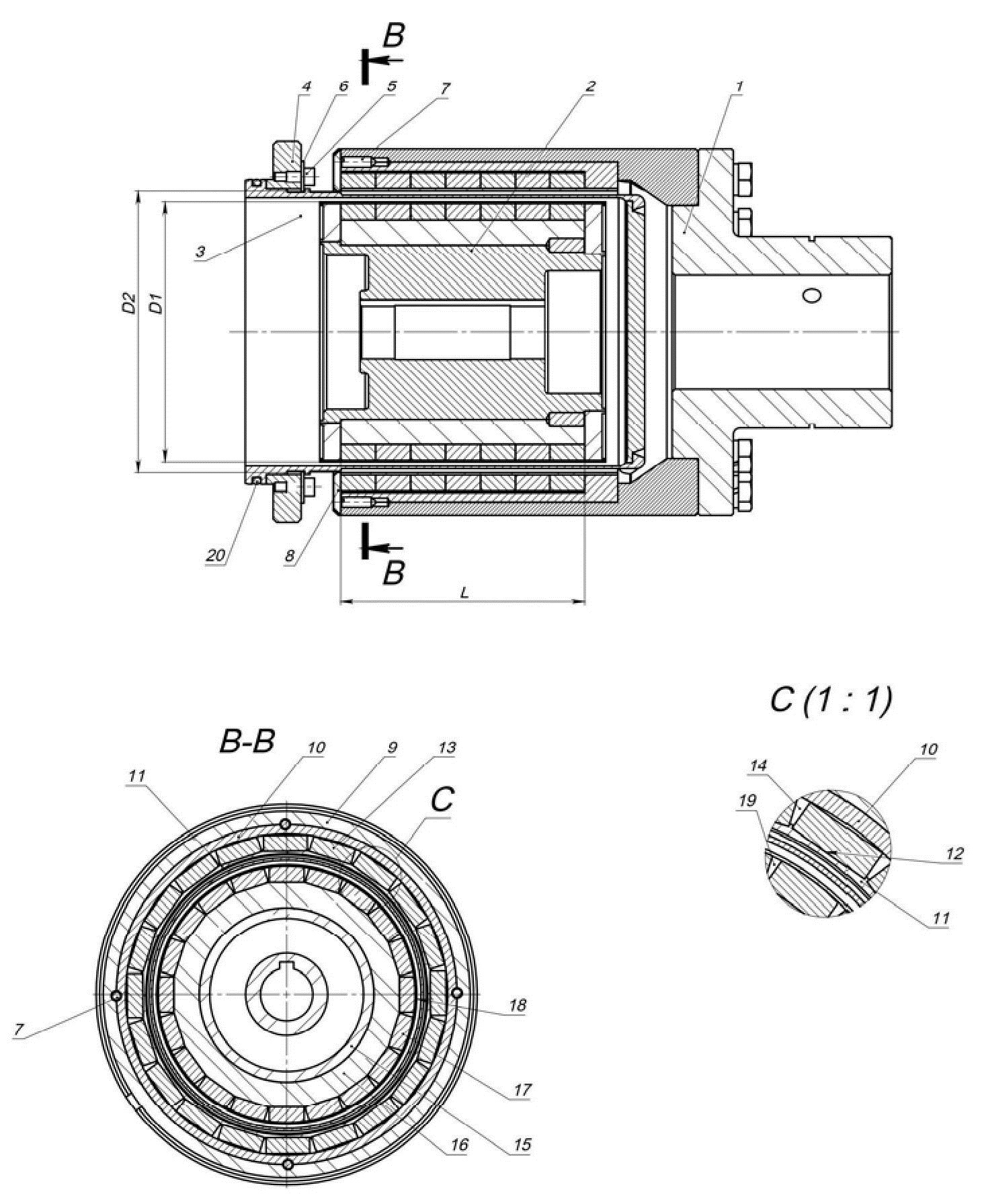 Герметизирующий экран 3 служит для обеспечения герметичности оборудования и состоит непосредственно из герметизирующего экрана 3, прижимного фланца 4 с отжимными винтами 5 с шайбами 6, служащими для упрощения демонтажа герметизирующего экрана 3 при разборке узла оборудования для ремонта или профилактики, в котором установлена магнитная муфта. Обеспечение герметичности узла, в котором устанавливается магнитная муфта, осуществляется путем установки уплотнительной прокладки 20, форма, типоразмер и материал которой выбирается исходя из температуры и среды, с которой работает оборудование с установленной магнитной муфтой. Подбор материала уплотнительной прокладки 20 осуществляется по требованиям технического заказчика к обеспечению работоспособности узла магнитной муфты в определенной среде с определенными температурами, вязкостью, плотностью.