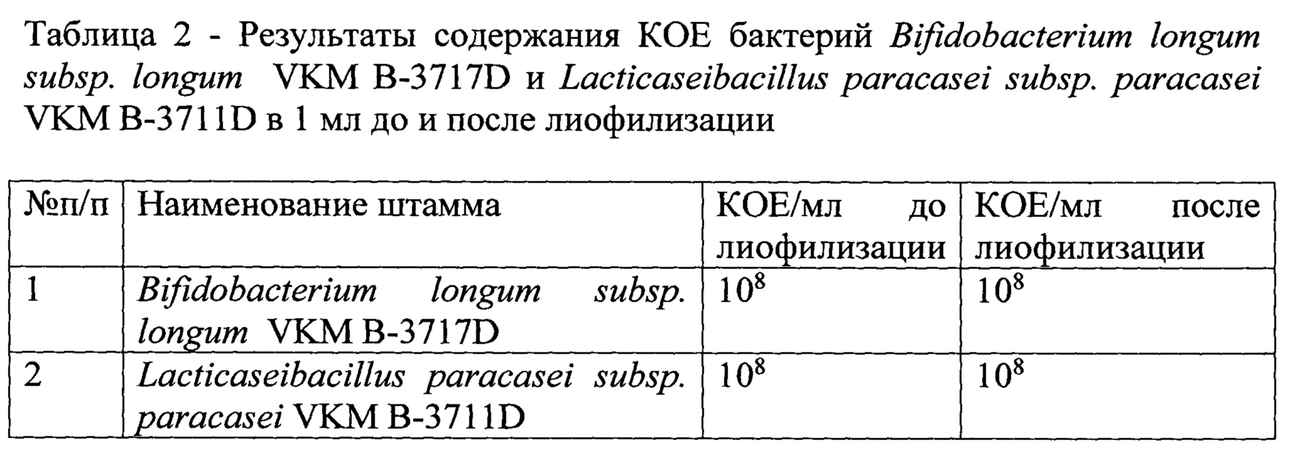 Способ получения готовой лекарственной формы пробиотического средства на основе штаммов бактерий Bifidobacterium longum subsp. longum VKM B-3717D и Lacticaseibacillus paracasei subsp. paracasei VKM B-3711D, депонированных во Всероссийской коллекции микроорганизмов, заключается в том, что указанные бактерии культивируют при температуре 37°С в течение 48 ч в анаэробных условиях в атмосфере трехкомпонентной газовой смеси 80%N2, 10% СО2, 10%Н2, причем Bifidobacterium longum subsp. longum VKM B-3717D выращивают на плотном агаре для бифидобактерий в количестве 2 чашек Петри, a Lacticaseibacillus paracasei subsp. paracasei VKM B-3711D культивируют на плотной среде MRS в количестве 2 чашек Петри, затем в анаэробных условиях готовят готовую защитную среду, состоящую из соотношения 1 части стокового раствора, приготовленного предварительно в анаэробных условиях из расчета 0,05 мг лакто-N-биозы (C14H25NO11) или N-ацетилглюкозамина на 100 мл в обезжиренном молоке и 1 части стерильного обезжиренного молока или сахарозно-желатиновой среды, затем подготовленную защитную среду разливают в емкости пенициллиновые флаконы или ампулы, при этом в каждую емкость стерильным одноразовым тампоном-зондом из вискозы снимают с каждой чашки Петри с поверхности агара видимый рост бактерий, затем тампон-зонд помещают в емкость со защитной средой, интенсивно суспендируют и вынимают, отжав о внутреннюю стенку пробирки, затем емкости закрывают стерильной негигроскопической ватной пробкой, удаляют лишние волокна ваты, или верхнюю часть пробок обжигают, или обрезают ножницами, затем помещают емкости в асептические герметичные контейнеры, и далее помещают в низкотемпературный морозильник на минус 70°С на 16 ч, затем вынимают и помещают в предварительно охлажденную до минус 50 градусов Цельсия лиофильную сушку, затем сразу в течение 60 мин проводят вакуумирование камеры лиофильной сушки до 20000 Па (0,02 бар) с последующим нагревом полок лиофильной сушки до минус 15 градусов Цельсия со скоростью 30 градусов в час и продолжают нагрев полок до плюс 30 градусов Цельсия со скоростью 3 градусов в час, по достижению температуры лиофильную сушку оставляют до полного высушивания содержимого емкостей в течении 48 ч, после высушивания емкости достают из лиофильной сушки и в ламинарном боксе гомогенизируют содержимое каждой емкости, добавляют навески 30 мг хитозана, 50 мг сахарозы и 70 мг лактозы на 1 терапевтическую дозу препарата, которая включает от 7×107 до 8×107 КОЕ каждого используемого бактериального штамма, заменяют ватные пробки на резиновые, затем флаконы закупоривают металлической крышкой, а если готовая лекарственная форма пробиотического средства сушилась в ампулах, то ампулы запаивают, или полученную готовую лекарственную форму пробиотического средства на основе штаммов бактерий Bifidobacterium longum subsp. longum VKM B-3717D и Lacticaseibacillus paracasei subsp. paracasei VKM B-3711D расфасовывают в кишечнорастворимые капсулы из расчета 1 терапевтическая доза на 1 капсулу №3.