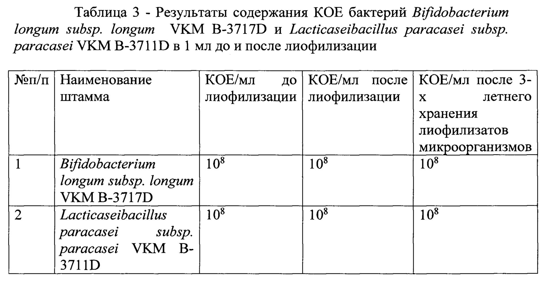Изобретение относится к биотехнологии и медицинской микробиологии, в частности к способам производства пробиотических средств, которые могут быть использованы для терапии и профилактики патологических состояний, возникающих на фоне нарушения регуляции взаимодействий оси «кишечник-мозг». Штаммы Bifidobacterium longum subsp. longum 202_21 и Lacticaseibacillus paracasei subsp. paracasei 29n_21 депонированы во Всероссийской коллекции микроорганизмов под регистрационными номерами VKM B-3717D и VKM B-3711D соответственно. Уровень техники За рубежом широко используют препараты-пробиотики на основе штаммов лактобакто и бифидобактерий: Lactobacillus acidophilus, Lactobacillus casei, Lactobacillus plantarum, Lactobacillus delbrueckii, Lactobacillus fermentum и Lactobacillus lactis в разных комбинациях (Патент США №6827953; патент Великобритании №883424; патент Великобритании №930107; патент США №5866385). Однако пробиотические и пребиотические препараты зарубежных разработчиков ориентированы на создание лечебно-профилактических препаратов и БАДов в сухой форме (таблетки, капсулы) имеющие существенные недостатки: малые сроки хранения указанных препаратов, неудовлетворительные органолептические свойства. Известен патент №2346036, описывающий пробиотик на основе штамма Lactobacillus paracasei CNCM 1-2116 для предупреждения или лечения нервно-мышечных нарушений кишечника, обусловленных инфекциями кишечника патогенами, для предупреждения или лечения кишечных осложнений после инфекции кишечника патогенами. Пробиотик включает мертвые бактерии, ферментационный субстрат и/или полученный из Lactobacillus paracasei CNCM 1-2116 материал. Это обеспечивает достижение благотворных эффектов за счет способности действовать непосредственно на сократительную способность мышц. Известен патент №2376366, описывающий консорциум штаммов лактобактерий и способ получения на его основе биологически активной добавки или закваски для производства кисломолочных продуктов. Консорциум штаммов лактобактерий содержит Lactobacillus acidophilus ВКПМ В 5863, Lactobacillus acidophilus ВКПМ В 4108, Lactobacillus plantarum В 3962, Lactobacillus plantarum ВКПМ В 5002, Lactobacillus casei ВКПМ В 5724 и Lactobacillus casei ВКПМ В 3960 в соотношении 1:1:1:1:4:4. Способ включает подготовку молочной питательной среды, ее стерилизацию и охлаждение до температуры заквашивания и внесение в молочную питательную среду посевной дозы вышеобозначенного консорциума штаммов лактобактерий в количестве не более 5,0 мас. %, сквашивание продукта в течение времени, достаточного для формирования сгустка, и охлаждение готового продукта при температуре не выше +6°С. В качестве молочной питательной среды используют следующие компоненты, мас. %: глюкоза 1,5-2,5, натрий лимоннокислый 0,15-0,25, обезжиренное молоко, нормализованное по сухому остатку СОМО 13,5-15% - остальное, что обеспечивает повышение сроков хранения и начального титра консорциума лактобактерий в приготавливаемых препаратах, а также более высокий начальный титр готового продукта. Технический результат заявляемого способа позволяет сохранить начальную концентрацию титра каждого штамма в составе получаемого лекарственного средства с минимальными потерями при лиофилизации, а именно не менее 7×107 - 7×107 КОЕ в 1 терапевтической дозе лекарственного средства, а также в полной мере сохранить биологические свойства штаммов микроорганизмов в процессе получения готовой лекарственной формы, стабильность титра бактериальных штаммов не менее трех-летнего пер