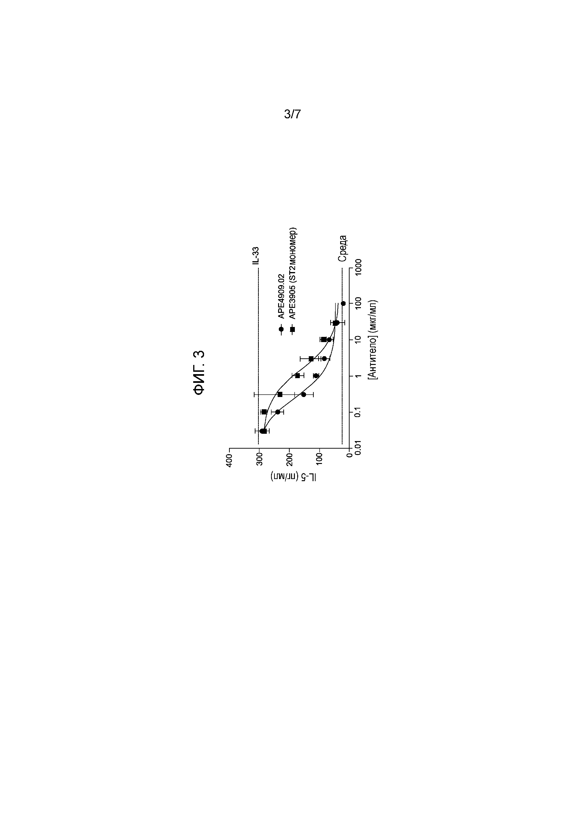 and Milstein, Eur. J. Immunol., 5: 511-519 (1976); Harlow and Lane (eds.), Antibodies: A Laboratory Manual, CSH Press (1988); и Janeway et al. (eds.), Immunobiology, 5th Ed., Garland Publishing, New York, NY (2001)). В некоторых вариантах осуществления человеческое антитело или химерное антитело может быть генерировано с применением трансгенного животного (напр., мыши), при этом один или более эндогенных иммуноглобулиновых генов заменены с одним или более человеческих иммуноглобулиновых генов. Примеры трансгенных мышей, в которых гены эндогенного антитела эффективно заменены с генами человеческого антитела, содержат, но не ограничены ими, Medarex HUMAB-MOUSE™, the Kirin TC MOUSE™ и Kyowa Kirin KM-MOUSE™ (см., напр., Lonberg, Nat. Biotechnol., 23(9): 1117-25 (2005), и Lonberg, Handb. Exp. Pharmacol., 181: 69-97 (2008)). Гуманизированное антитело может быть генерировано с применением любого пригодного способа, известного в данной области (см., напр., An, Z. (ed.), Therapeutic Monoclonal Antibodies: From Bench to Clinic, John Wiley & Sons, Inc., Hoboken, New Jersey (2009)), включая, напр., трансплантацию нечеловеческих CDR в каркас человеческого антитела (см., напр., Kashmiri et al., Methods, 36(1): 25-34 (2005); и Hou et al., J. Biochem., 144(1): 115-120 (2008)). В одном варианте осуществления гуманизированное антитело может быть продуцировано с применением способов, описанных, напр., в публикации заявки на патент США 2011/0287485 A1.Изобретательское антитело Ответ Вывод APE00986 нет ответа в отсутствии ST2 Не связывается с IL-33 APE02718 ответ понижается по мере того как [ST2] возрастает ST2 связывается с таким же/перекрывающимся эпитопом APE03833 ответ понижается по мере того как [ST2] возрастает ST2 связывается с таким же/перекрывающимся эпитопом APE04269 ответ понижается по мере того как [ST2] возрастает ST2 связывается с таким же/перекрывающимся эпитопом APE05492 ответ возрастает по мере того как [ST2] возрастает ST2 связывается с другим эпитопом