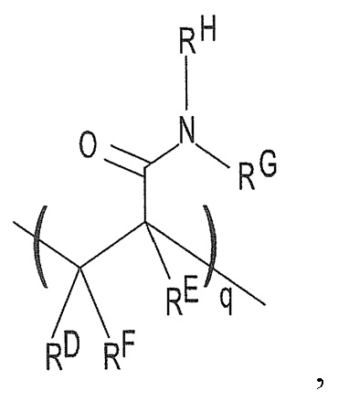 где каждый из RD, RE и RF представляет собой H или алкил C1-C6 алкил, а каждый из RG и RH представляет собой C1-C6 алкил (вместо H, как в случае с акриламидом). В этом примере q может представлять собой целое число в диапазоне от 1 до 100 000. В другом примере N, N-диметилакриламид можно использовать в дополнение к акриламидному звену. В данном примере структура (I) может включать