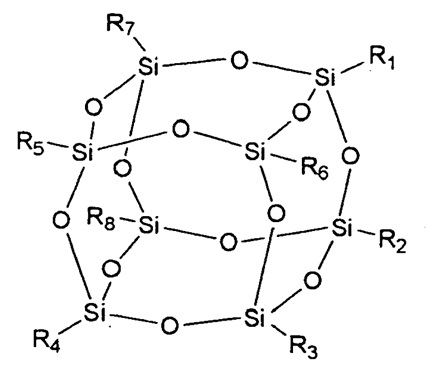 Материал на основе POSS в альтернативном варианте может включать каркасные структуры Т6, Т14 или Т16. Среднее содержание каркаса можно регулировать во время синтеза и/или контролировать с помощью способов очистки, а в описанных в данном документе примерах можно использовать распределение размеров каркаса мономерных единиц.
